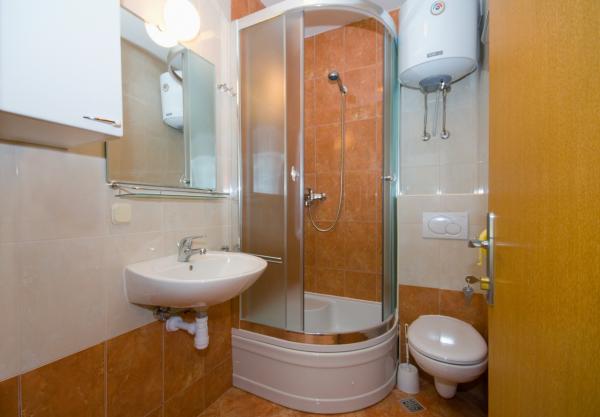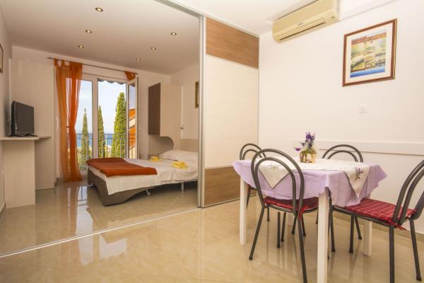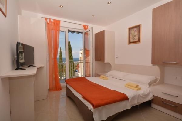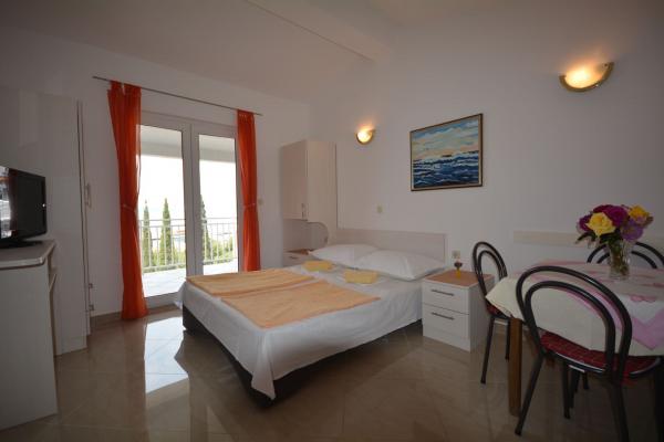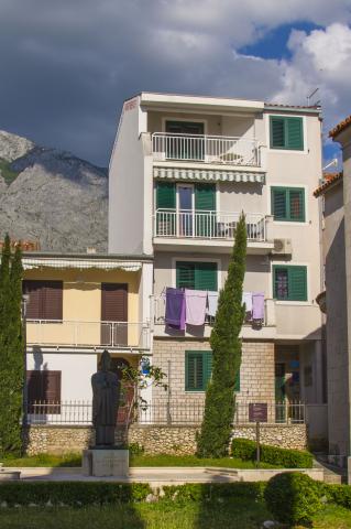 Bienvenus! La maison se trouve dans le centre ville, près dune grande plage de galets blancs. Le balcon donne sur une très belle vue de la plage et dune mer cristalline avec le plus beau des couchers de soleil. Dans cette maison se trouvent 3 appartements pouvant héberger 2 - 4 personnes. APP 1*** possède un lit double avec coin cuisine et coin-repas et un extra lit pour une personne, la climatisation, une salle de bain, la télévision satellite, Internet, un coffre, un frigidaire et un balcon avec vue sur la mer. APP 2** et APP 3*** (chaque) à une chambre pour 2 personnes, ainsi quune pièce comprenant le coucher pour 2 personnes avec coin cuisine et coin-repas. Les appartements ont la climatisation, ainsi quune salle de bains, la télévision satellite, Internet, un coffre et un balcon avec vue sur la mer. Les distance de maison: la plage 40 m, centre 100 m, magasine 100 m, restaurant 50 m, le poste 80 m, Wellness 200 m, marché 300 m, boucher 80 m,