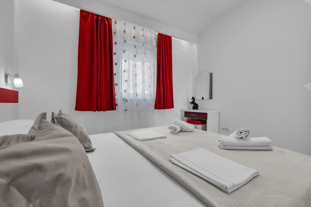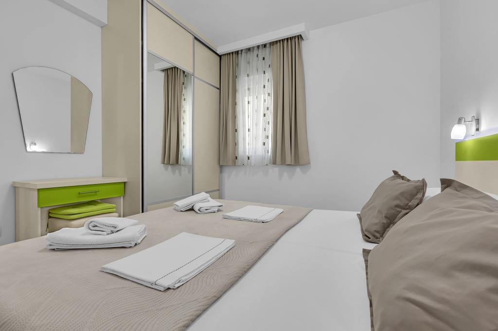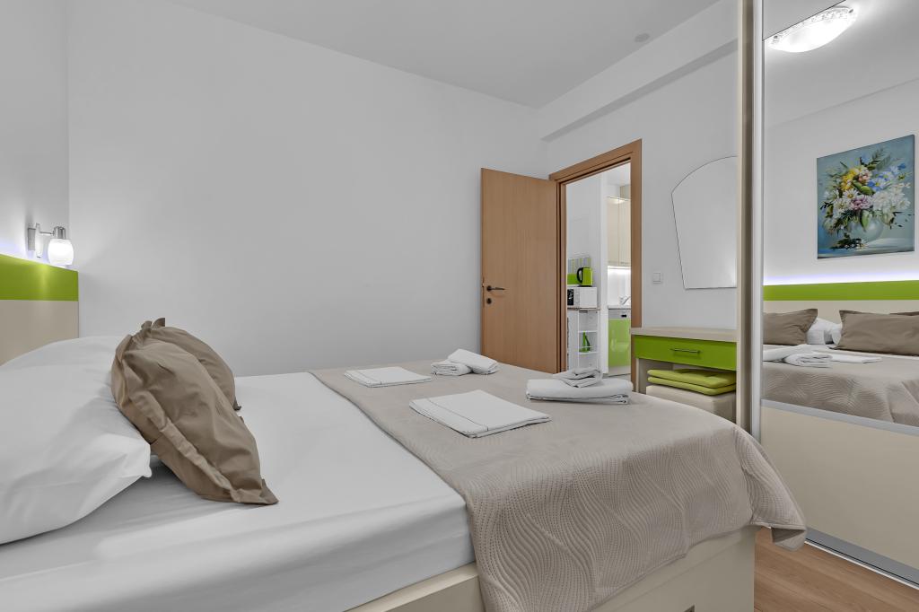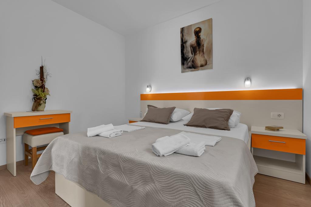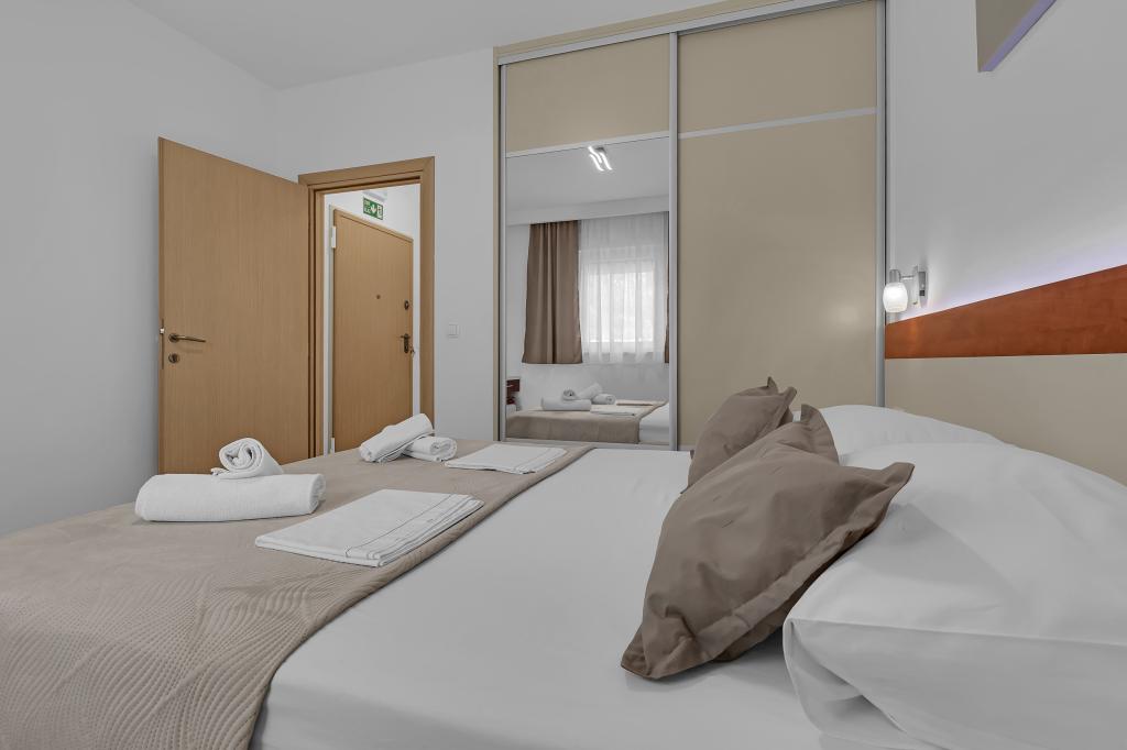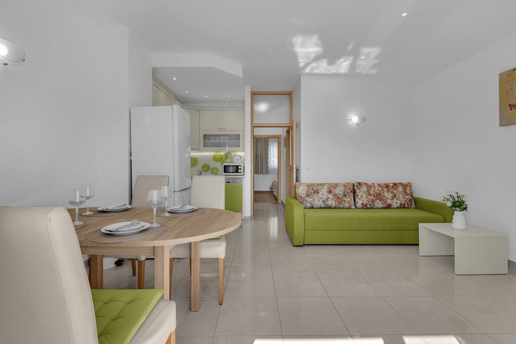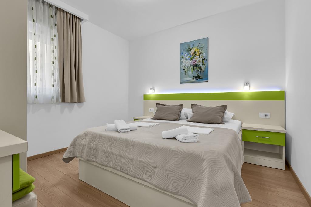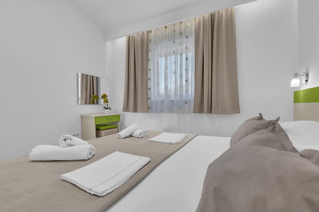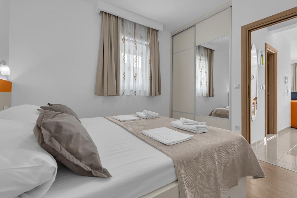 NOUVEAUX APPARTEMENTS! Tous nos appartements sont équipés de façon moderne. Au total, nous avons six (6) appartements à offrir, dont cinq (5) d'une chambre et un duplex de deux chambres. Dans la cour il y a une petite piscine pour les invités, a) Les appartements d'une pièce (2 adultes et 2 enfants) disposent : d'une chambre avec un lit double, d'une grande salle de bain avec une grande douche, d'une cuisine moderne entièrement équipée avec une salle à manger et un salon avec climatisation et un canapé-lit confortable pour deux enfants adultes, ainsi que d'Internet Wi-Fi. Chacun de ces appartements dispose d'un grand balcon de 9 m2 depuis le séjour. b) L'appartement 4 de deux pièces sur deux niveaux (4 adultes et 2 enfants) dispose au premier étage d'une chambre moderne avec un lit double et une salle de bain avec douche et WC, une cuisine complète avec un coin repas et un salon qui dispose d'un canapé-lit confortable pour deux enfants adultes. On accède au deuxième étage par un escalier en colimaçon, avec une grande pièce, une salle de bain et des toilettes séparées. . Les deux étages sont climatisés.