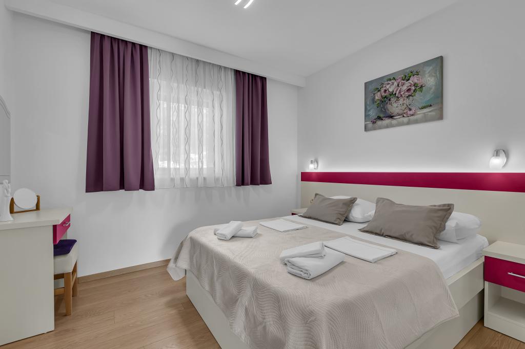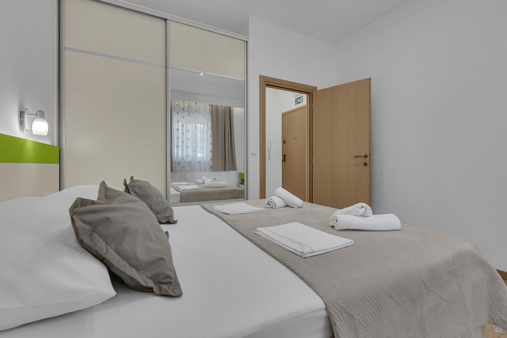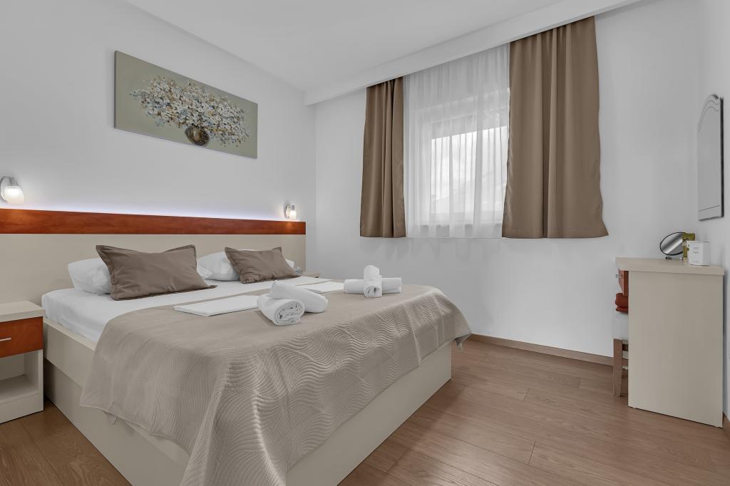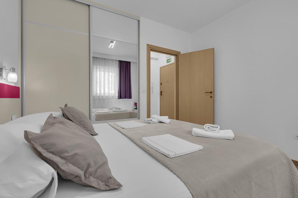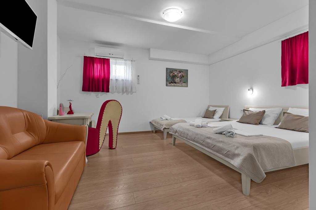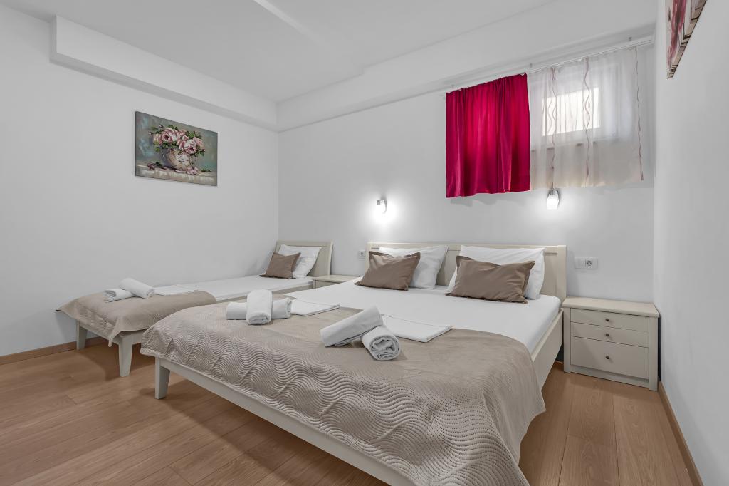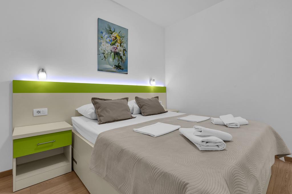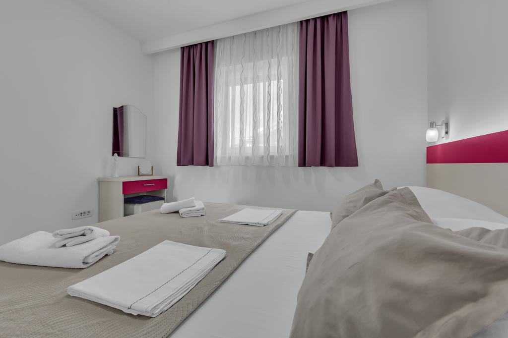 NOUVEAUX APPARTEMENTS! Tous nos appartements sont équipés de façon moderne. Au total, nous avons six (6) appartements à offrir, dont cinq (5) d'une chambre et un duplex de deux chambres. Dans la cour il y a une petite piscine pour les invités, a) Les appartements d'une pièce (2 adultes et 2 enfants) disposent : d'une chambre avec un lit double, d'une grande salle de bain avec une grande douche, d'une cuisine moderne entièrement équipée avec une salle à manger et un salon avec climatisation et un canapé-lit confortable pour deux enfants adultes, ainsi que d'Internet Wi-Fi. Chacun de ces appartements dispose d'un grand balcon de 9 m2 depuis le séjour. b) L'appartement 4 de deux pièces sur deux niveaux (4 adultes et 2 enfants) dispose au premier étage d'une chambre moderne avec un lit double et une salle de bain avec douche et WC, une cuisine complète avec un coin repas et un salon qui dispose d'un canapé-lit confortable pour deux enfants adultes. On accède au deuxième étage par un escalier en colimaçon, avec une grande pièce, une salle de bain et des toilettes séparées. . Les deux étages sont climatisés.