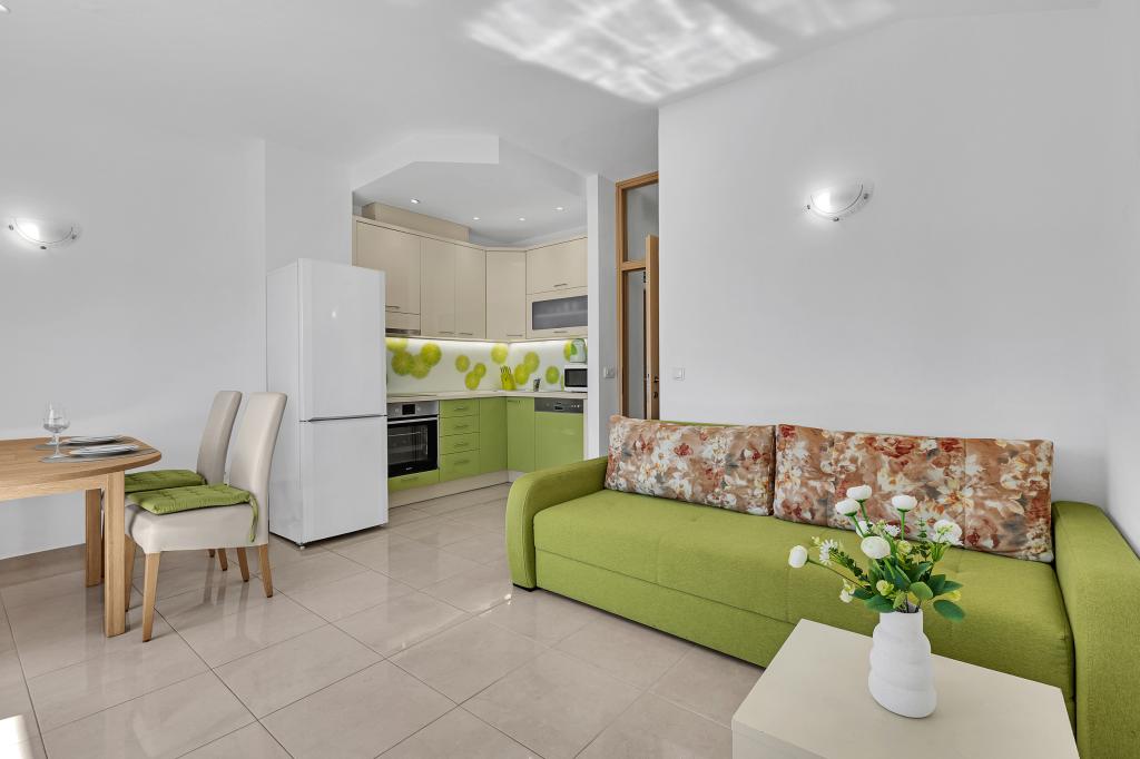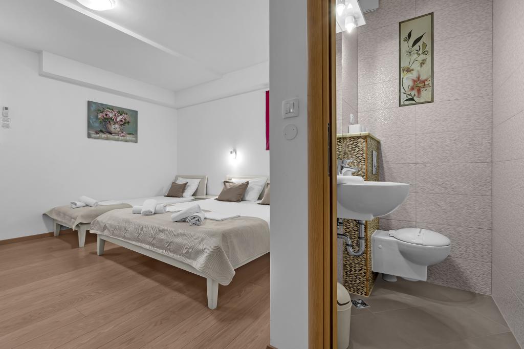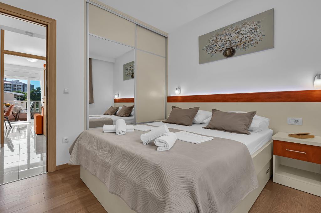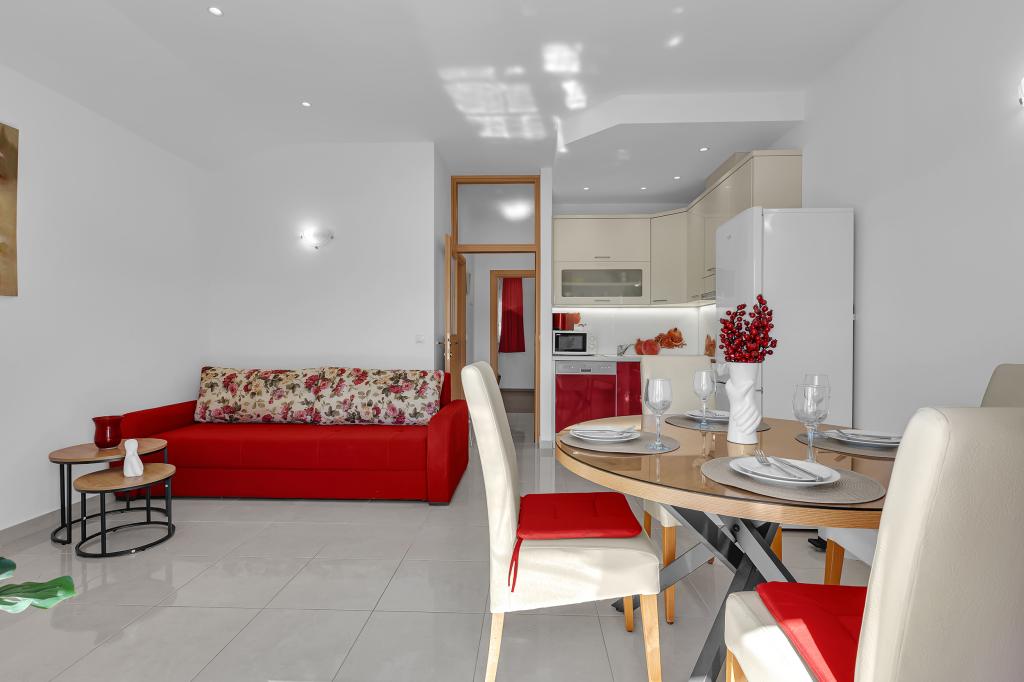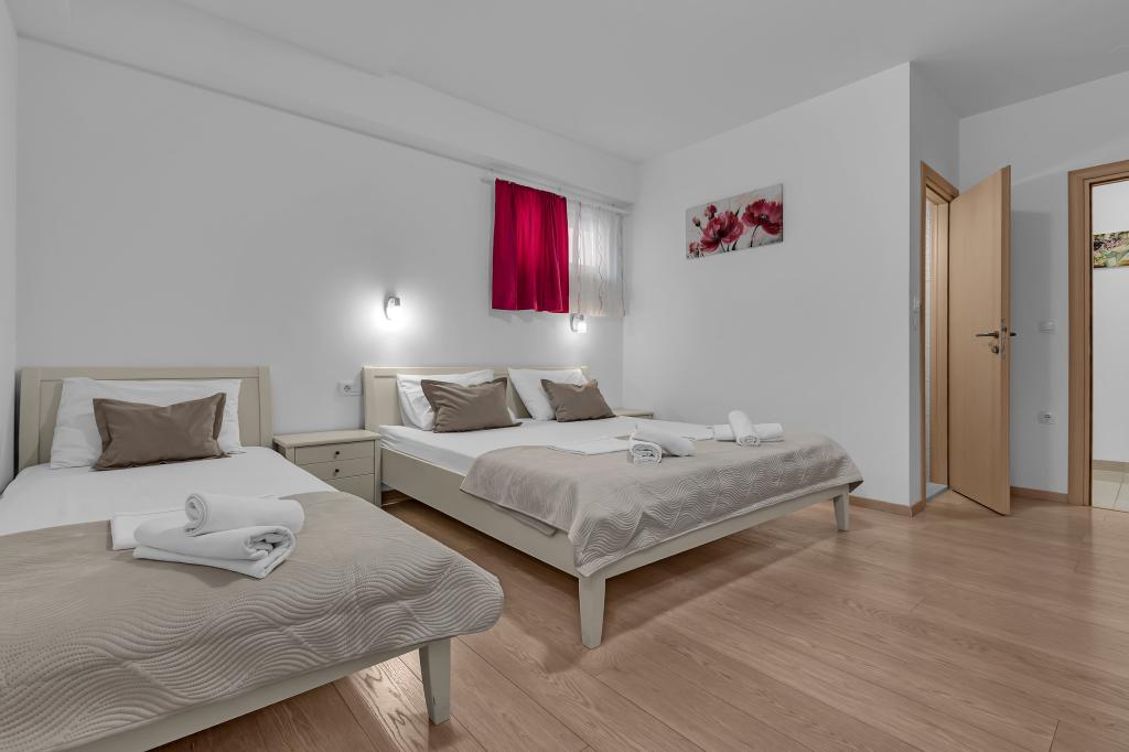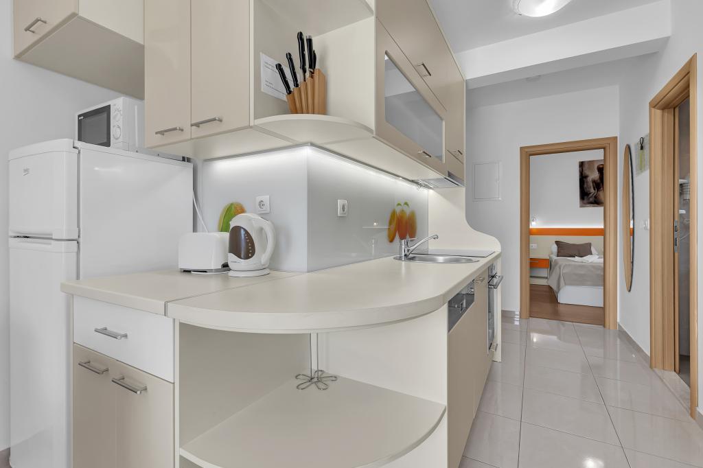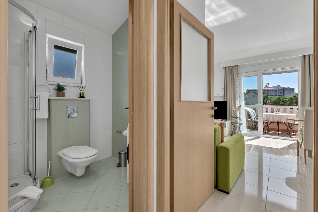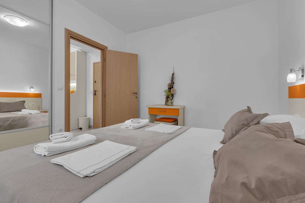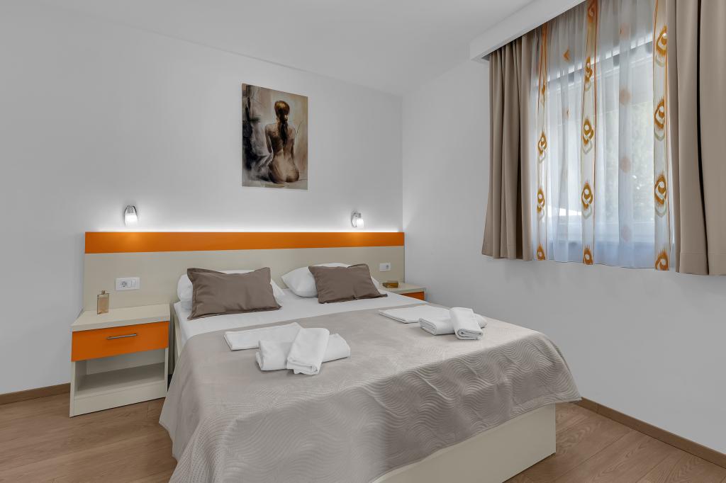 NOUVEAUX APPARTEMENTS! Tous nos appartements sont équipés de façon moderne. Au total, nous avons six (6) appartements à offrir, dont cinq (5) d'une chambre et un duplex de deux chambres. Dans la cour il y a une petite piscine pour les invités, a) Les appartements d'une pièce (2 adultes et 2 enfants) disposent : d'une chambre avec un lit double, d'une grande salle de bain avec une grande douche, d'une cuisine moderne entièrement équipée avec une salle à manger et un salon avec climatisation et un canapé-lit confortable pour deux enfants adultes, ainsi que d'Internet Wi-Fi. Chacun de ces appartements dispose d'un grand balcon de 9 m2 depuis le séjour. b) L'appartement 4 de deux pièces sur deux niveaux (4 adultes et 2 enfants) dispose au premier étage d'une chambre moderne avec un lit double et une salle de bain avec douche et WC, une cuisine complète avec un coin repas et un salon qui dispose d'un canapé-lit confortable pour deux enfants adultes. On accède au deuxième étage par un escalier en colimaçon, avec une grande pièce, une salle de bain et des toilettes séparées. . Les deux étages sont climatisés.