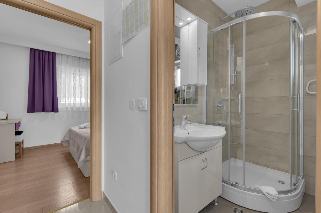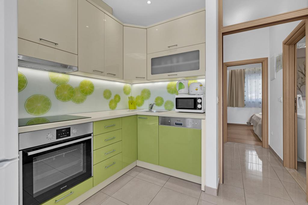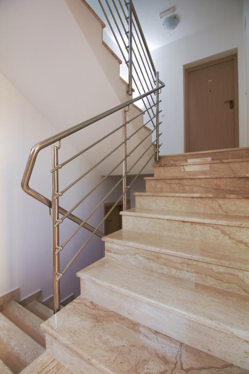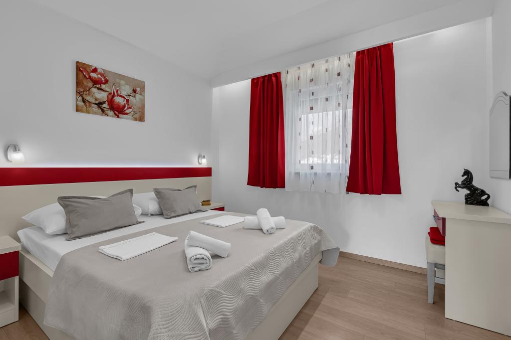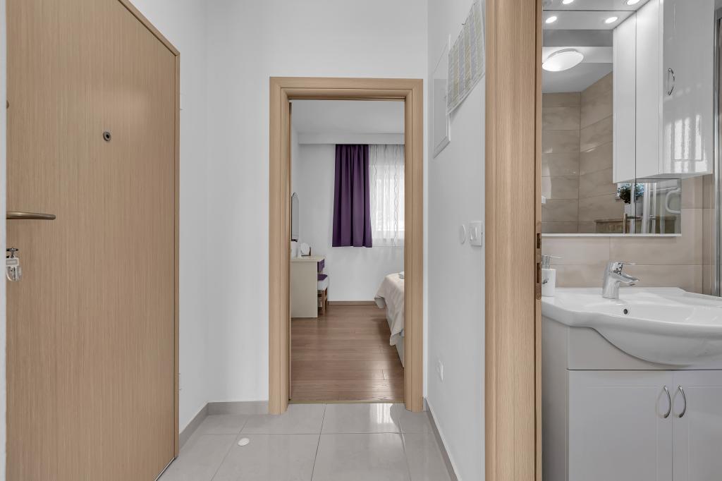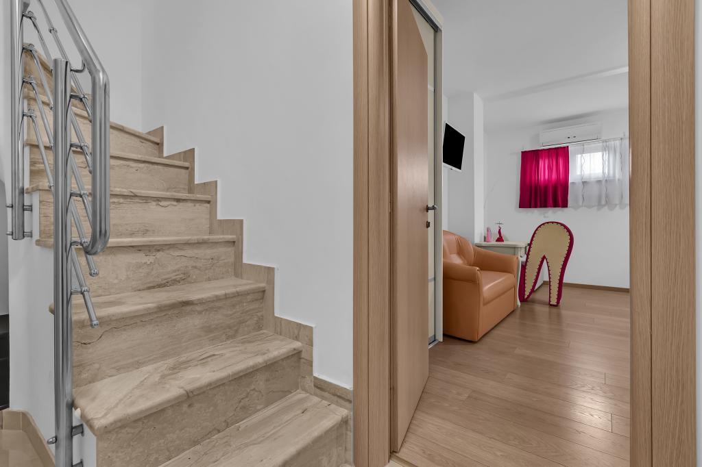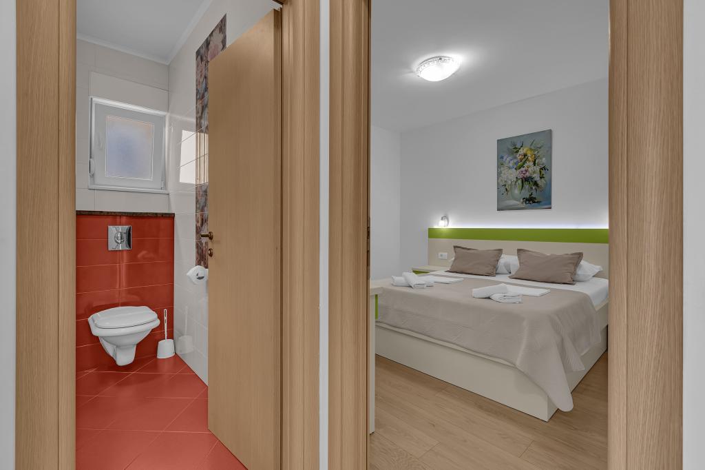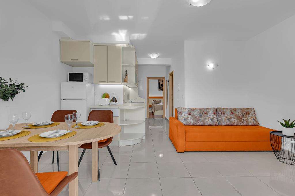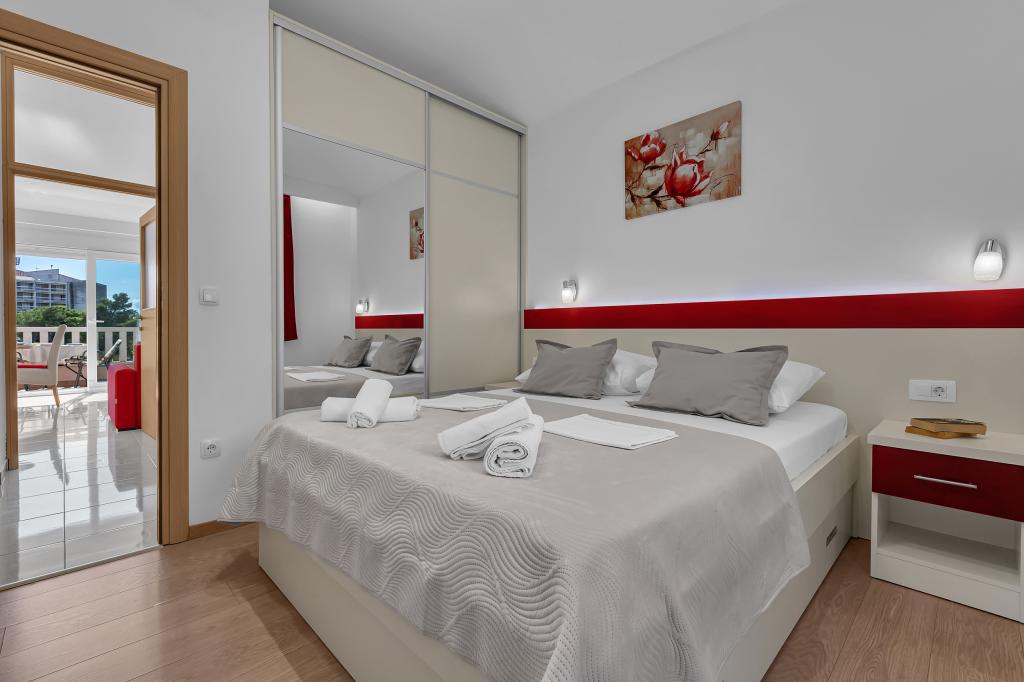 NOUVEAUX APPARTEMENTS! Tous nos appartements sont équipés de façon moderne. Au total, nous avons six (6) appartements à offrir, dont cinq (5) d'une chambre et un duplex de deux chambres. Dans la cour il y a une petite piscine pour les invités, a) Les appartements d'une pièce (2 adultes et 2 enfants) disposent : d'une chambre avec un lit double, d'une grande salle de bain avec une grande douche, d'une cuisine moderne entièrement équipée avec une salle à manger et un salon avec climatisation et un canapé-lit confortable pour deux enfants adultes, ainsi que d'Internet Wi-Fi. Chacun de ces appartements dispose d'un grand balcon de 9 m2 depuis le séjour. b) L'appartement 4 de deux pièces sur deux niveaux (4 adultes et 2 enfants) dispose au premier étage d'une chambre moderne avec un lit double et une salle de bain avec douche et WC, une cuisine complète avec un coin repas et un salon qui dispose d'un canapé-lit confortable pour deux enfants adultes. On accède au deuxième étage par un escalier en colimaçon, avec une grande pièce, une salle de bain et des toilettes séparées. . Les deux étages sont climatisés.