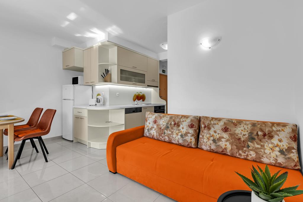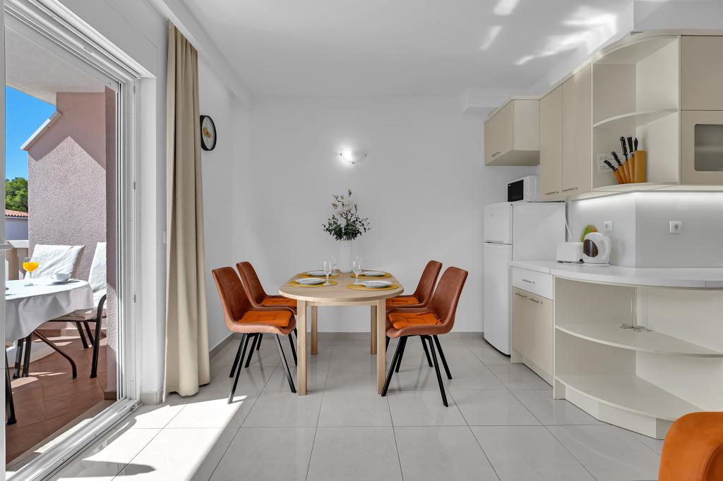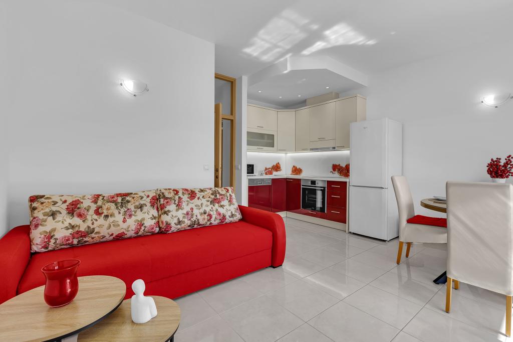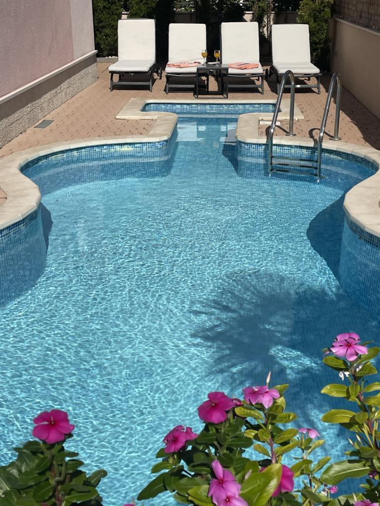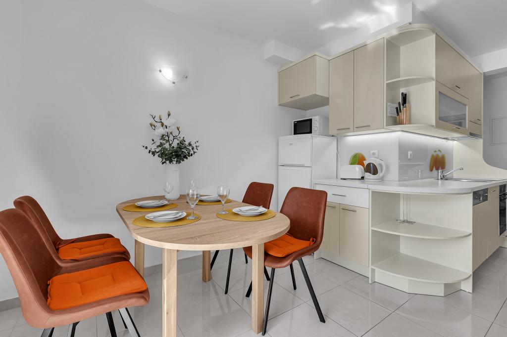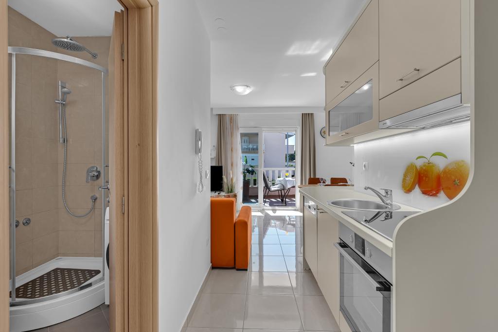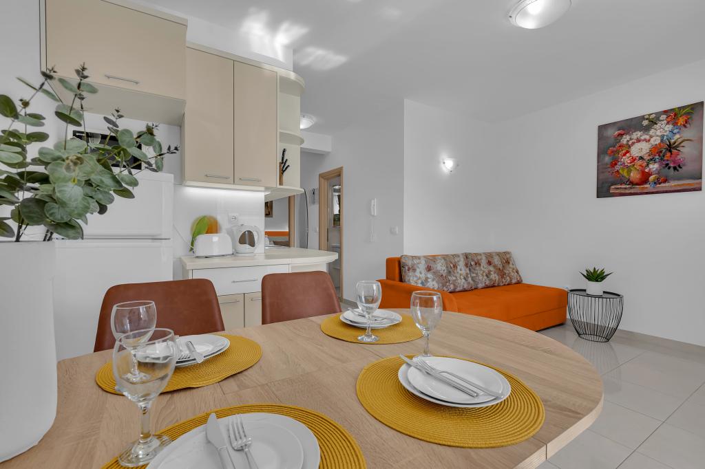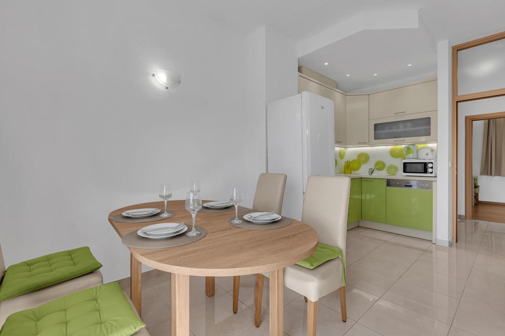 NOUVEAUX APPARTEMENTS! Tous nos appartements sont équipés de façon moderne. Au total, nous avons six (6) appartements à offrir, dont cinq (5) d'une chambre et un duplex de deux chambres. Dans la cour il y a une petite piscine pour les invités, a) Les appartements d'une pièce (2 adultes et 2 enfants) disposent : d'une chambre avec un lit double, d'une grande salle de bain avec une grande douche, d'une cuisine moderne entièrement équipée avec une salle à manger et un salon avec climatisation et un canapé-lit confortable pour deux enfants adultes, ainsi que d'Internet Wi-Fi. Chacun de ces appartements dispose d'un grand balcon de 9 m2 depuis le séjour. b) L'appartement 4 de deux pièces sur deux niveaux (4 adultes et 2 enfants) dispose au premier étage d'une chambre moderne avec un lit double et une salle de bain avec douche et WC, une cuisine complète avec un coin repas et un salon qui dispose d'un canapé-lit confortable pour deux enfants adultes. On accède au deuxième étage par un escalier en colimaçon, avec une grande pièce, une salle de bain et des toilettes séparées. . Les deux étages sont climatisés.