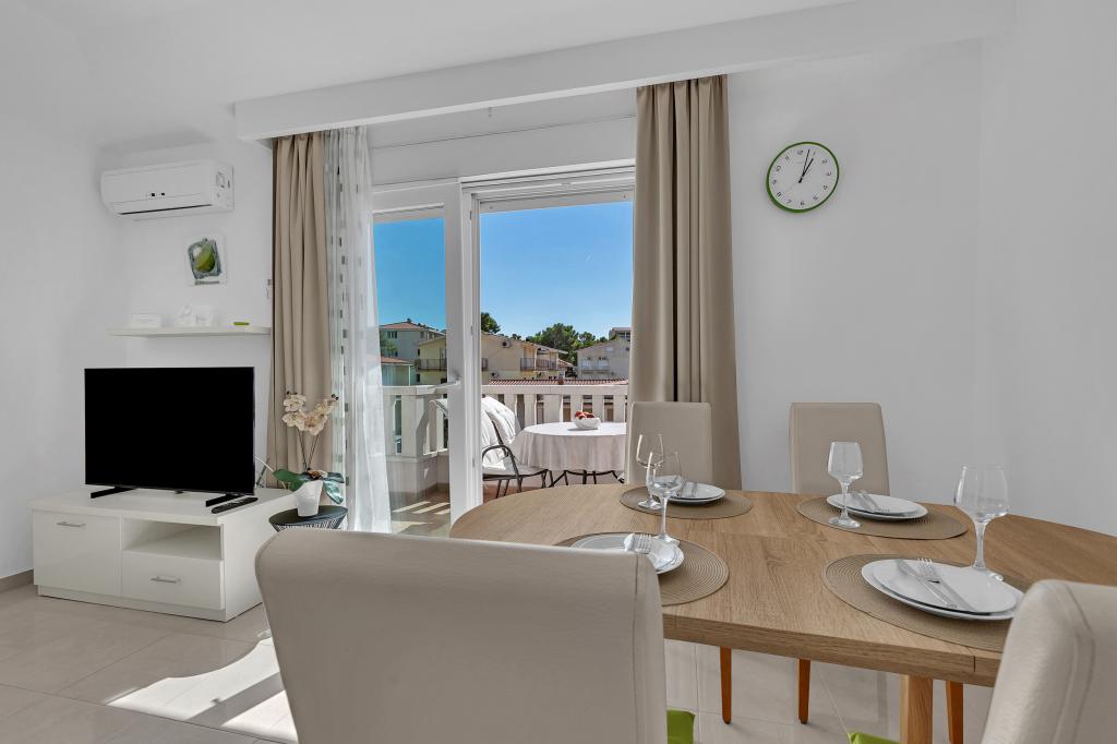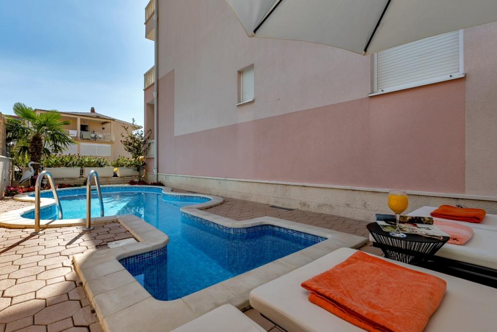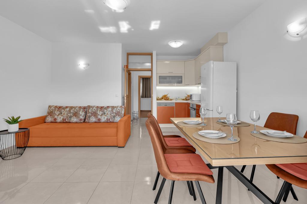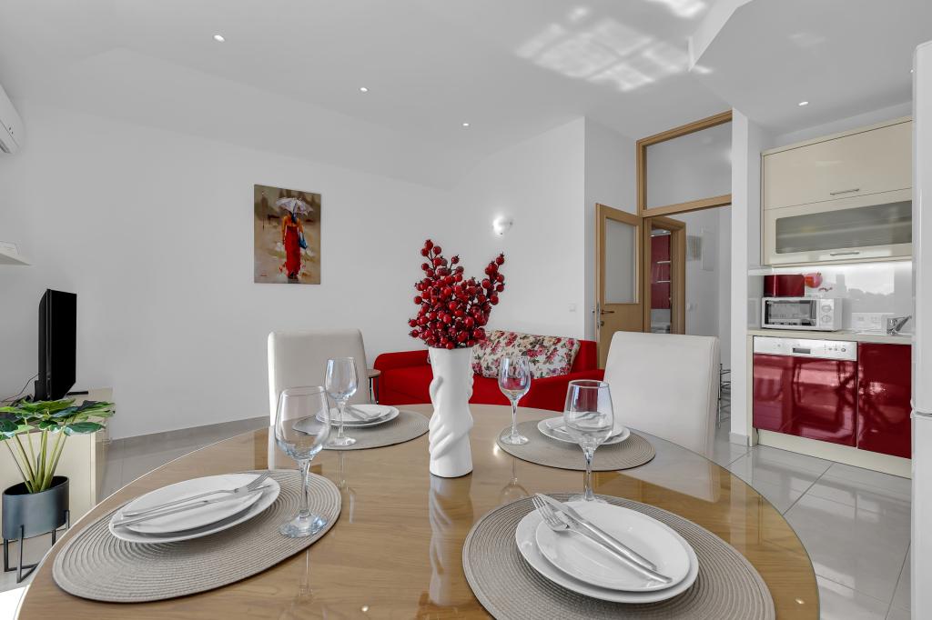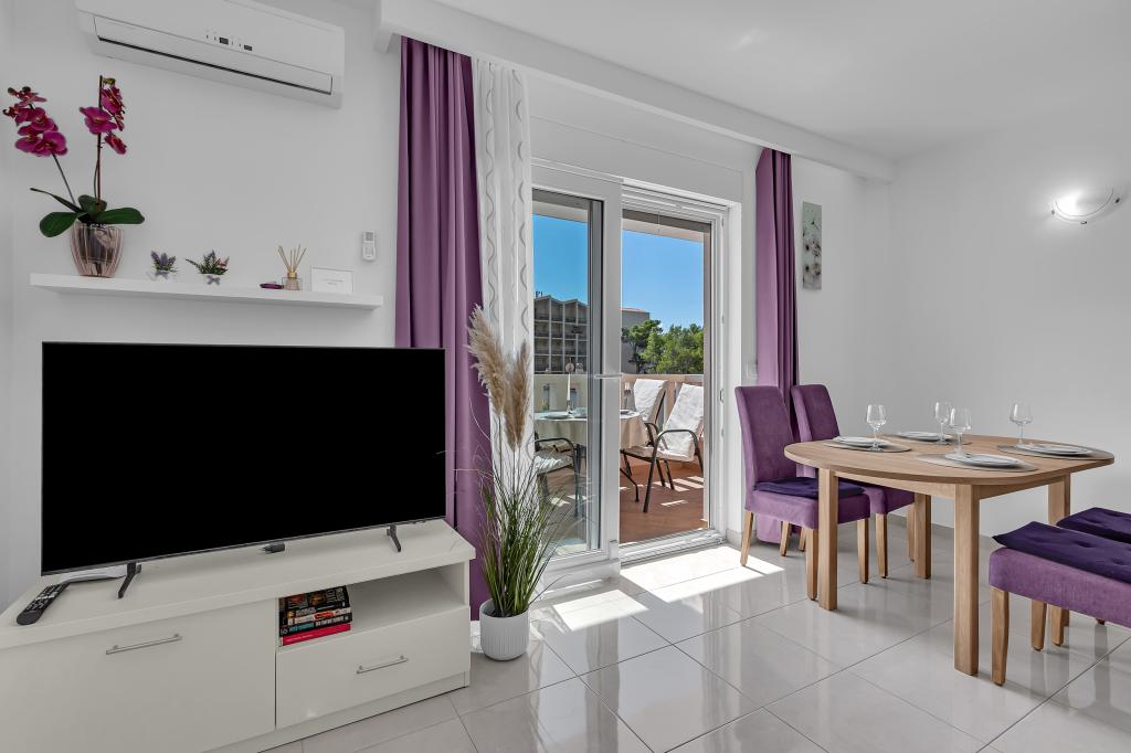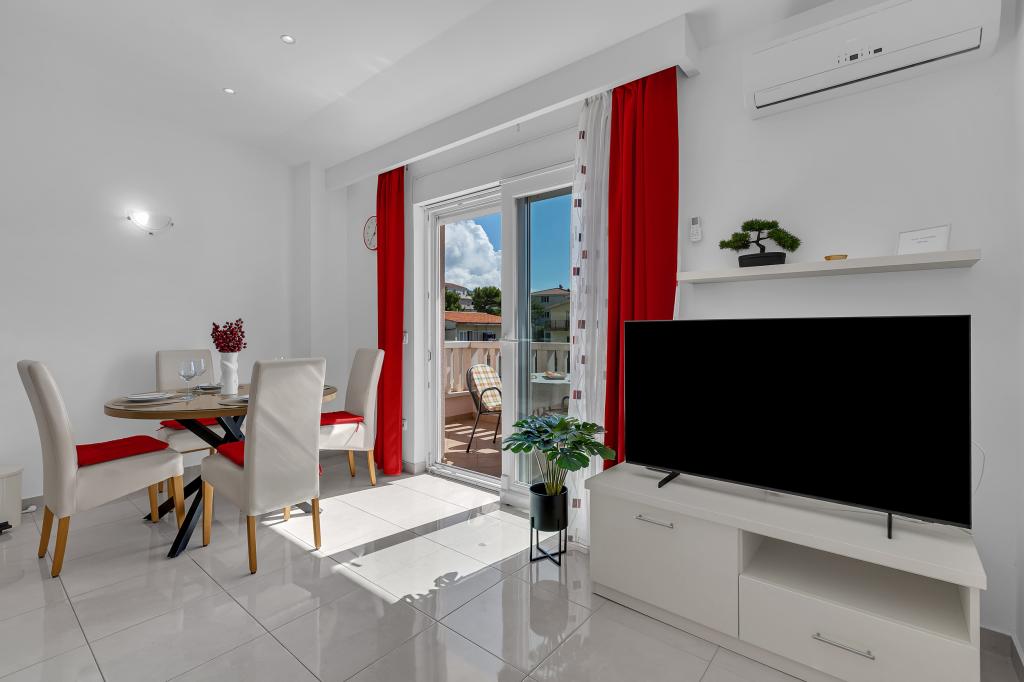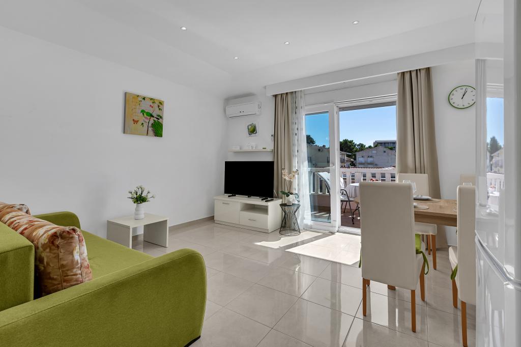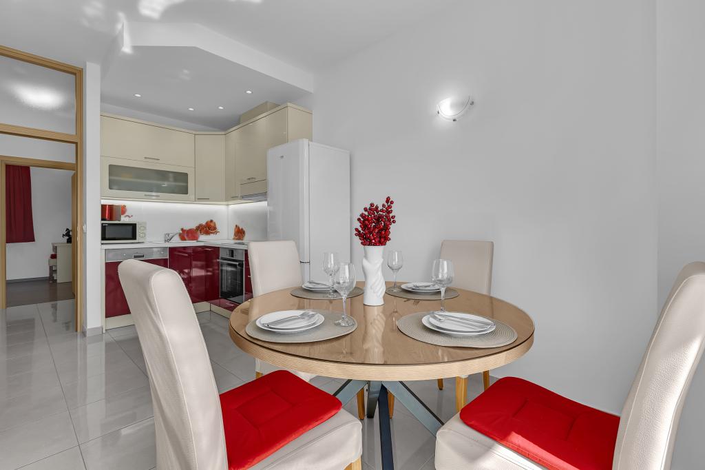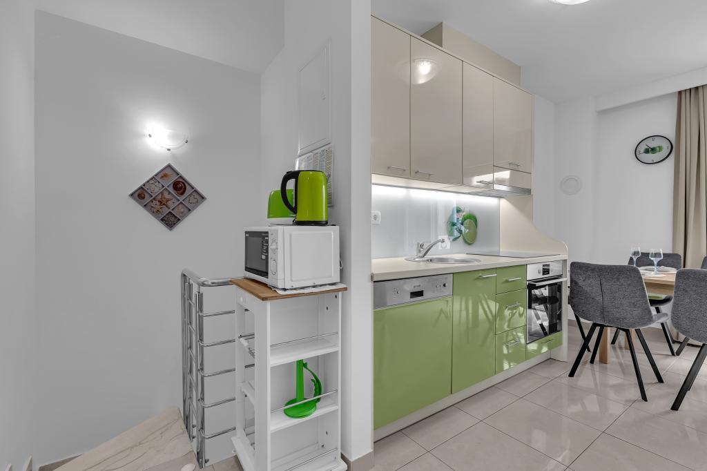 NOUVEAUX APPARTEMENTS! Tous nos appartements sont équipés de façon moderne. Au total, nous avons six (6) appartements à offrir, dont cinq (5) d'une chambre et un duplex de deux chambres. Dans la cour il y a une petite piscine pour les invités, a) Les appartements d'une pièce (2 adultes et 2 enfants) disposent : d'une chambre avec un lit double, d'une grande salle de bain avec une grande douche, d'une cuisine moderne entièrement équipée avec une salle à manger et un salon avec climatisation et un canapé-lit confortable pour deux enfants adultes, ainsi que d'Internet Wi-Fi. Chacun de ces appartements dispose d'un grand balcon de 9 m2 depuis le séjour. b) L'appartement 4 de deux pièces sur deux niveaux (4 adultes et 2 enfants) dispose au premier étage d'une chambre moderne avec un lit double et une salle de bain avec douche et WC, une cuisine complète avec un coin repas et un salon qui dispose d'un canapé-lit confortable pour deux enfants adultes. On accède au deuxième étage par un escalier en colimaçon, avec une grande pièce, une salle de bain et des toilettes séparées. . Les deux étages sont climatisés.