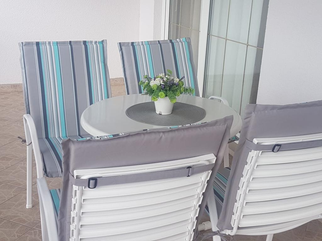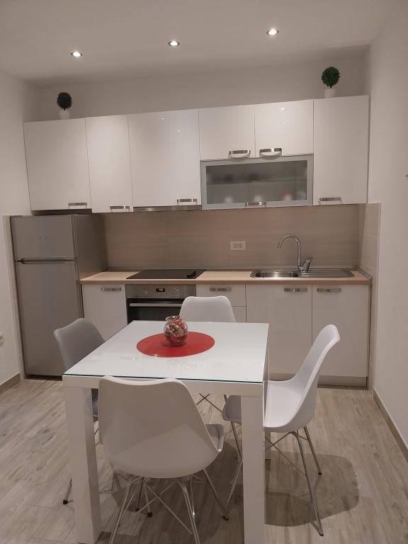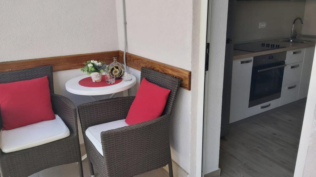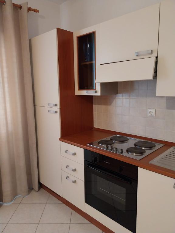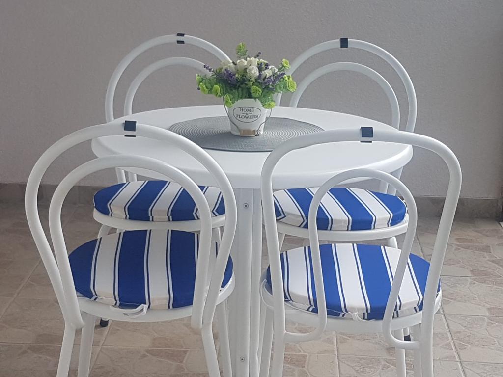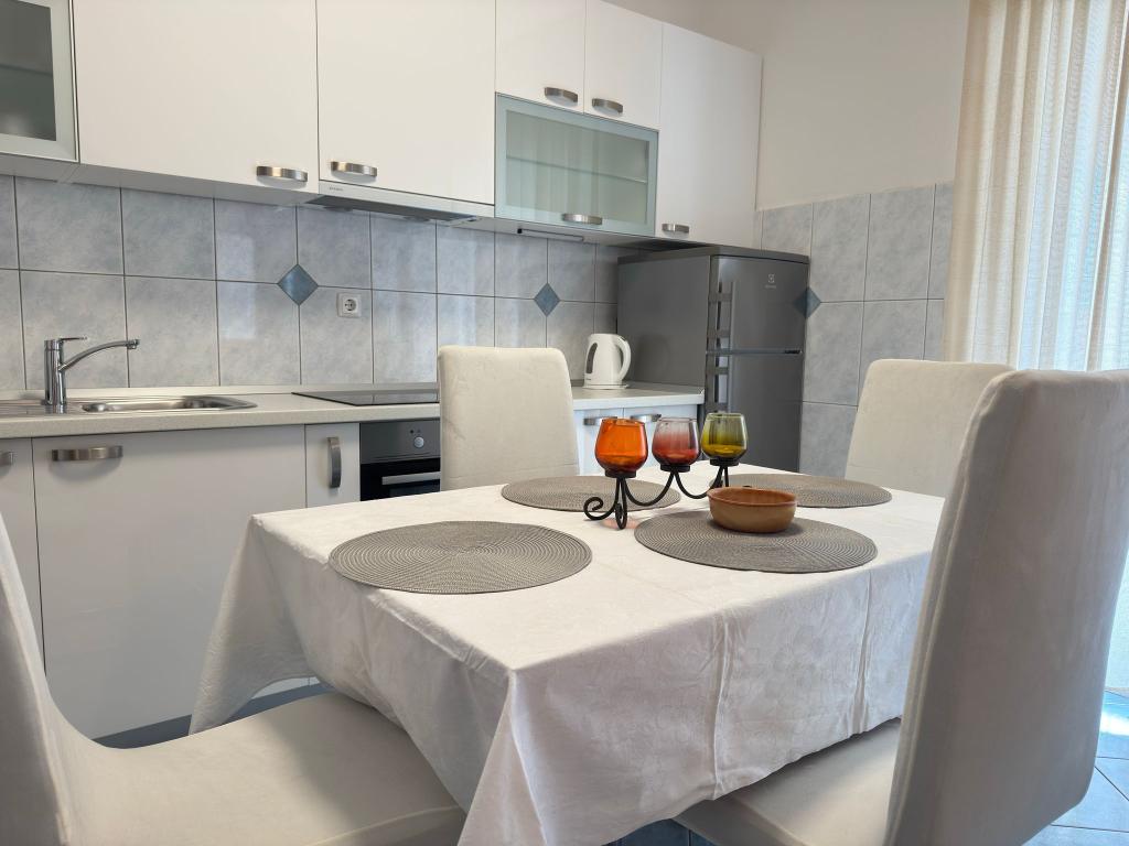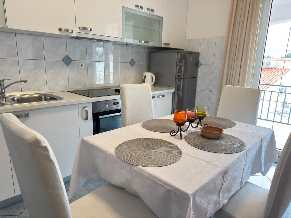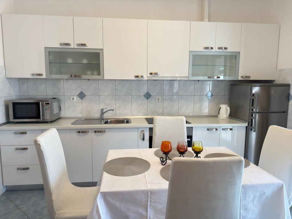 Très bel appartement avec vue sur la mer. Grande cuisine avec équipement. Grande terrasse. Proche du port et de la plage, à 5 minutes à pied. A proximité il y a un médecin, une boulangerie et un magasin. Propriétaires très gentils et serviables. Ils sont venus nous voir à 5 heures du matin pour nous dire au revoir. L'appartement dispose de places de parking. je recommande