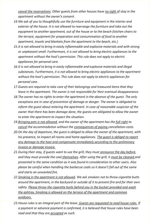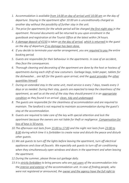 Taxe de sejour est inclus dans le prix.Acompte non remboursable : L'acompte de 30 % garantit la réservation ; non remboursable en cas de non-présentation. Départ anticipé (client) : Si le client écourte son séjour, le montant total reste dû. Dommages : Caution de 150 € pour dégâts éventuels. Si les frais dépassent ce montant, le client règle la différence. Violation des règles : Le propriétaire peut annuler le séjour. Le remboursement des jours restants s'applique dès le lendemain.