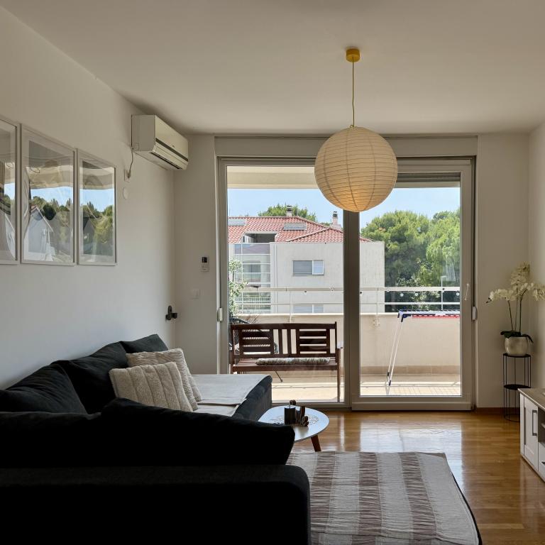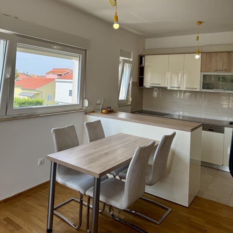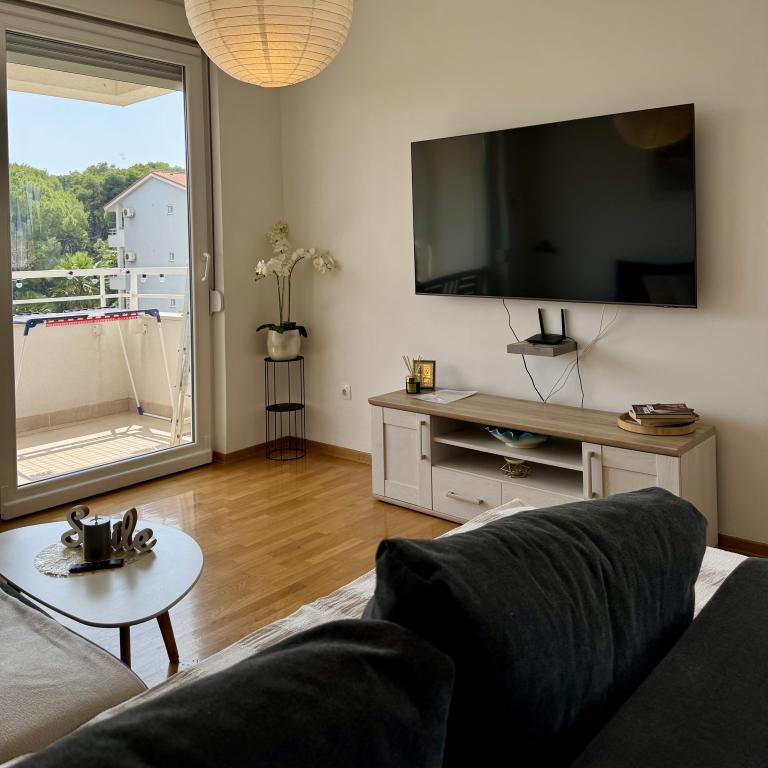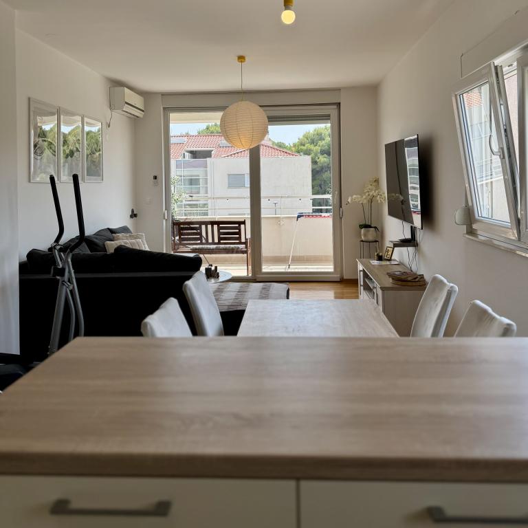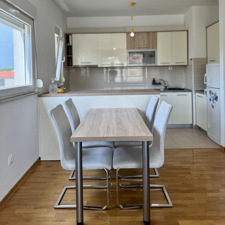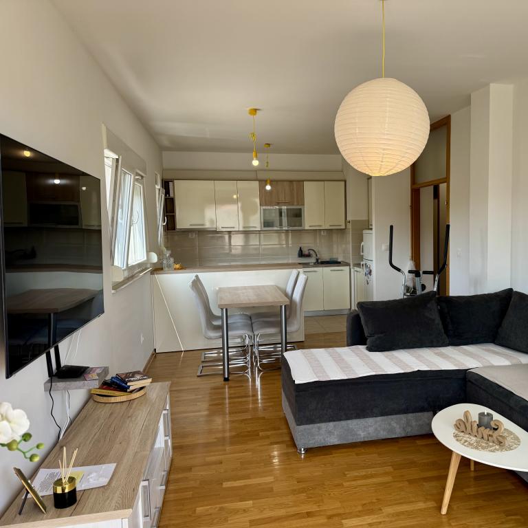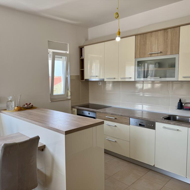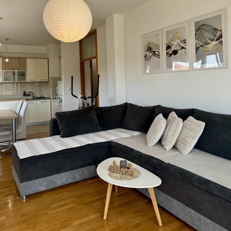 Le bel appartement comprend 2 chambres spacieuses, une cuisine entièrement équipée, un salon confortable, une salle de bain moderne et un balcon spacieux pour 4 personnes. Situé au deuxième étage, à seulement 500m de la côte, cet appartement de luxe offre confort et élégance. Cet appartement moderne situé au deuxième étage a tout ce dont vous avez besoin pour un séjour confortable : un design élégant, un mobilier de qualité et une cuisine entièrement équipée. Profitez d'être près de la mer, et après la plage, détendez-vous sur le balcon spacieux avec une belle vue...