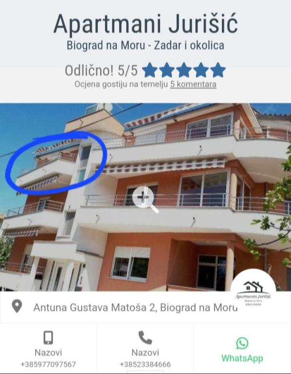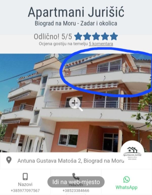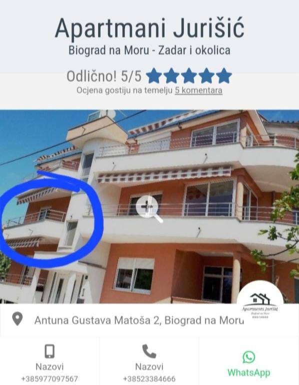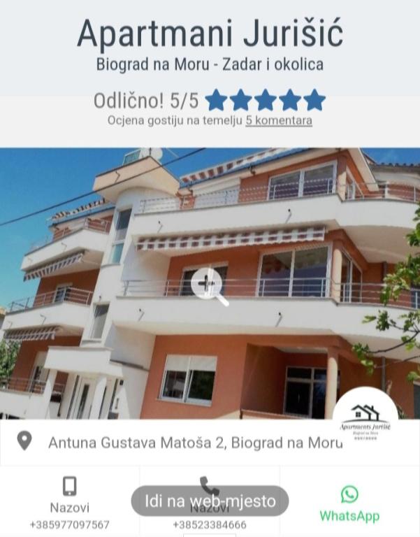 Nous sommes la famille Jurišić, qui a une longue tradition touristique, plus de 40 ans. Dans un quartier calme du centre-ville de Biograd na Moru (à proximité de l'hôtel "Ilirija"), se trouvent nos deux maisons, situées à seulement 50 mètres de la mer, de la promenade, du front de mer et d'autres commodités... restaurants, magasins, poste... Tous les appartements disposent d'un hébergement climatisé (il y a la climatisation dans chaque chambre et salon), il y a des moustiquaires aux fenêtres, et chaque appartement dispose de son propre balcon, d'un parking sécurisé, d'une connexion Wi-Fi et d'un barbecue à disposition. Les prix (par dates) sont indiqués dans la liste de prix de chaque appartement (lit supplémentaire - canapé pour 2 personnes/enfants supplémentaires est facturé +10 euros/nuit).