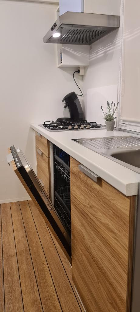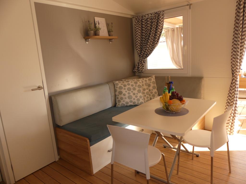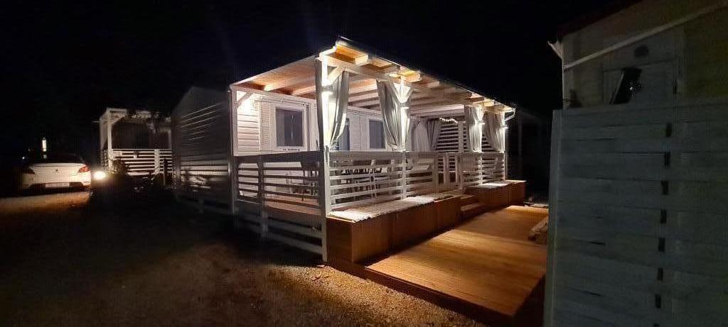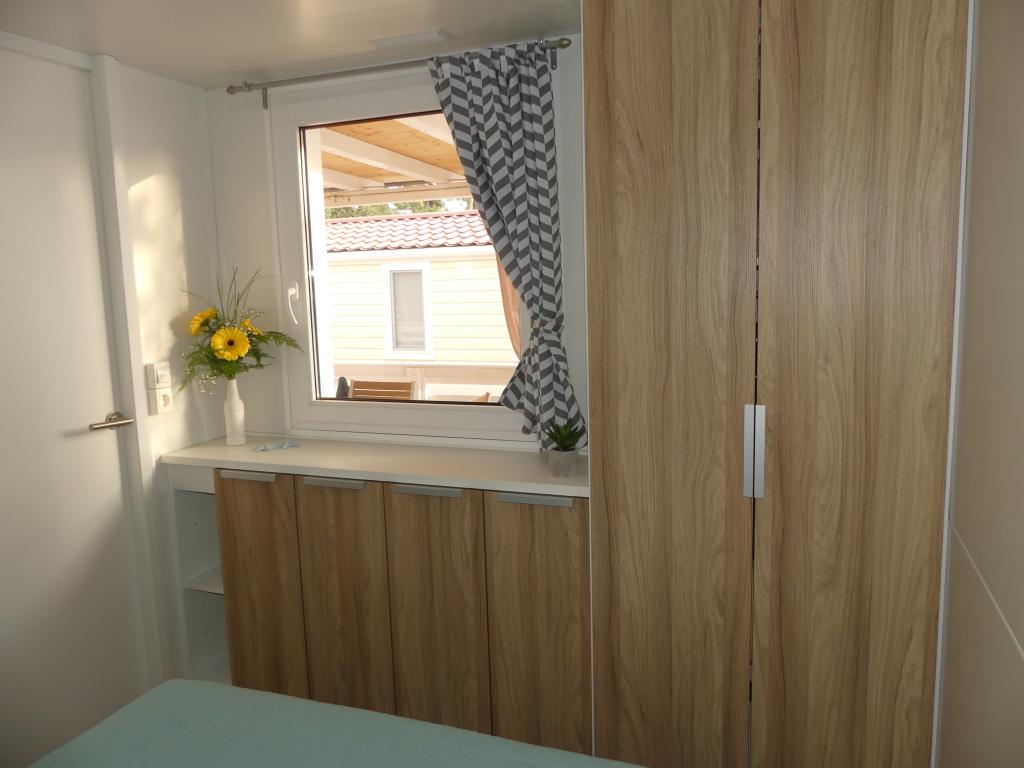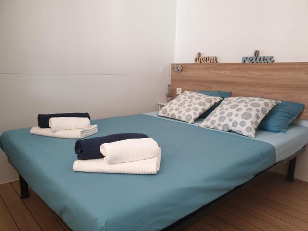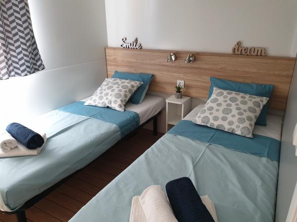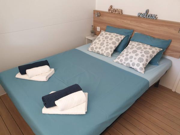 Blue Wave est un mobil-home neuf, moderne et entièrement équipé avec deux chambres (une avec un lit double et l'autre avec deux lits simples), placards, deux salles de bain avec douche, un séjour avec un lit gigogne supplémentaire (135x180cm), une cuisine entièrement équipée avec climatisation et une grande terrasse. La terrasse est équipée d'une table à manger, d'un barbecue électrique et de deux chaises longues confortables. Un accès Internet sans fil est disponible gratuitement dans tout l'établissement. Blue Wave est situé dans la paisible forêt de pins du camping Soline à Biograd na moru. L'établissement se trouve à 2-3 minutes à pied de la plage, du café-bar et du restaurant. Le camp dispose de machines à laver et de sèche-linge, d'un distributeur automatique de billets, d'une boutique, d'une boulangerie, d'une aire de jeux pour enfants et de tout ce dont vous avez besoin pour un séjour agréable ! À proximité immédiate du camp, à environ 10 minutes à pied le long de la promenade récemment rénovée le long de la mer, se trouve le centre de Biograd, qui dispose de diverses installations, ainsi que de la marina de Kornati. Le parc d'attractions et aquatique Dalmaland n'est pas loin non plus pour vous offrir de grands moments de plaisir.