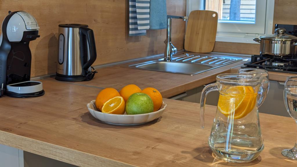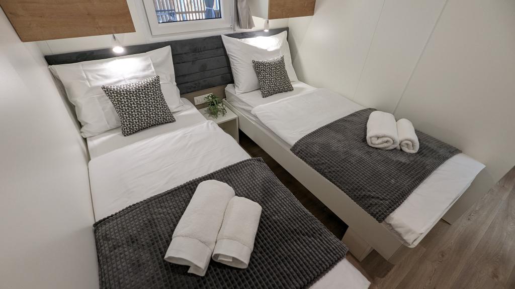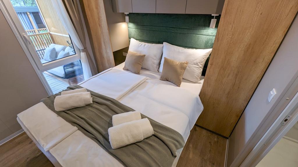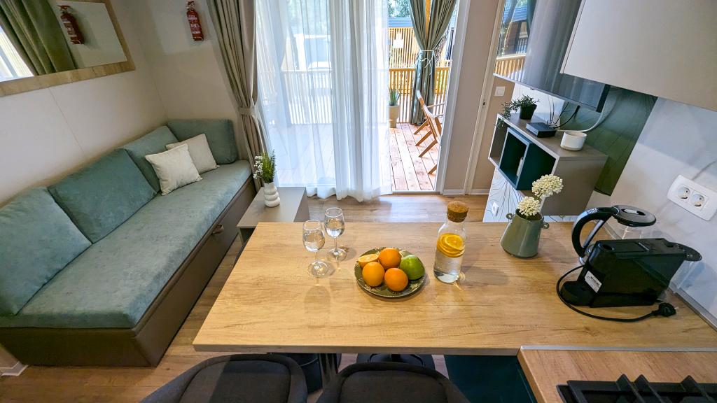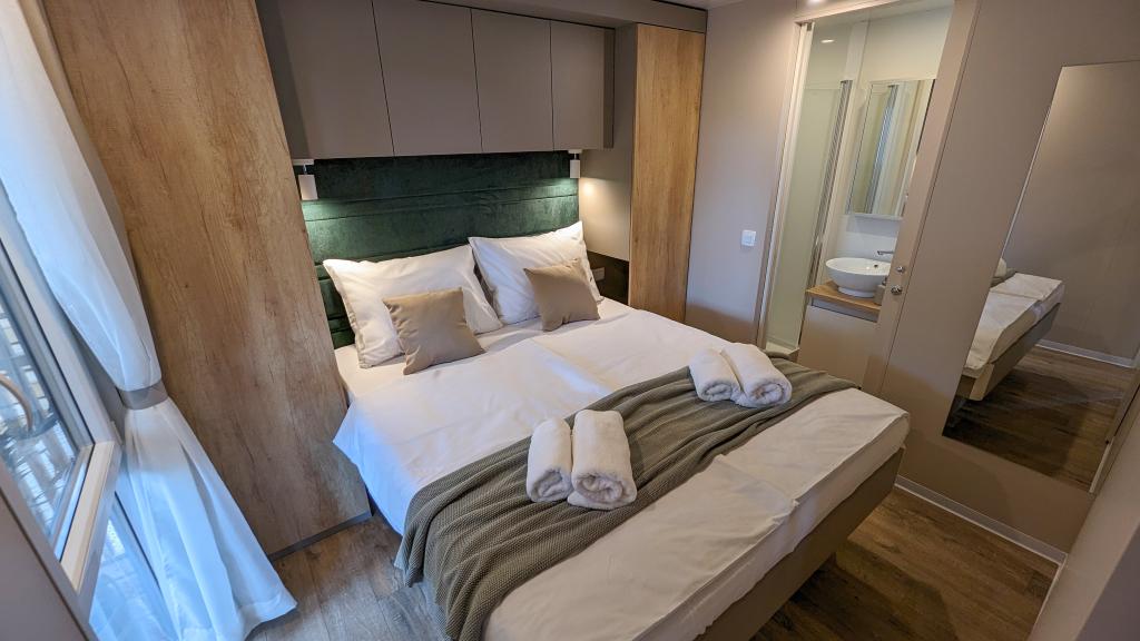 Profitez de la nature et du confort : les mobil-homes Jaki au camping Soline, Biograd na Moru. Situés dans un quartier calme du camping 4 étoiles, entourés de forêts de pins, nos mobil-homes équipés de façon moderne sont idéaux pour accueillir jusqu'à 6 personnes. Profitez de la proximité de la plage (2 à 5 minutes à pied), des commerces et restaurants, et de la promenade menant au centre-ville (15 minutes). Ces gîtes offrent 2 chambres et 2 salles de bain, un séjour, une grande terrasse avec table à manger et coin salon, et une cuisine entièrement équipée - lave-vaisselle, micro-ondes, cafetière, grille-pain, mixeur, barbecue extérieur. La maison comprend également une connexion Wi-Fi gratuite, un parking gratuit juste à côté de la maison, une Smart TV, la climatisation, des serviettes et du linge de lit. Le camp offre de nombreuses installations pour toute la famille : de belles plages de sable et de galets qui s'étendent jusqu'au centre-ville, un restaurant avec des spécialités méditerranéennes, une aire de jeux pour enfants, des activités sportives et la location de vélos. Dalmaland, le plus grand parc aquatique à thème de Croatie, se trouve à 15 minutes en voiture.