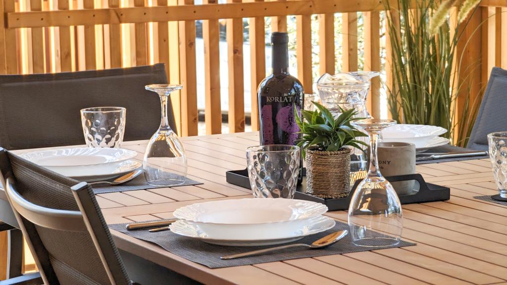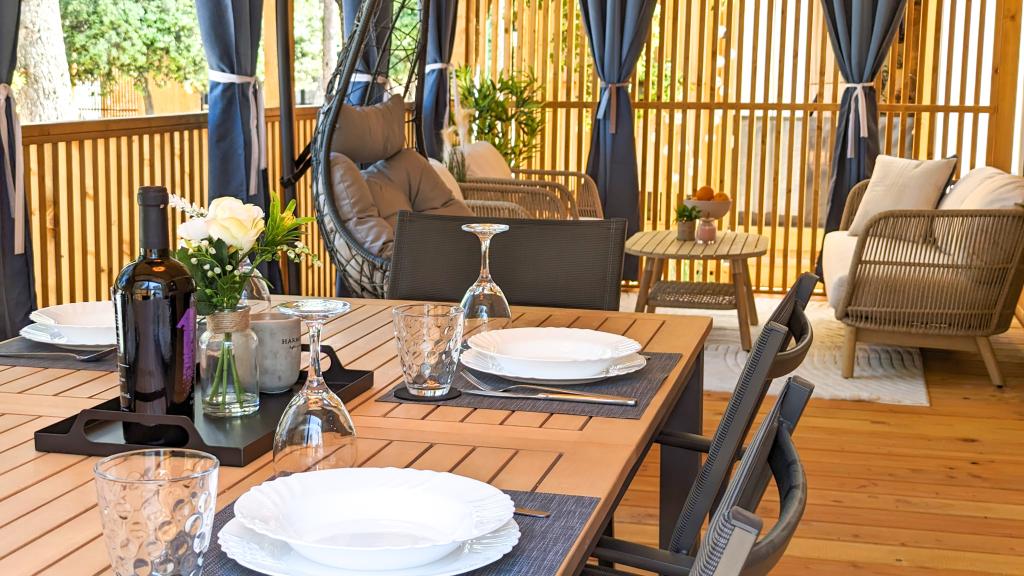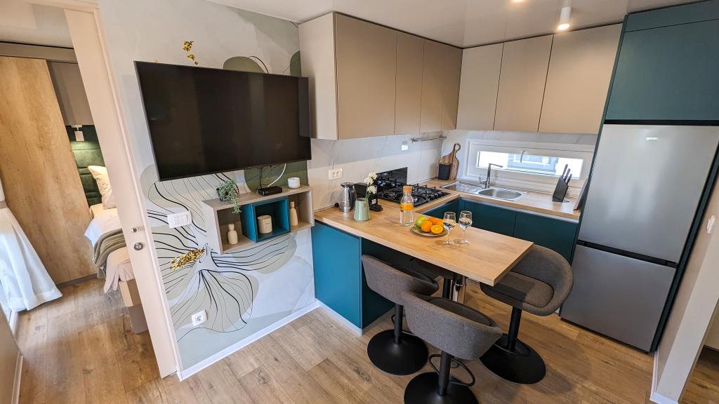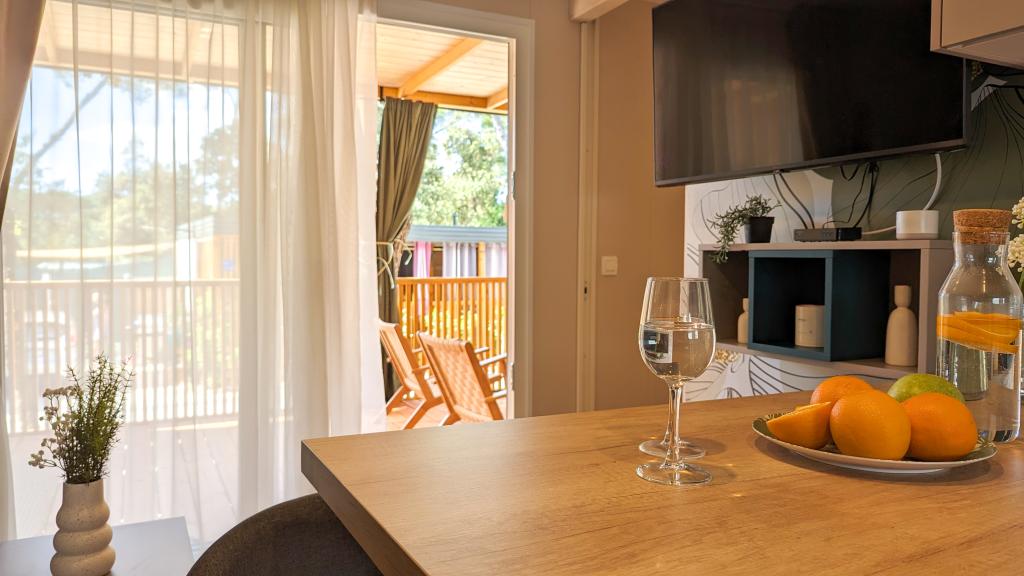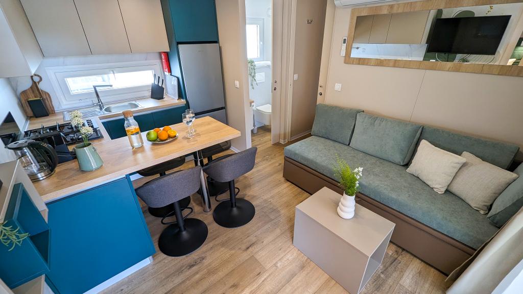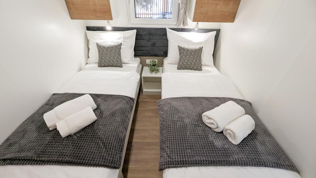 Profitez de la nature et du confort : les mobil-homes Jaki au camping Soline, Biograd na Moru. Situés dans un quartier calme du camping 4 étoiles, entourés de forêts de pins, nos mobil-homes équipés de façon moderne sont idéaux pour accueillir jusqu'à 6 personnes. Profitez de la proximité de la plage (2 à 5 minutes à pied), des commerces et restaurants, et de la promenade menant au centre-ville (15 minutes). Ces gîtes offrent 2 chambres et 2 salles de bain, un séjour, une grande terrasse avec table à manger et coin salon, et une cuisine entièrement équipée - lave-vaisselle, micro-ondes, cafetière, grille-pain, mixeur, barbecue extérieur. La maison comprend également une connexion Wi-Fi gratuite, un parking gratuit juste à côté de la maison, une Smart TV, la climatisation, des serviettes et du linge de lit. Le camp offre de nombreuses installations pour toute la famille : de belles plages de sable et de galets qui s'étendent jusqu'au centre-ville, un restaurant avec des spécialités méditerranéennes, une aire de jeux pour enfants, des activités sportives et la location de vélos. Dalmaland, le plus grand parc aquatique à thème de Croatie, se trouve à 15 minutes en voiture.