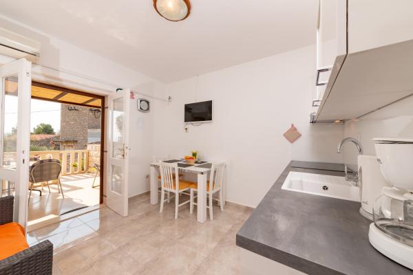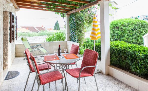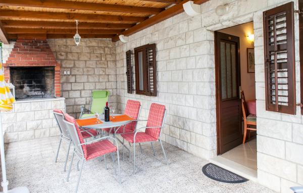 Maison en pierre avec de grandes chaises terrasse, barbecue et transats placés seconde à la mer dans un environnement calme et paisible. L'établissement est situé à 5 minutes à pied du centre et à 10 minutes à pied de la plage !!!