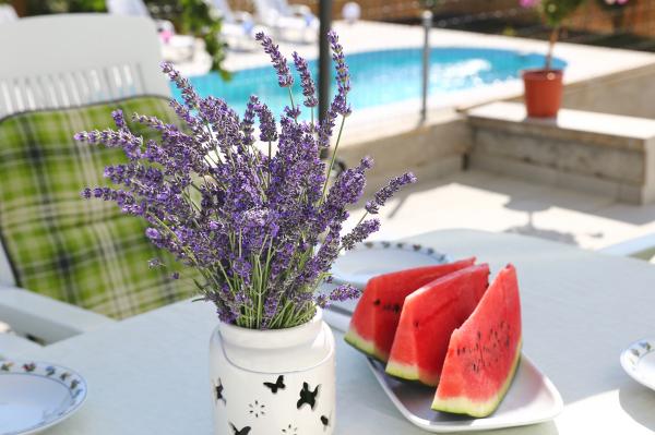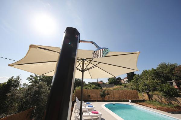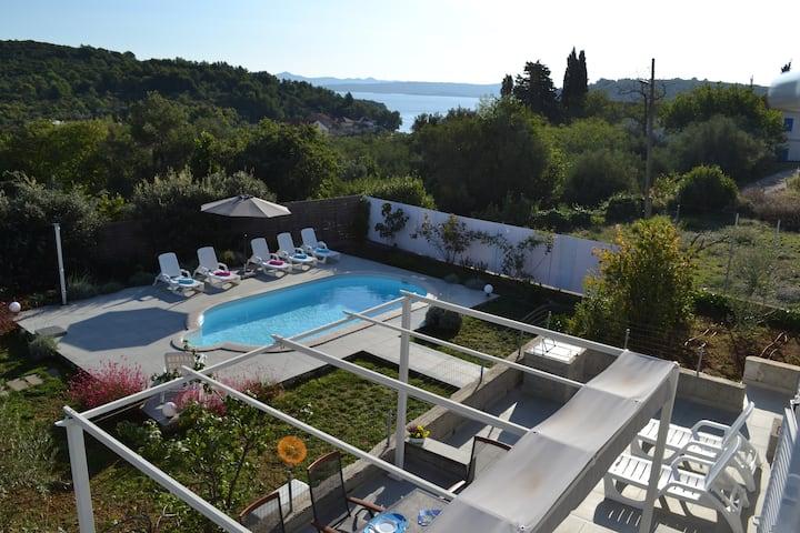Nous étions huit (4 adultes et 4 enfants) deux semaines dans le chalet, et apprécié le séjour, beaucoup. La maison correspond absolument à la description, et encore mieux, très gentil propriétaire serviable, à partir de laquelle nous avons reçu la bienvenue après l'arrivée avec des boissons. La maison a été entièrement rénovée avec un jardin idyllique, une piscine et une terrasse d'où vous avez une vue magnifique sur la mer. Meubles de jardin, chaise longue, et barbecue clôturé sont disponibles. L'équipement de la maison est génial, tout est disponible, même la machine à laver, et les lave-vaisselle sont disponibles pour utilisation. Il ne manque rien et si vous avez besoin de quelque chose en plus, est organisé par le propriétaire. Si vous êtes à la recherche de repos et de détente en vacances, ou si vous n'avez pas envie d'aller à la plage après une journée passée à l'extérieur, mais que vous souhaitez vous détendre au bord de la piscine, vous trouverez les conditions idéales pour cela. La piscine est très propre et nettoyée tous les jours. Ce fut un séjour très agréable et relaxant. Un endroit pour se détendre, toujours recommandé.