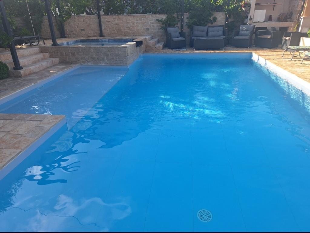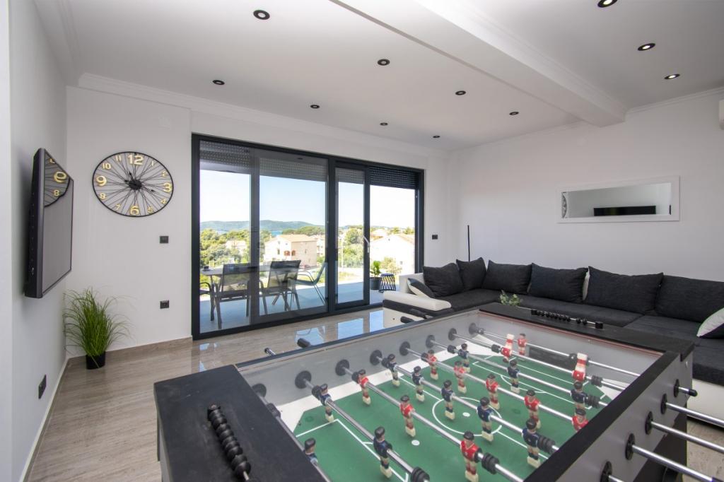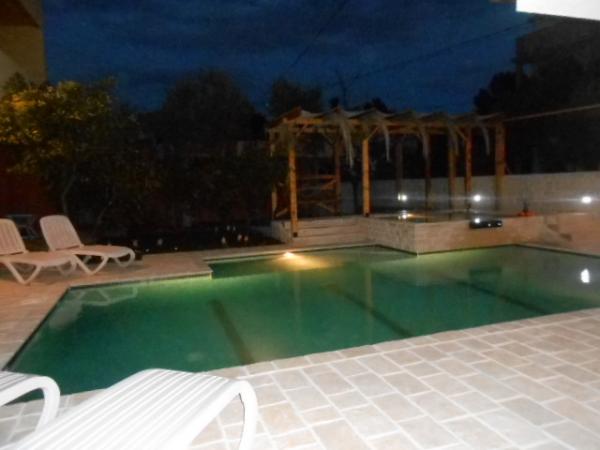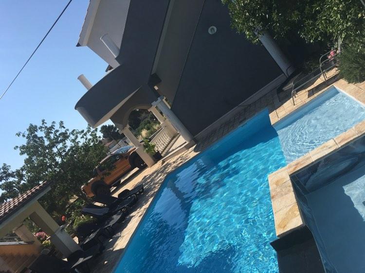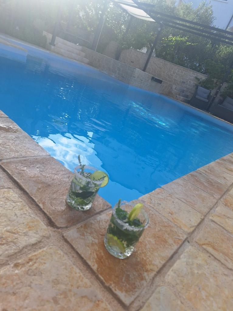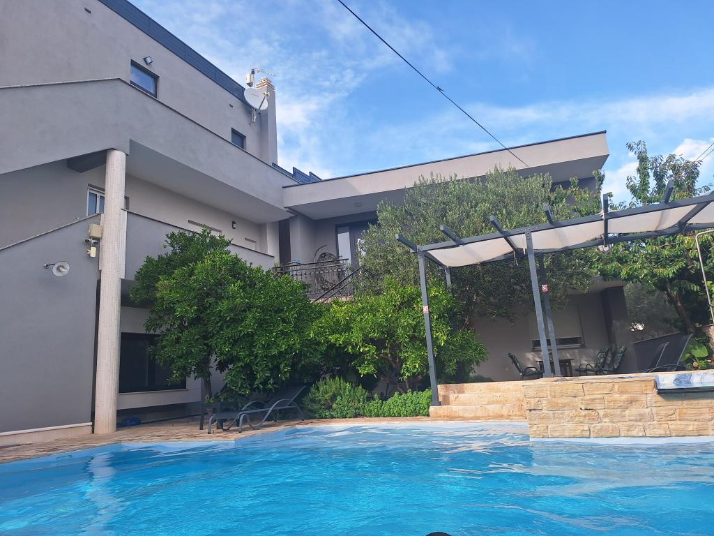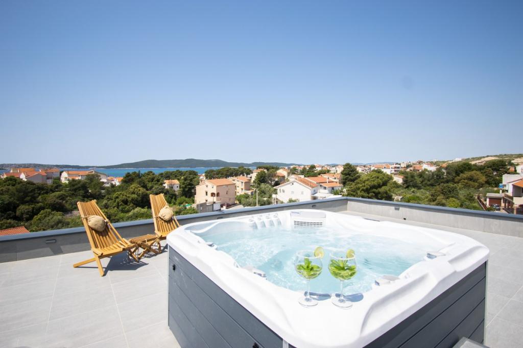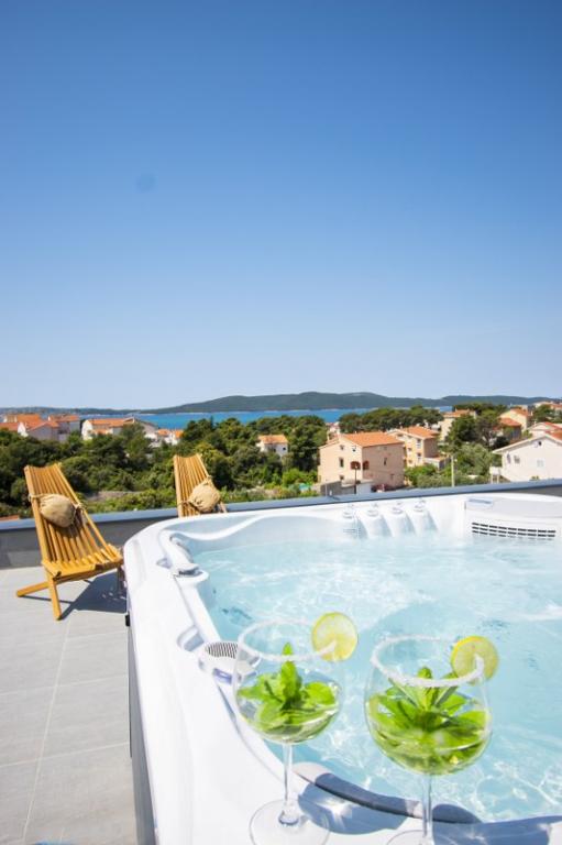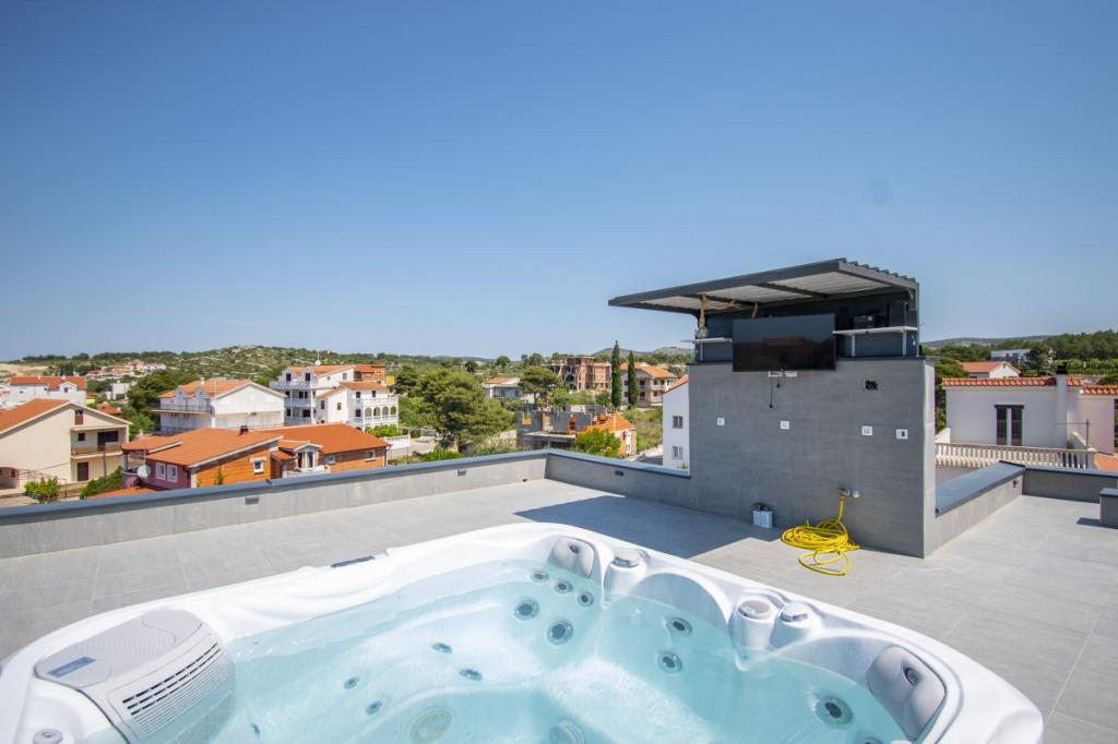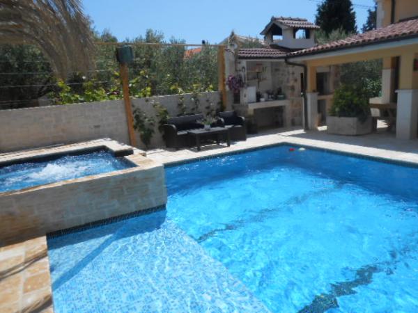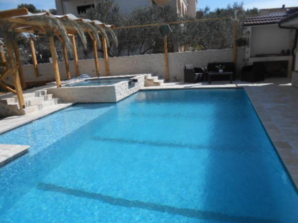 La maison pour 10 personnes avec piscine et jacuzzi est située dans un quartier calme de Brodarica, entourée de verdure et de fleurs. Les deux premiers appartements sont au rez-de-chaussée, l'un de 45 m2 et l'autre de 50 m2. Chaque appartement dispose d'une chambre double, d'une cuisine, d'un canapé-lit, d'une salle de bain et d'une terrasse avec table et chaises. Le troisième appartement de 90 m2, situé au premier étage, dispose de deux grandes chambres doubles, d'un grand salon, d'une cuisine, d'une salle de bain et d'une terrasse de 45 m2 avec table et chaises. Il convient à une famille et à des amis légèrement plus nombreux. L'appartement est climatisé. Le quatrième appartement est luxueusement agencé, d'environ 100m2, dispose d'un grand séjour, d'une cuisine entièrement équipée, d'une grande pièce avec télévision et climatisation, l'appartement dispose également d'un sauna. il y a un jacuzzi avec une grande terrasse sur le toit. chaque appartement dispose de la climatisation et chaque chambre dispose également d'une télévision. La piscine est partagée. La maison est à 5-6 minutes à pied de la mer. À côté de la maison, il y a deux autres appartements, l'un de 110 m2 luxueusement meublé et l'autre de 55 m2.