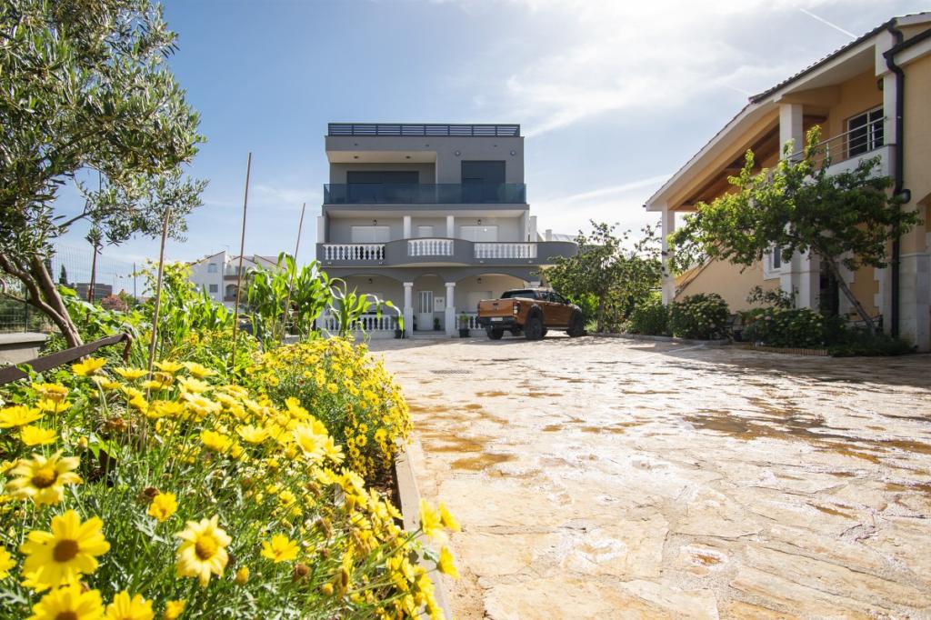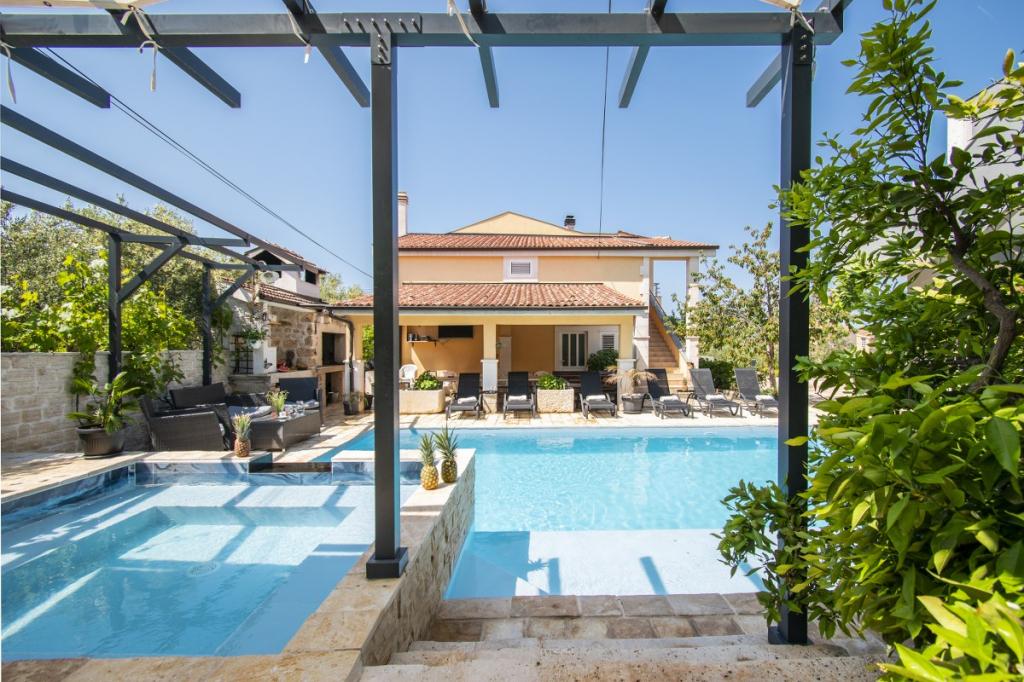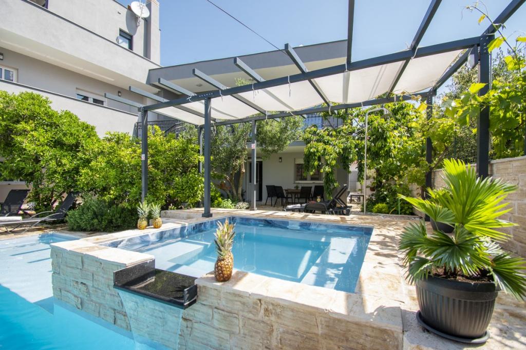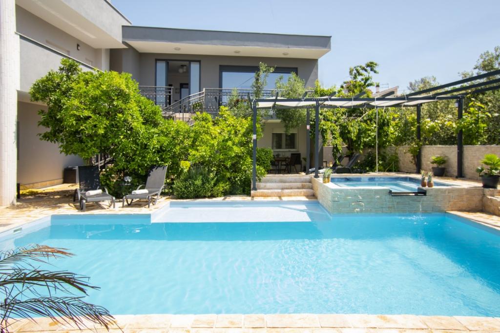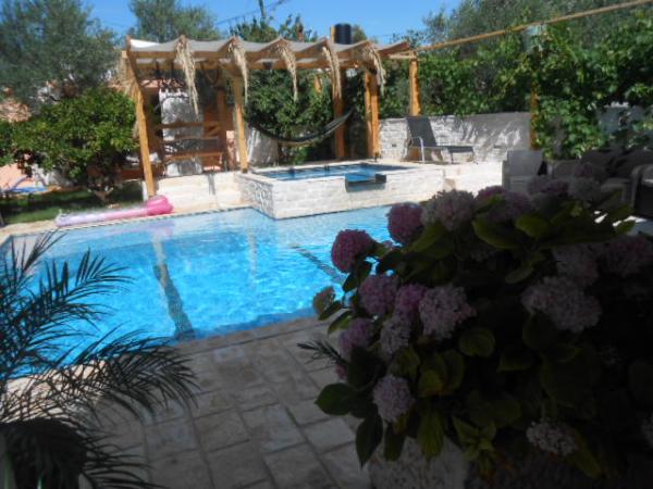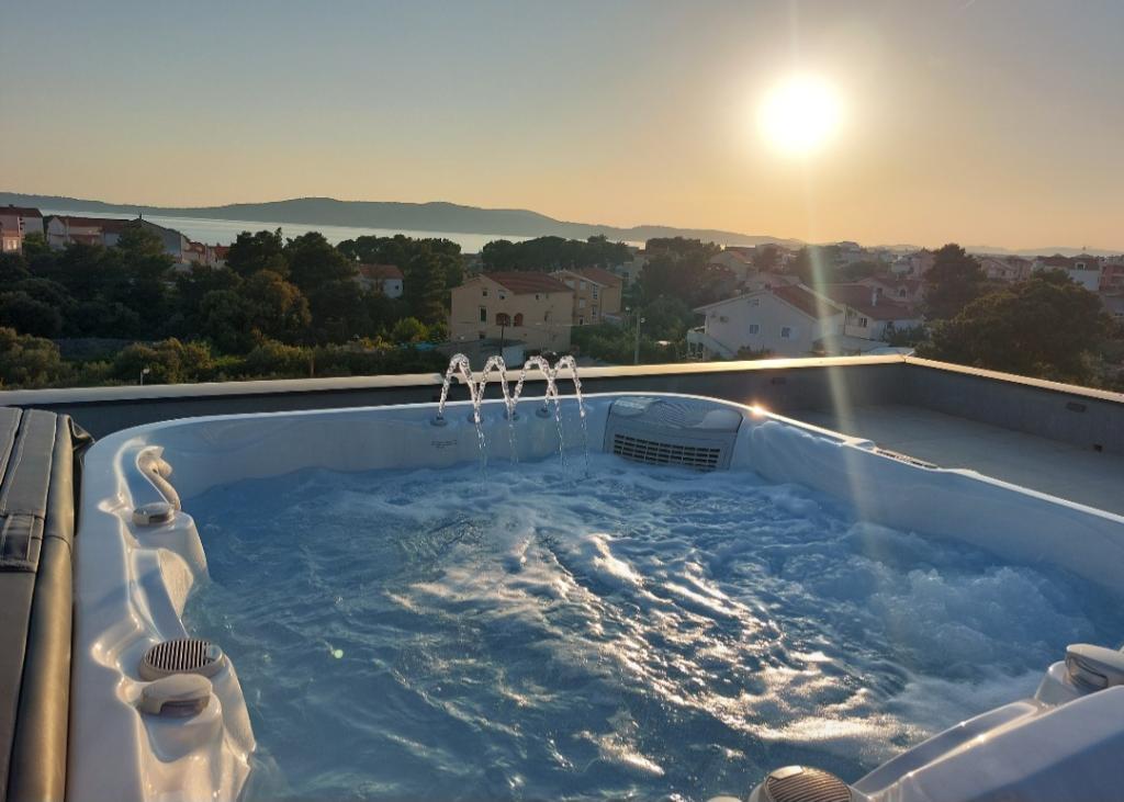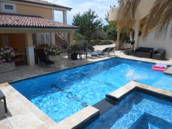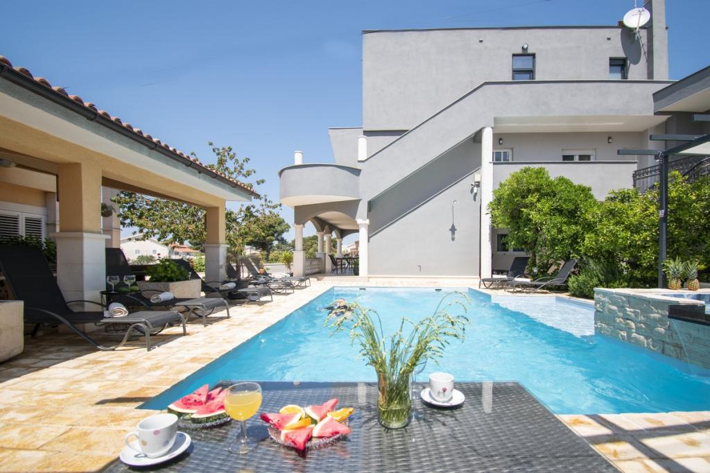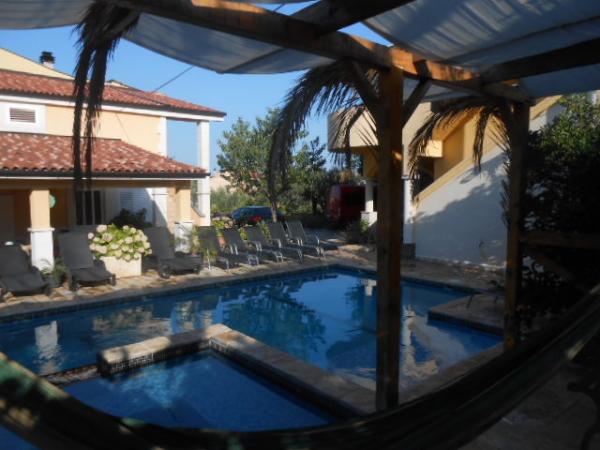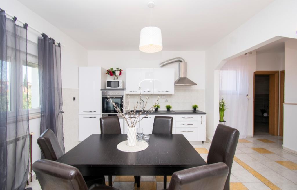La maison pour 10 personnes avec piscine et jacuzzi est située dans un quartier calme de Brodarica, entourée de verdure et de fleurs. Les deux premiers appartements sont au rez-de-chaussée, l'un de 45 m2 et l'autre de 50 m2. Chaque appartement dispose d'une chambre double, d'une cuisine, d'un canapé-lit, d'une salle de bain et d'une terrasse avec table et chaises. Le troisième appartement de 90 m2, situé au premier étage, dispose de deux grandes chambres doubles, d'un grand salon, d'une cuisine, d'une salle de bain et d'une terrasse de 45 m2 avec table et chaises. Il convient à une famille et à des amis légèrement plus nombreux. L'appartement est climatisé. Le quatrième appartement est luxueusement agencé, d'environ 100m2, dispose d'un grand séjour, d'une cuisine entièrement équipée, d'une grande pièce avec télévision et climatisation, l'appartement dispose également d'un sauna. il y a un jacuzzi avec une grande terrasse sur le toit. chaque appartement dispose de la climatisation et chaque chambre dispose également d'une télévision. La piscine est partagée. La maison est à 5-6 minutes à pied de la mer. À côté de la maison, il y a deux autres appartements, l'un de 110 m2 luxueusement meublé et l'autre de 55 m2.
