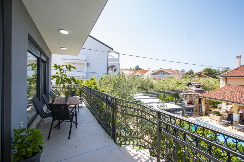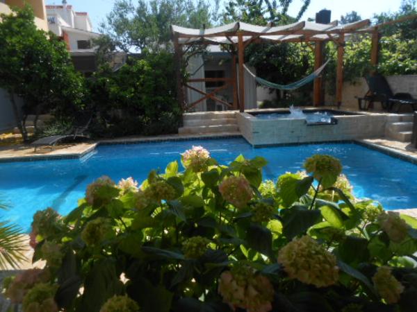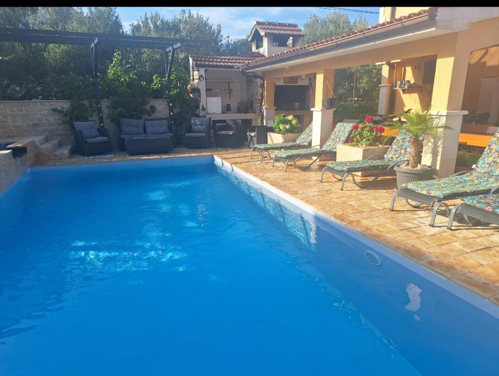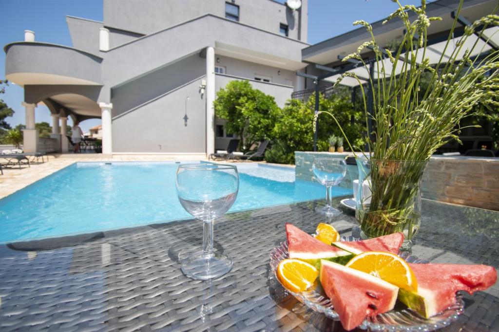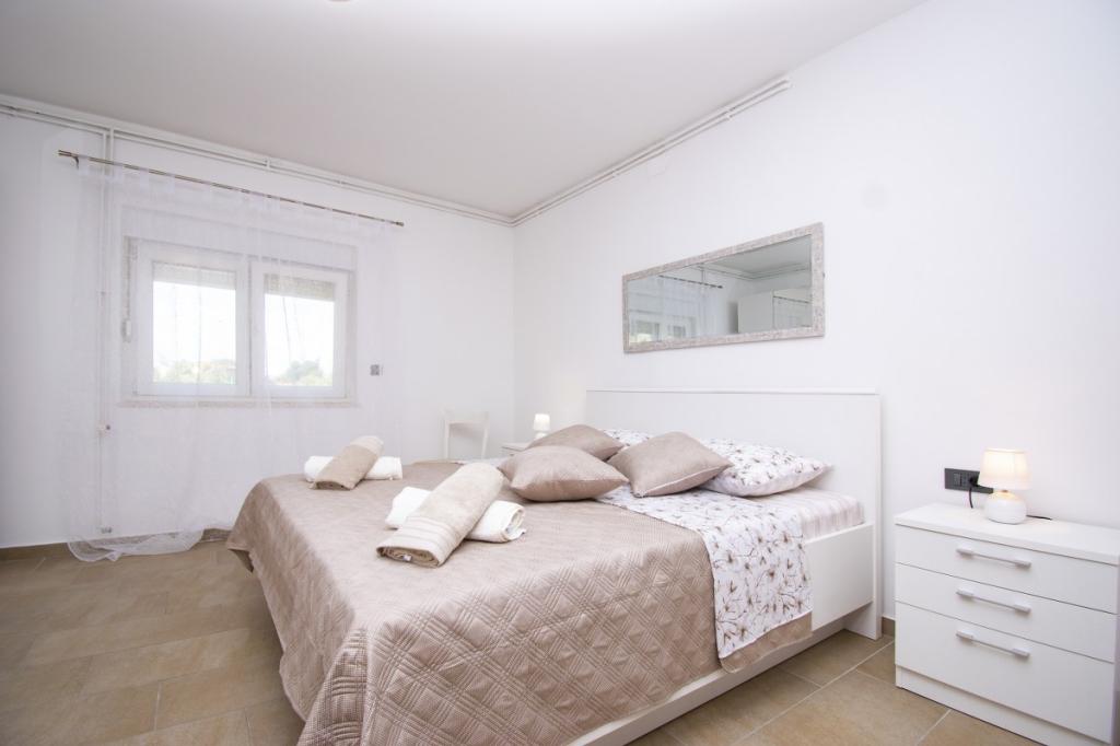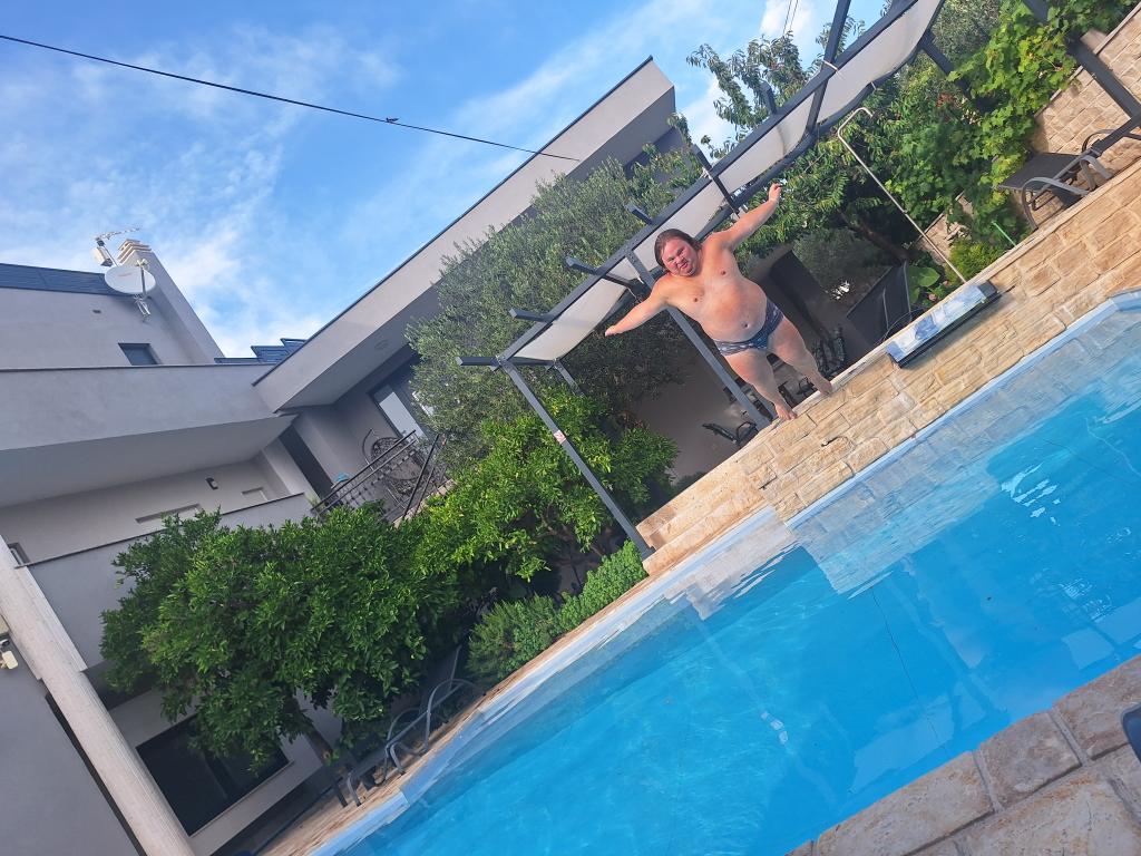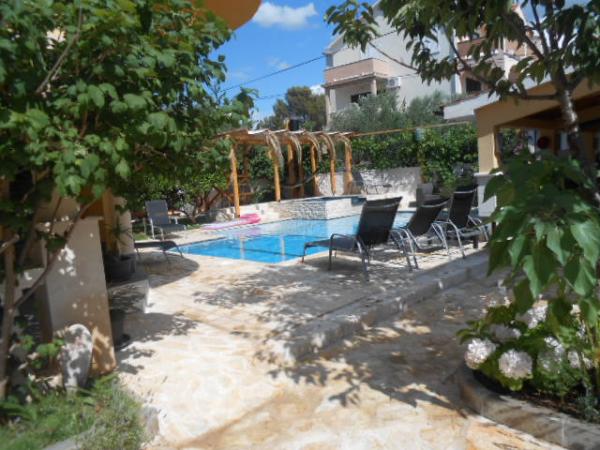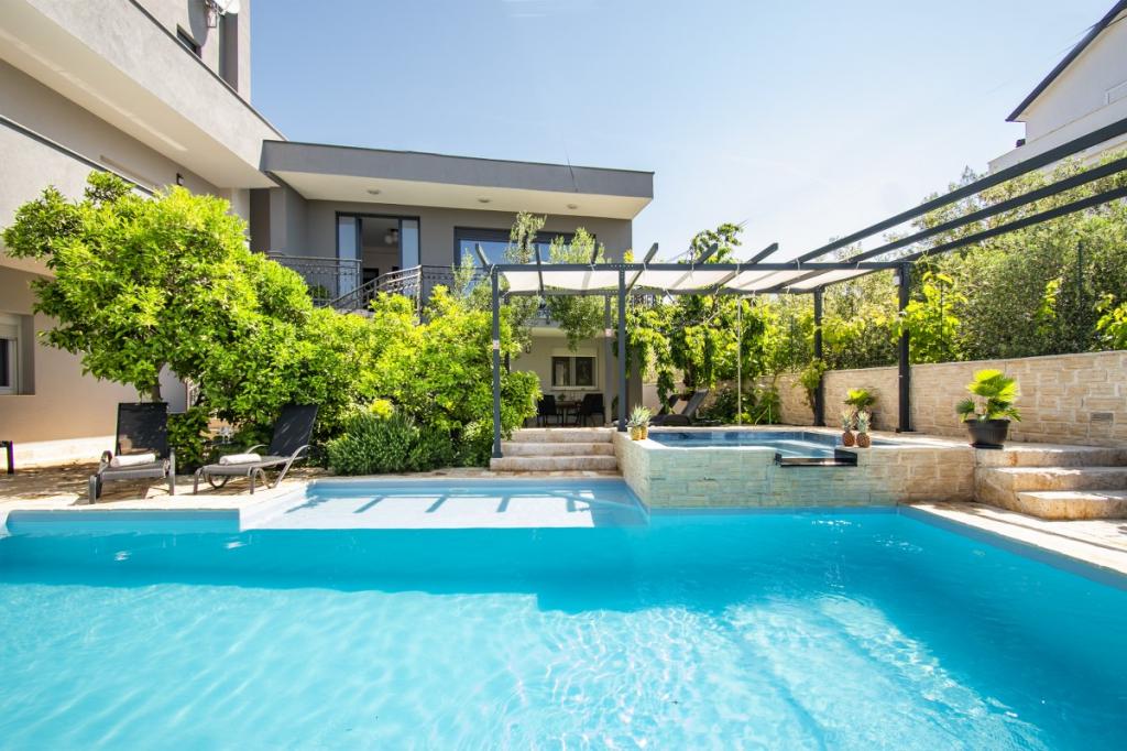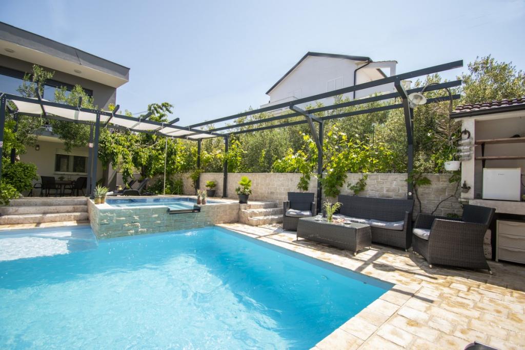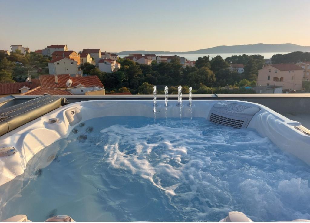 La maison pour 10 personnes avec piscine et jacuzzi est située dans un quartier calme de Brodarica, entourée de verdure et de fleurs. Les deux premiers appartements sont au rez-de-chaussée, l'un de 45 m2 et l'autre de 50 m2. Chaque appartement dispose d'une chambre double, d'une cuisine, d'un canapé-lit, d'une salle de bain et d'une terrasse avec table et chaises. Le troisième appartement de 90 m2, situé au premier étage, dispose de deux grandes chambres doubles, d'un grand salon, d'une cuisine, d'une salle de bain et d'une terrasse de 45 m2 avec table et chaises. Il convient à une famille et à des amis légèrement plus nombreux. L'appartement est climatisé. Le quatrième appartement est luxueusement agencé, d'environ 100m2, dispose d'un grand séjour, d'une cuisine entièrement équipée, d'une grande pièce avec télévision et climatisation, l'appartement dispose également d'un sauna. il y a un jacuzzi avec une grande terrasse sur le toit. chaque appartement dispose de la climatisation et chaque chambre dispose également d'une télévision. La piscine est partagée. La maison est à 5-6 minutes à pied de la mer. À côté de la maison, il y a deux autres appartements, l'un de 110 m2 luxueusement meublé et l'autre de 55 m2.
