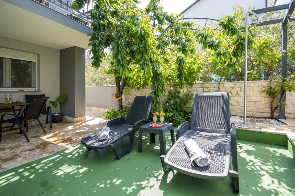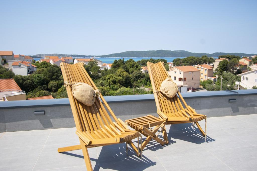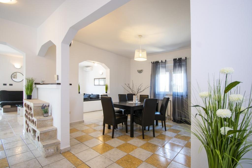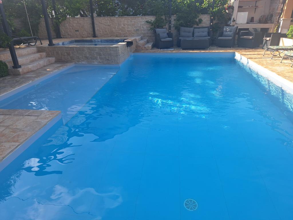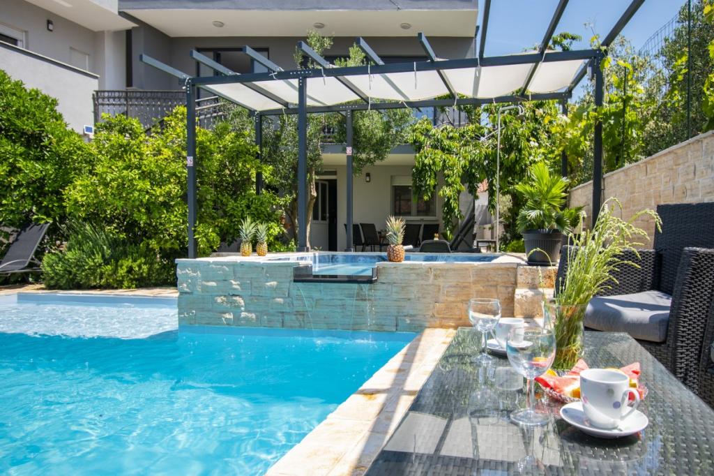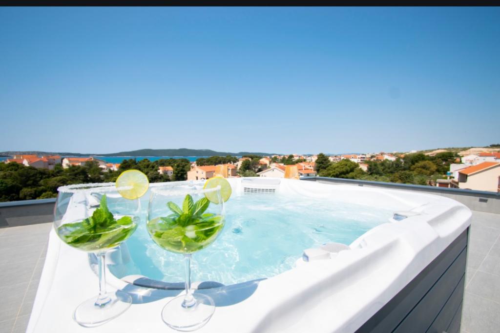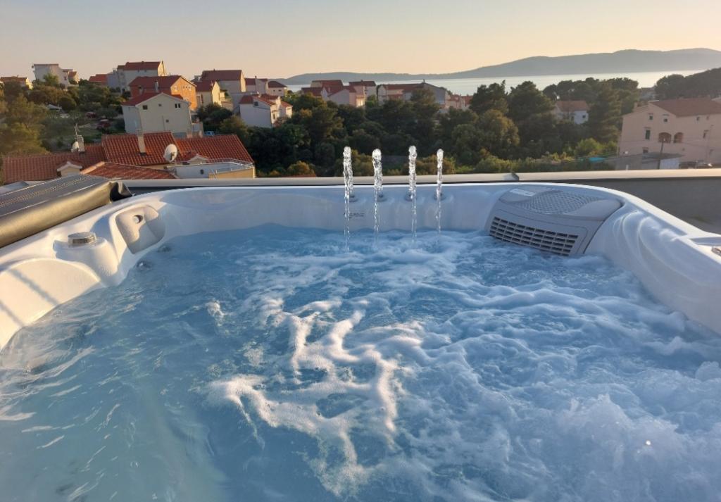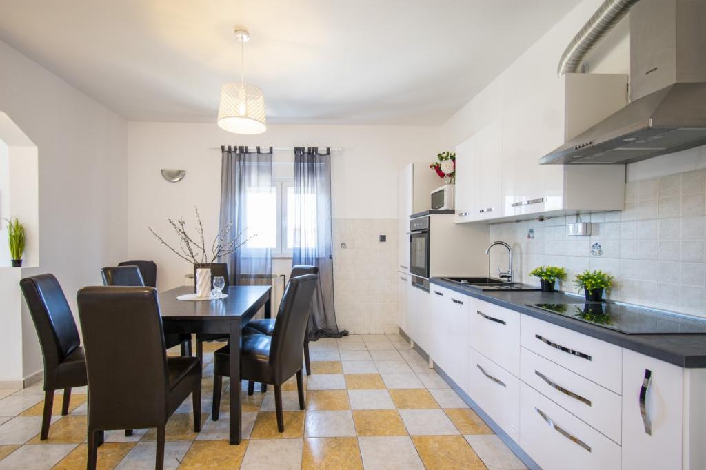 La maison pour 10 personnes avec piscine et jacuzzi est située dans un quartier calme de Brodarica, entourée de verdure et de fleurs. Les deux premiers appartements sont au rez-de-chaussée, l'un de 45 m2 et l'autre de 50 m2. Chaque appartement dispose d'une chambre double, d'une cuisine, d'un canapé-lit, d'une salle de bain et d'une terrasse avec table et chaises. Le troisième appartement de 90 m2, situé au premier étage, dispose de deux grandes chambres doubles, d'un grand salon, d'une cuisine, d'une salle de bain et d'une terrasse de 45 m2 avec table et chaises. Il convient à une famille et à des amis légèrement plus nombreux. L'appartement est climatisé. Le quatrième appartement est luxueusement agencé, d'environ 100m2, dispose d'un grand séjour, d'une cuisine entièrement équipée, d'une grande pièce avec télévision et climatisation, l'appartement dispose également d'un sauna. il y a un jacuzzi avec une grande terrasse sur le toit. chaque appartement dispose de la climatisation et chaque chambre dispose également d'une télévision. La piscine est partagée. La maison est à 5-6 minutes à pied de la mer. À côté de la maison, il y a deux autres appartements, l'un de 110 m2 luxueusement meublé et l'autre de 55 m2.