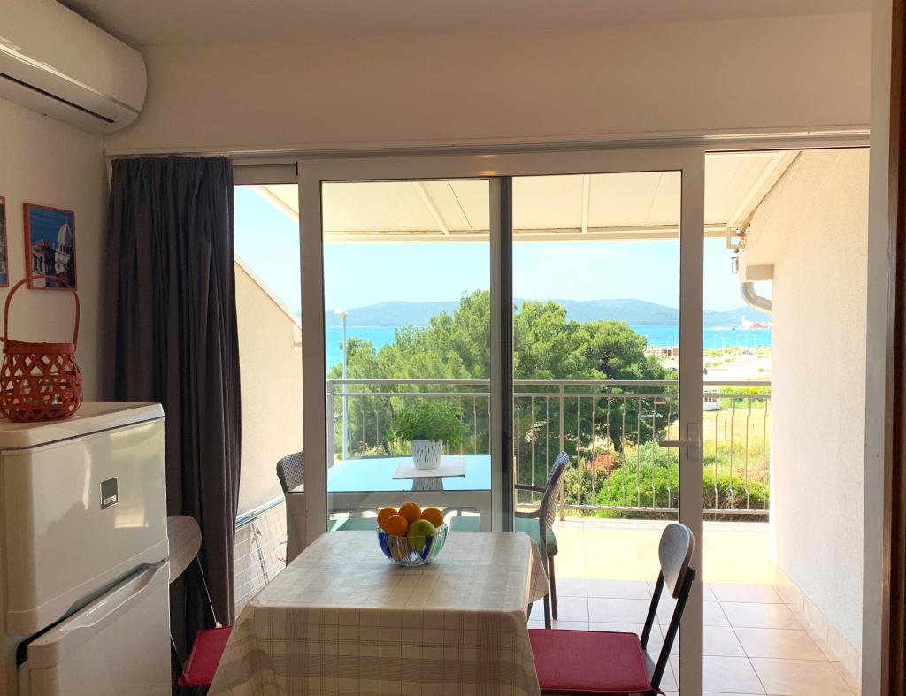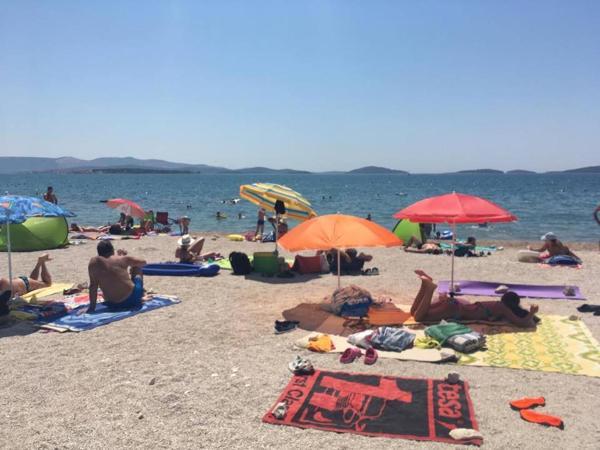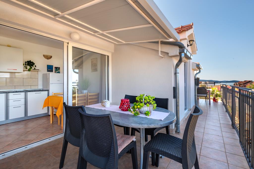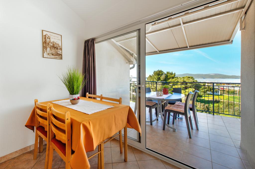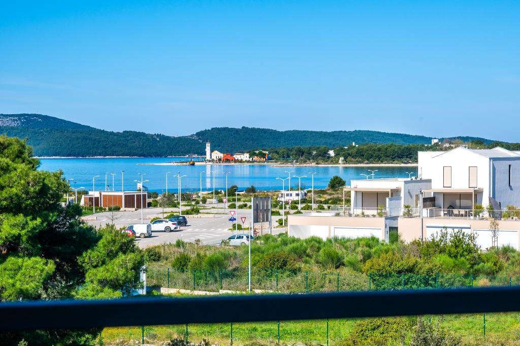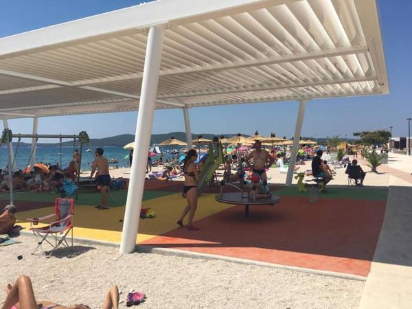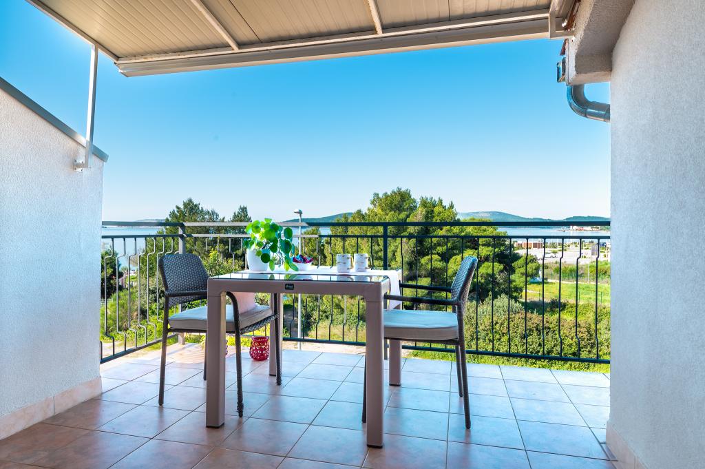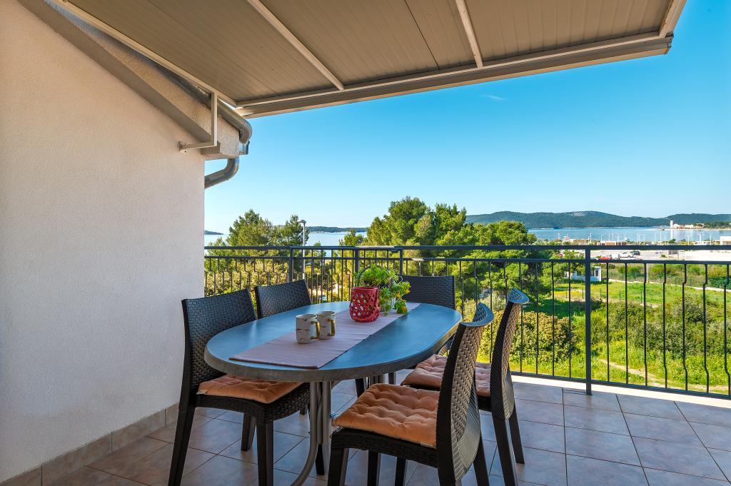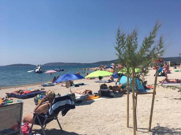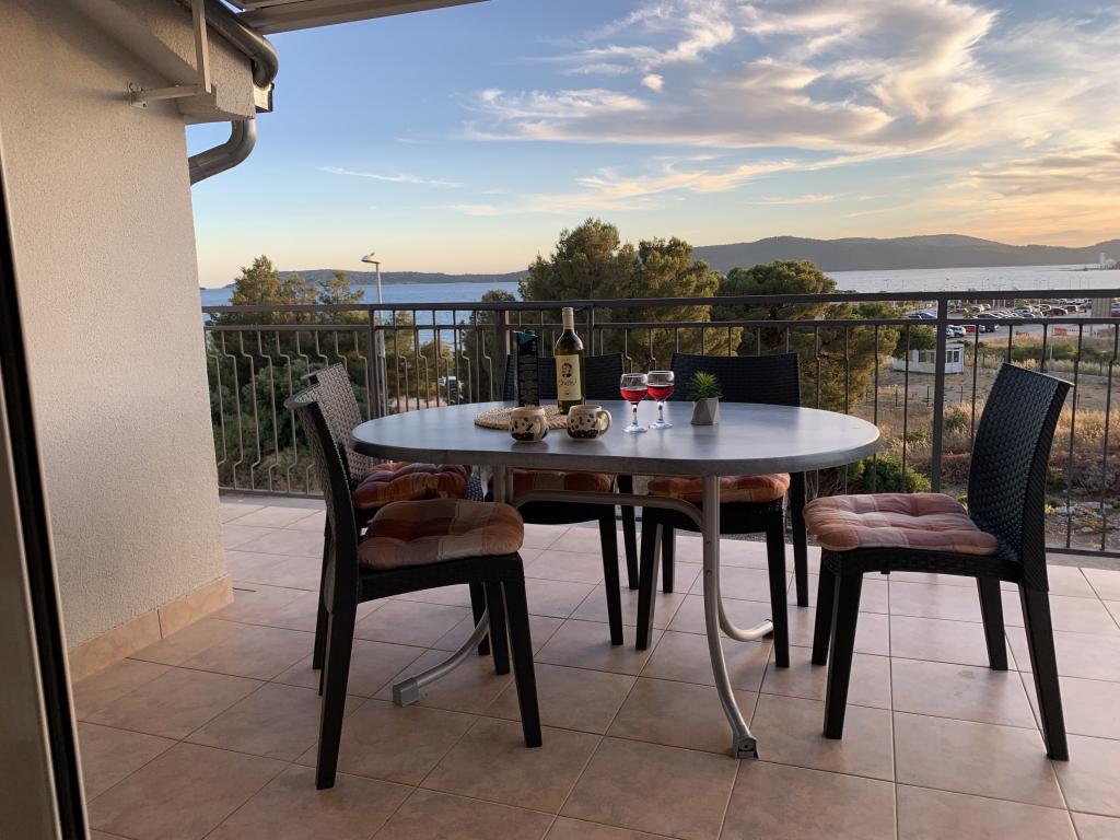 Appartement dans une belle partie de Brodarica. Vue de la terrasse sur la plage. grand parking. Griller dans la cour. à côté du grill, la table du dîner se trouve à proximité de toutes les installations. Solaris, Parcs nationaux de Sibenik Centres d'oscillation de Krka et de Kornati, aire de jeux pour enfants