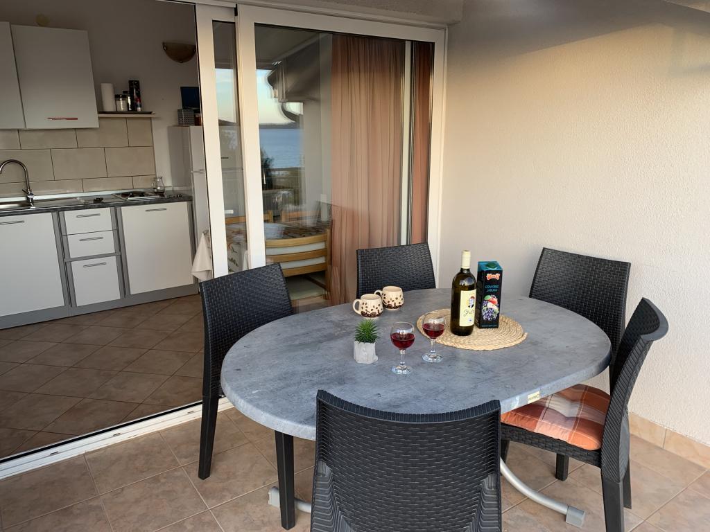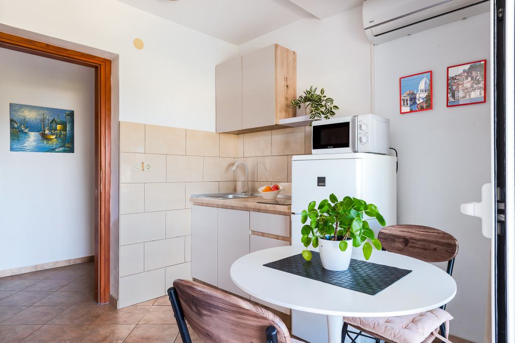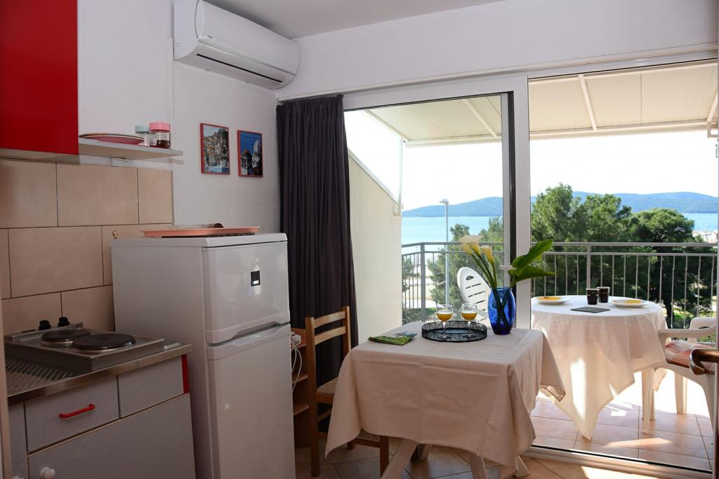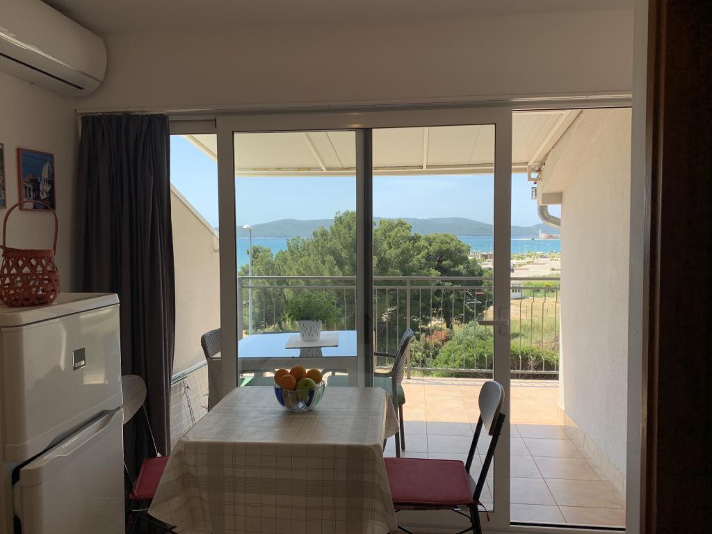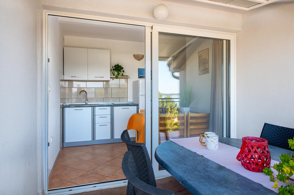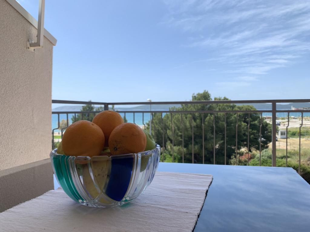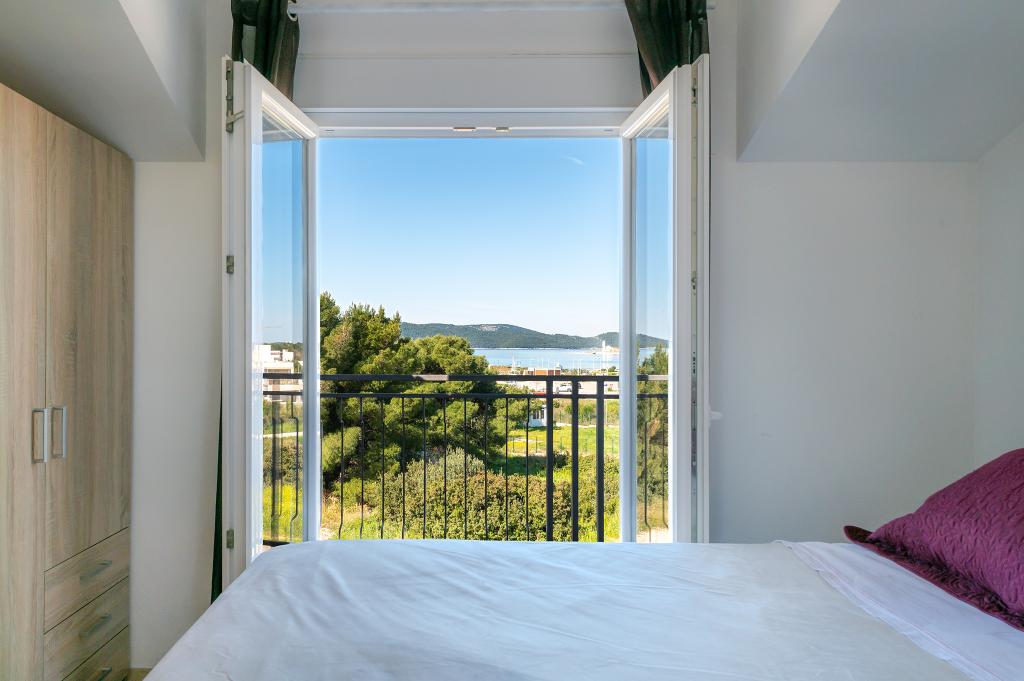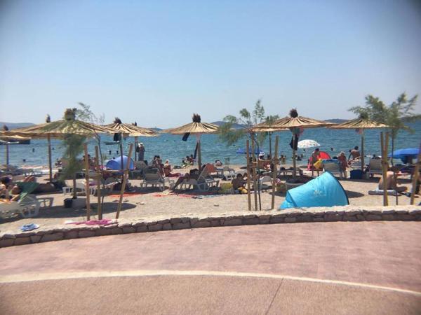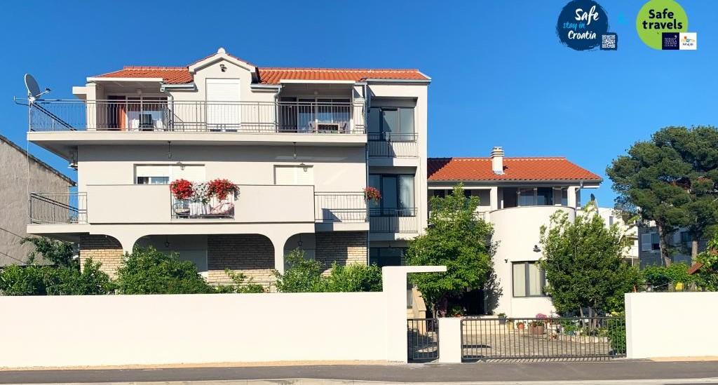 Appartement dans une belle partie de Brodarica. Vue de la terrasse sur la plage. grand parking. Griller dans la cour. à côté du grill, la table du dîner se trouve à proximité de toutes les installations. Solaris, Parcs nationaux de Sibenik Centres d'oscillation de Krka et de Kornati, aire de jeux pour enfants