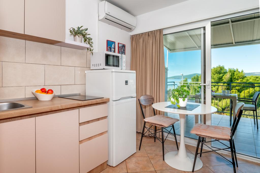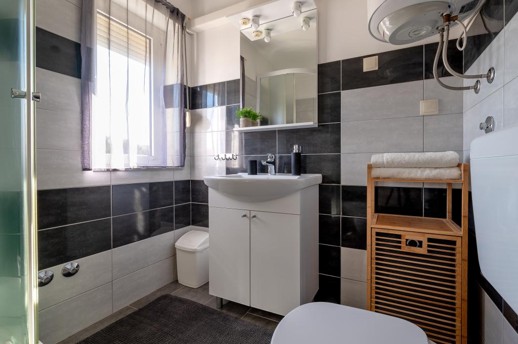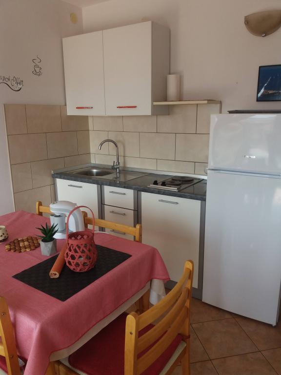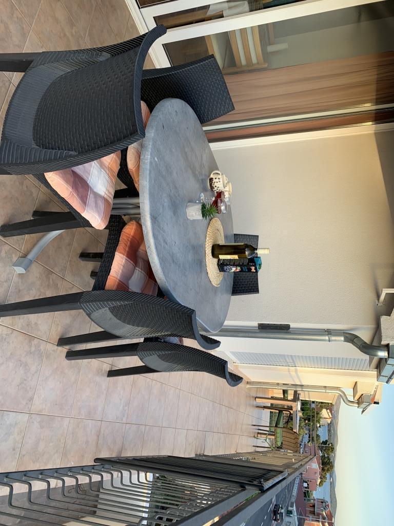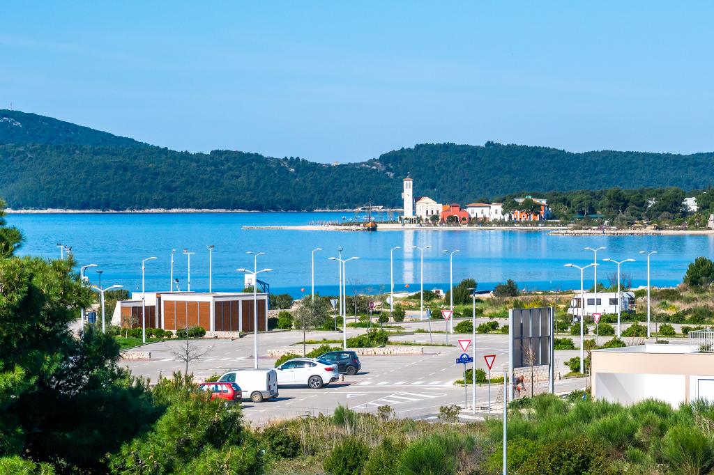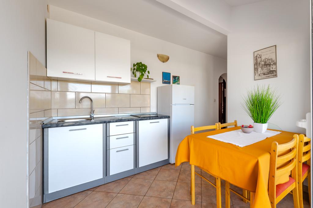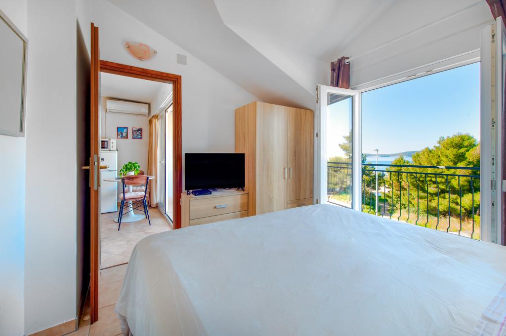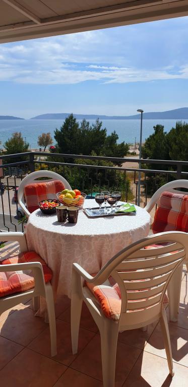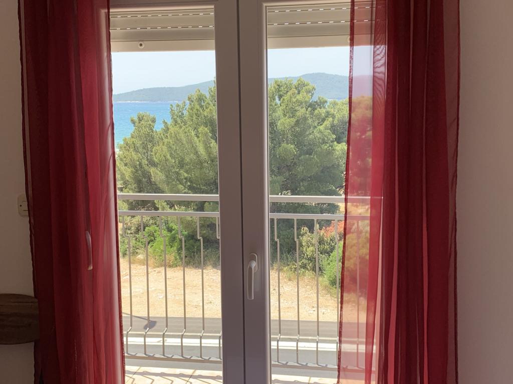 Appartement dans une belle partie de Brodarica. Vue de la terrasse sur la plage. grand parking. Griller dans la cour. à côté du grill, la table du dîner se trouve à proximité de toutes les installations. Solaris, Parcs nationaux de Sibenik Centres d'oscillation de Krka et de Kornati, aire de jeux pour enfants