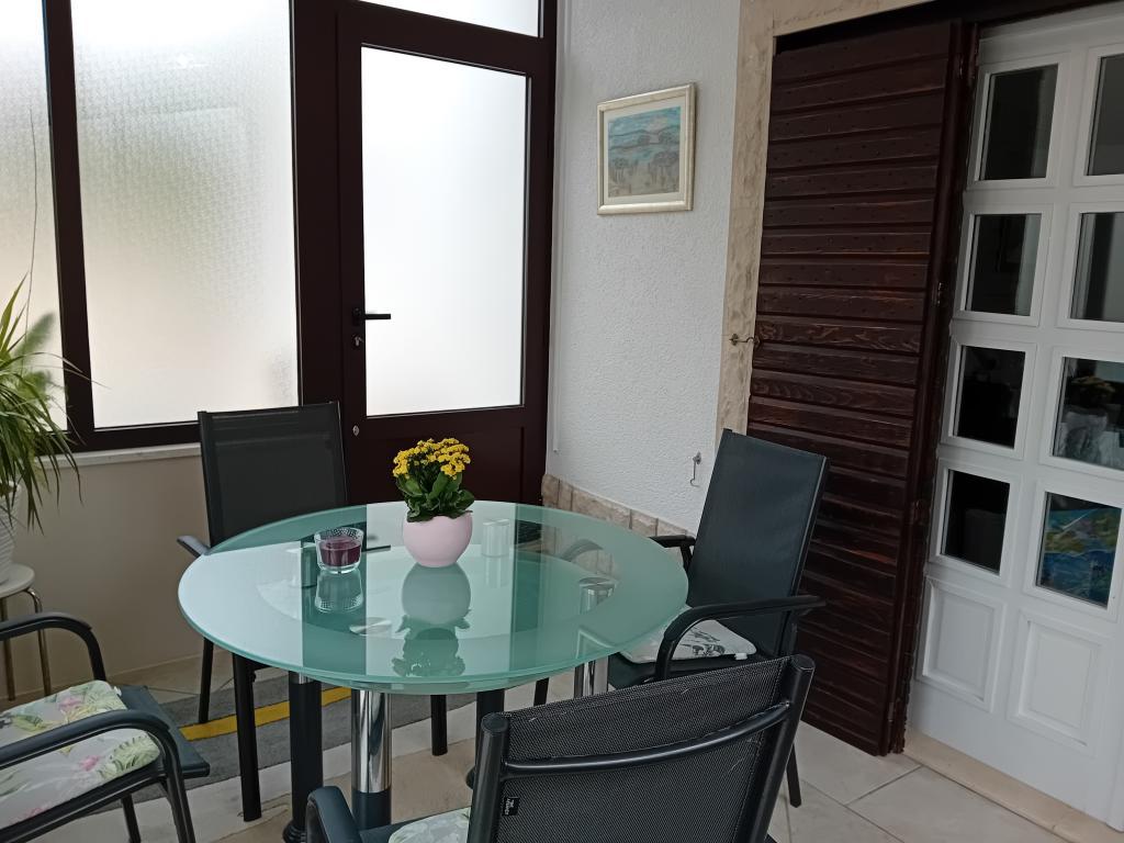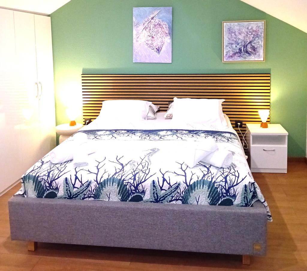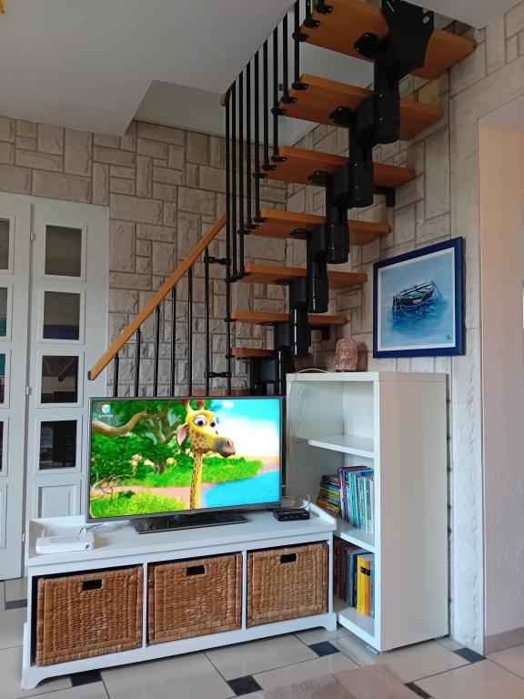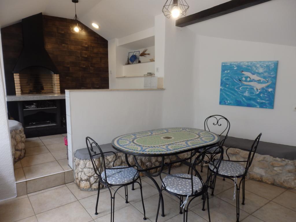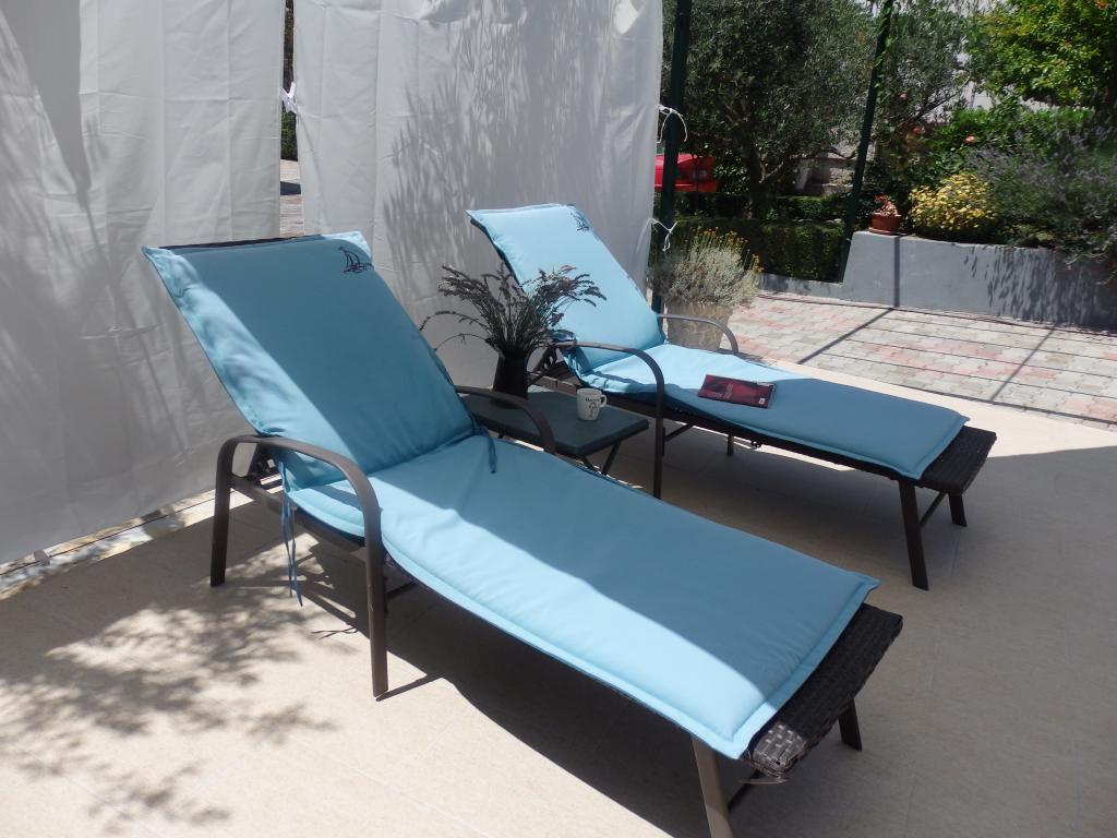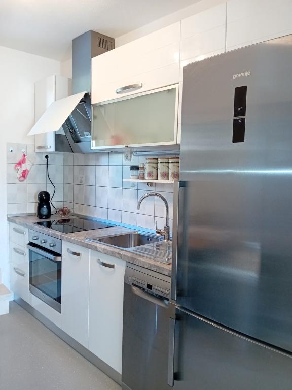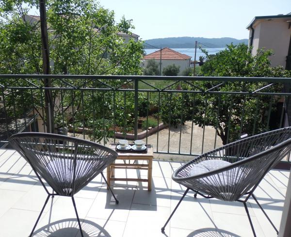 Appartement moderne et entièrement équipé avec vue mer, grande terrasse et jardin, à proximité de la plage, 4 étoiles. Situé dans une maison (rez-de-chaussée et premier étage), l'appartement comprend au rez-de-chaussée : une entrée, une cuisine, un salon et une salle de bains. Le salon est équipé d'un canapé-lit pour deux personnes. Au premier étage : une chambre, une salle de bains (avec douche et WC séparés) et un balcon couvert de 10 m² avec vue mer. La chambre dispose d'un lit double confortable et d'un fauteuil convertible en lit bébé. La cuisine, au rez-de-chaussée, donne sur une terrasse de 45 m². Un barbecue et une table à manger sont installés dans la partie couverte (15 m²), tandis que le reste de la terrasse est aménagé en espace détente avec vue sur le jardin.