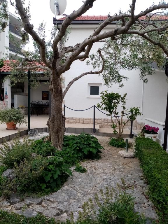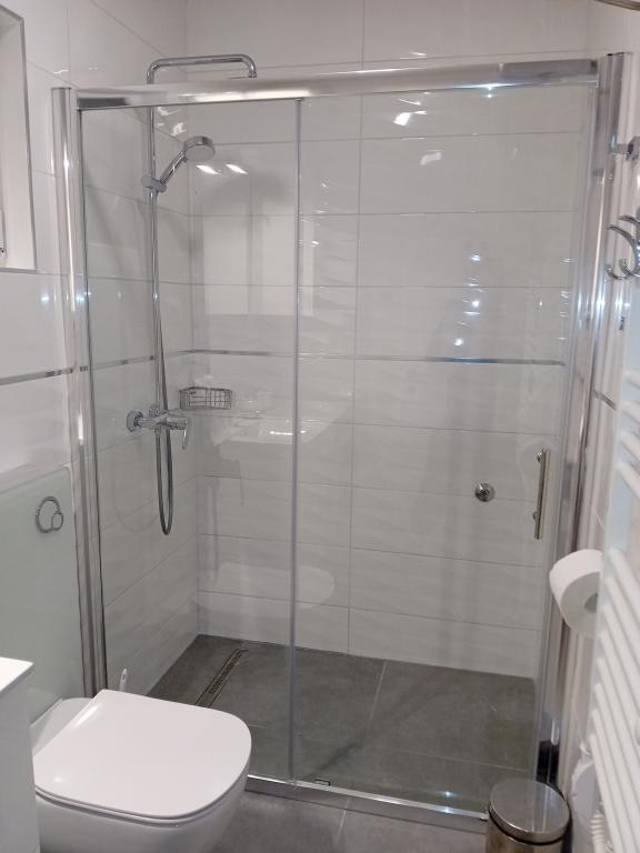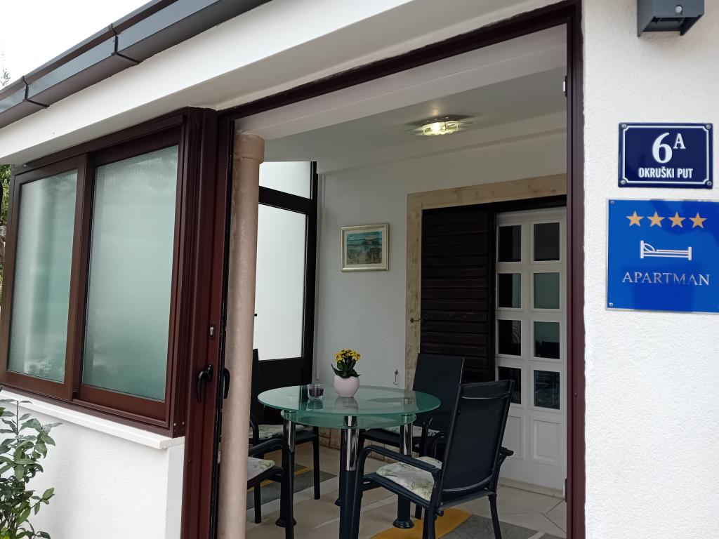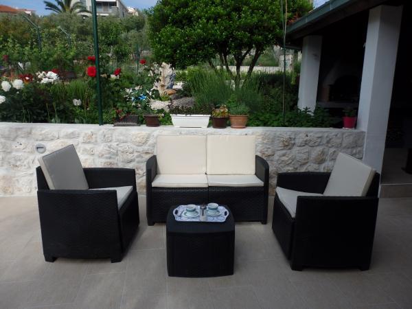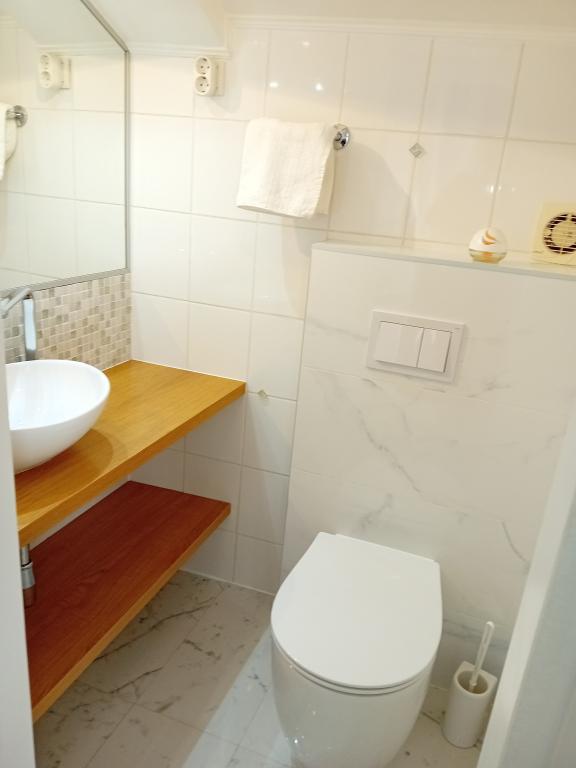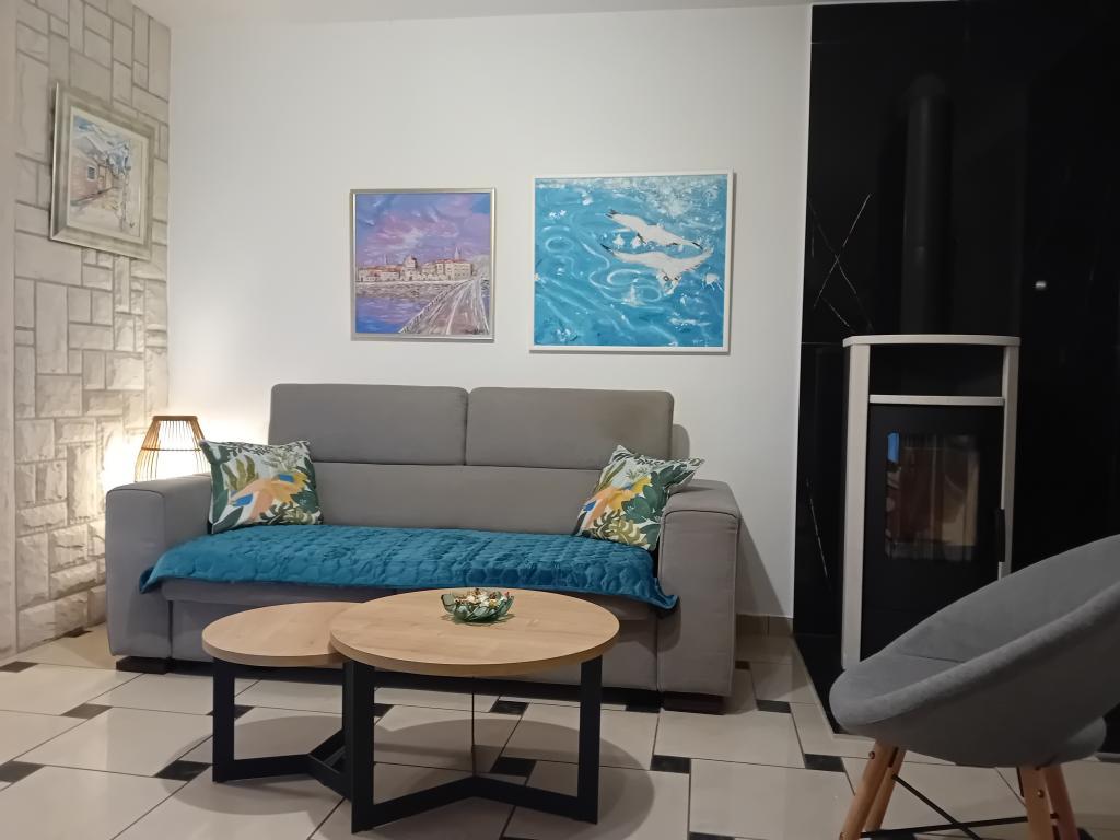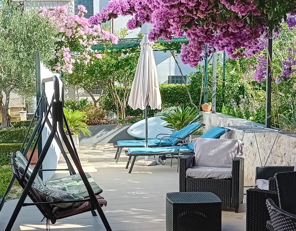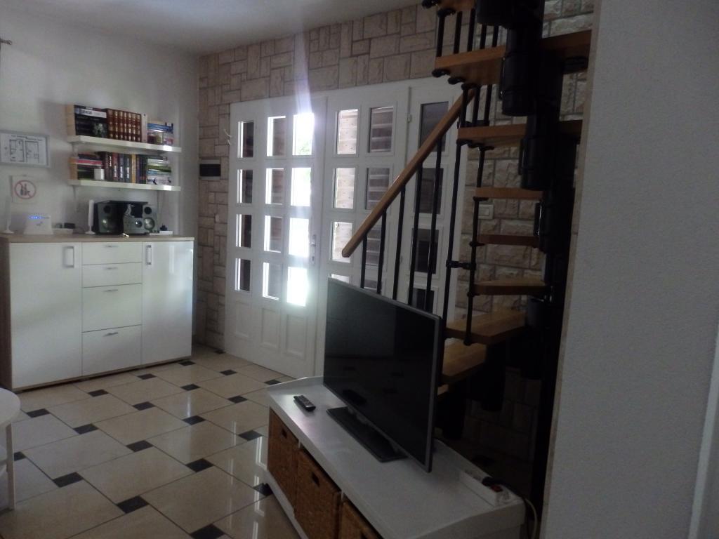 Appartement moderne et entièrement équipé avec vue mer, grande terrasse et jardin, à proximité de la plage, 4 étoiles. Situé dans une maison (rez-de-chaussée et premier étage), l'appartement comprend au rez-de-chaussée : une entrée, une cuisine, un salon et une salle de bains. Le salon est équipé d'un canapé-lit pour deux personnes. Au premier étage : une chambre, une salle de bains (avec douche et WC séparés) et un balcon couvert de 10 m² avec vue mer. La chambre dispose d'un lit double confortable et d'un fauteuil convertible en lit bébé. La cuisine, au rez-de-chaussée, donne sur une terrasse de 45 m². Un barbecue et une table à manger sont installés dans la partie couverte (15 m²), tandis que le reste de la terrasse est aménagé en espace détente avec vue sur le jardin.