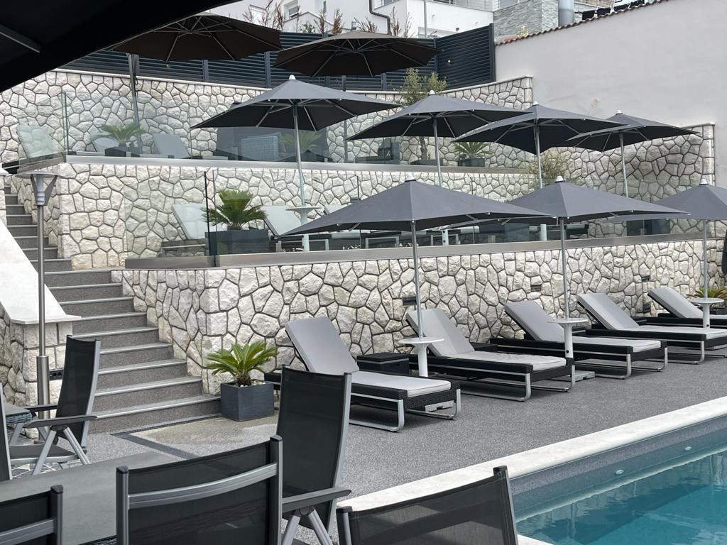 Taxe de sejour est inclus dans le prix.Appartements entièrement équipés de façon moderne, grand parking, grande terrasse avec grill et barbecue à gaz, tous les appartements sont équipés de TV interne et satellite. La grande terrasse commune avec une piscine de 10,5 m sur 5,5 m peut également être chauffée. Grande terrasse pour bronzer. Transats de qualité pour bronzer et mobilier lounge