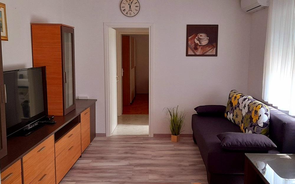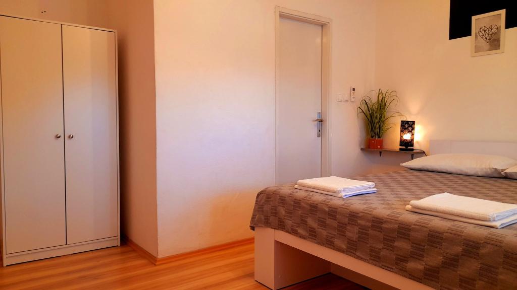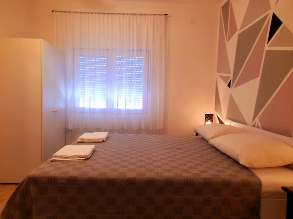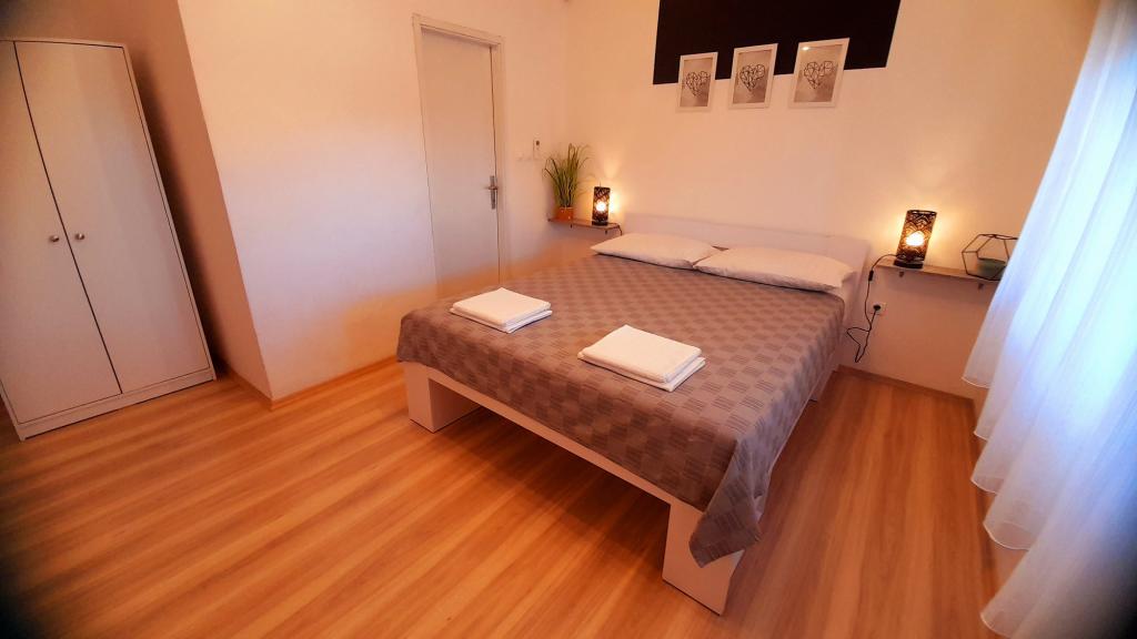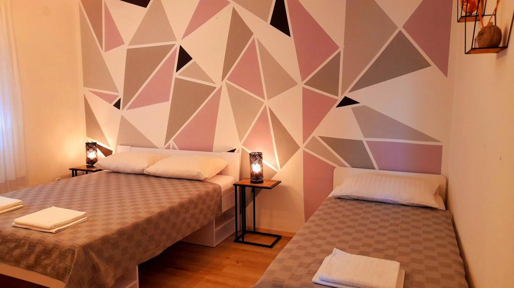 Appartement Mediteran, A7+5, Drage (Pakoštane, Zadar) Hébergement spacieux et bien équipé pour 7-12 personnes, avec une grande terrasse ! L'appartement Mediteran est un appartement très spacieux et bien équipé, d'une surface habitable totale de 100 m2 avec une grande terrasse spacieuse de 15 m2 et un petit balcon. L'appartement se compose de trois chambres, trois salles de bains, une cuisine avec salle à manger, deux salons, un couloir, une buanderie, un petit balcon et une grande terrasse. Dans deux chambres il y a des lits doubles de 160 cm de large, dans la troisième chambre il y a un lit double de 160 cm de large, un lit de 90 cm de large et un lit gigogne de 90 cm de large. Il y a deux lits gigognes de 160 cm de large dans le séjour. L'appartement dispose d'un total de 7 lits principaux et de 5 lits supplémentaires. Nous proposons également 2 lits bébé portables. L'appartement est climatisé et dispose d'Internet plat wifi gratuit. Les hôtes ont à leur disposition un lave-linge, un lave-vaisselle, un four, un micro-ondes, un fer à repasser, des produits d'entretien, du linge de lit, des serviettes...