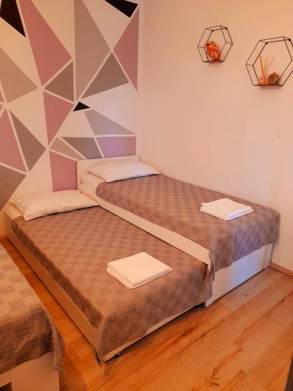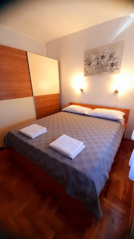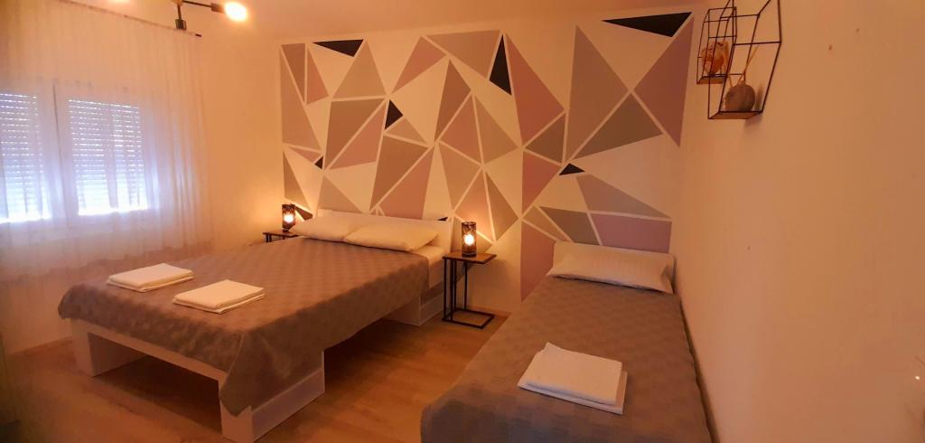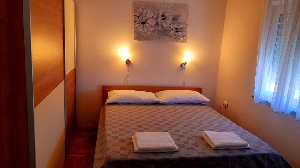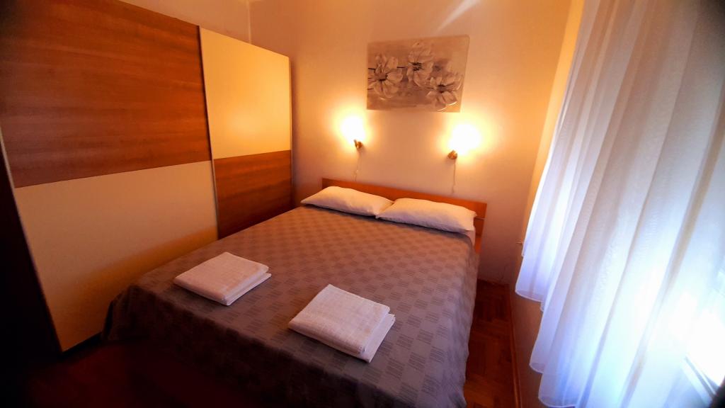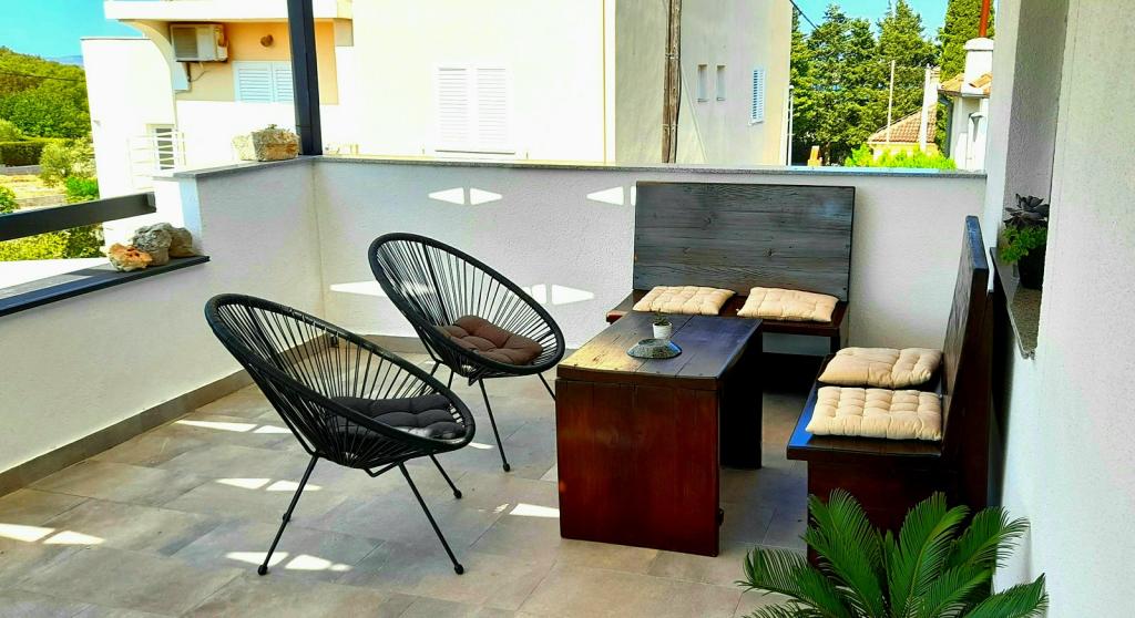 Appartement Mediteran, A7+5, Drage (Pakoštane, Zadar) Hébergement spacieux et bien équipé pour 7-12 personnes, avec une grande terrasse ! L'appartement Mediteran est un appartement très spacieux et bien équipé, d'une surface habitable totale de 100 m2 avec une grande terrasse spacieuse de 15 m2 et un petit balcon. L'appartement se compose de trois chambres, trois salles de bains, une cuisine avec salle à manger, deux salons, un couloir, une buanderie, un petit balcon et une grande terrasse. Dans deux chambres il y a des lits doubles de 160 cm de large, dans la troisième chambre il y a un lit double de 160 cm de large, un lit de 90 cm de large et un lit gigogne de 90 cm de large. Il y a deux lits gigognes de 160 cm de large dans le séjour. L'appartement dispose d'un total de 7 lits principaux et de 5 lits supplémentaires. Nous proposons également 2 lits bébé portables. L'appartement est climatisé et dispose d'Internet plat wifi gratuit. Les hôtes ont à leur disposition un lave-linge, un lave-vaisselle, un four, un micro-ondes, un fer à repasser, des produits d'entretien, du linge de lit, des serviettes...