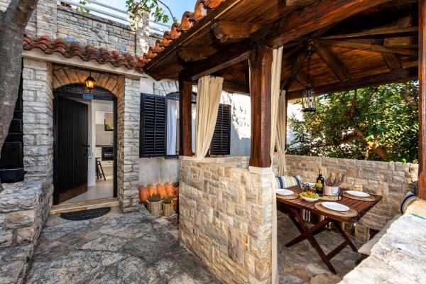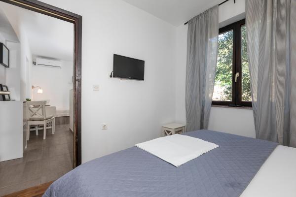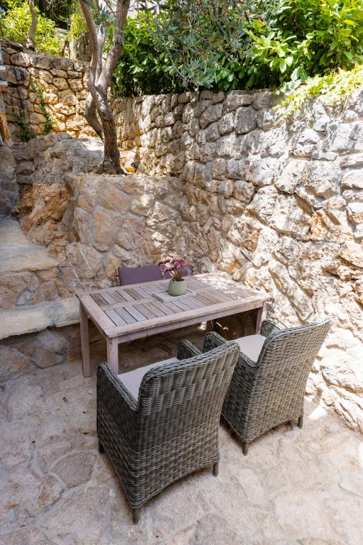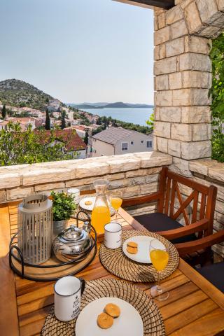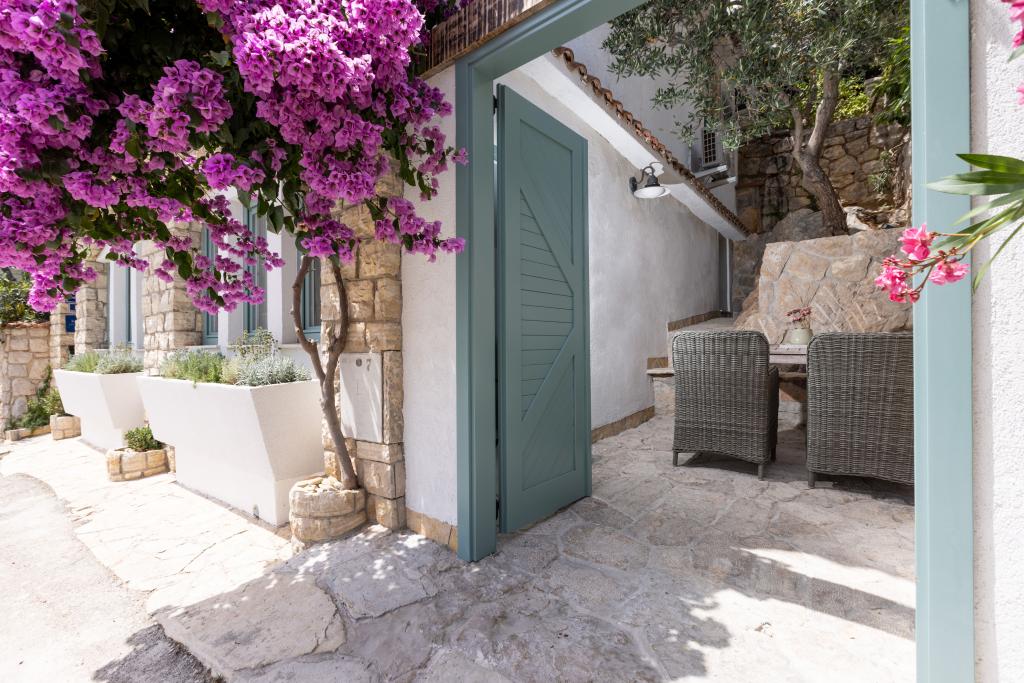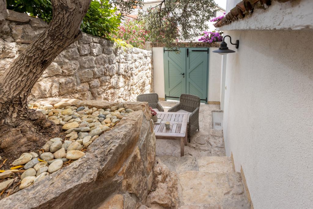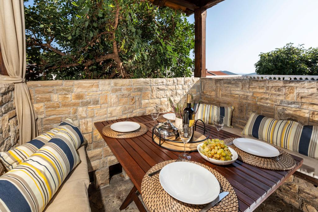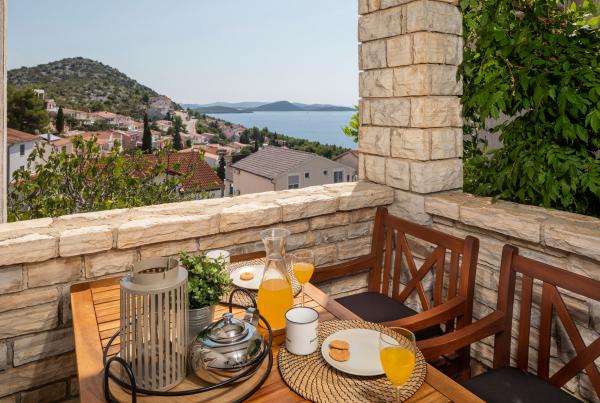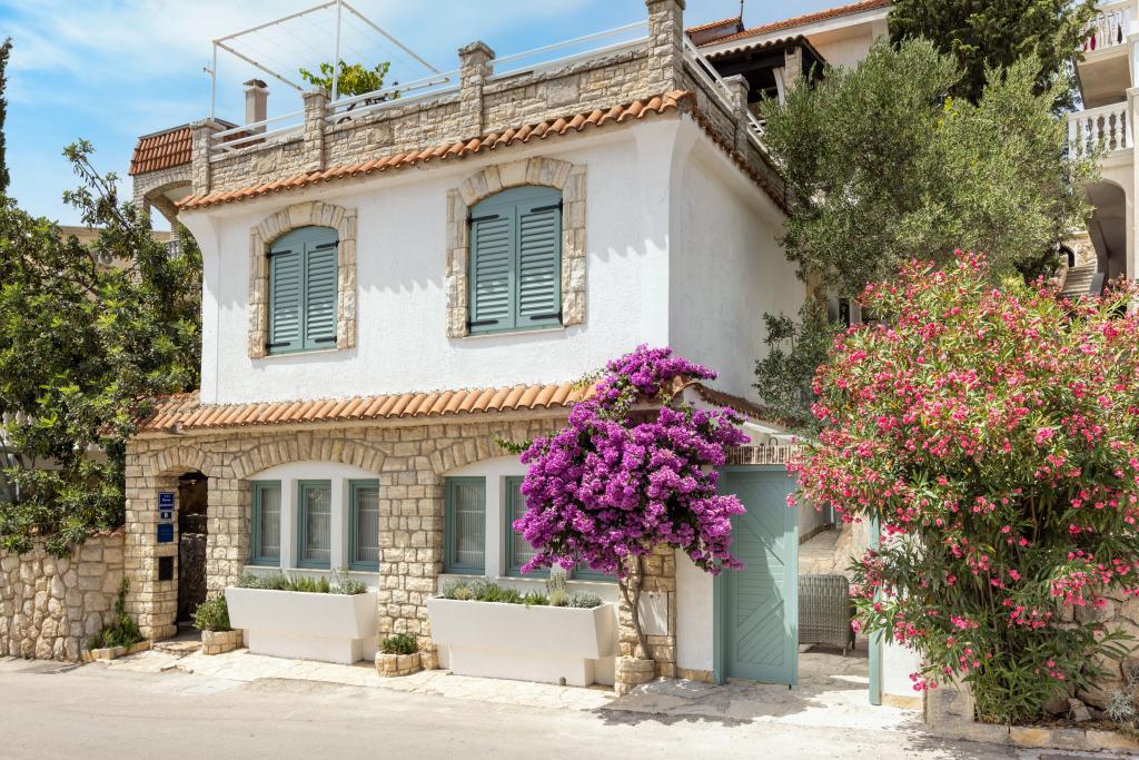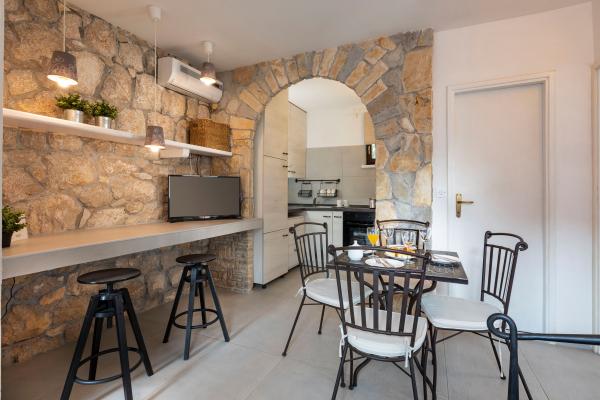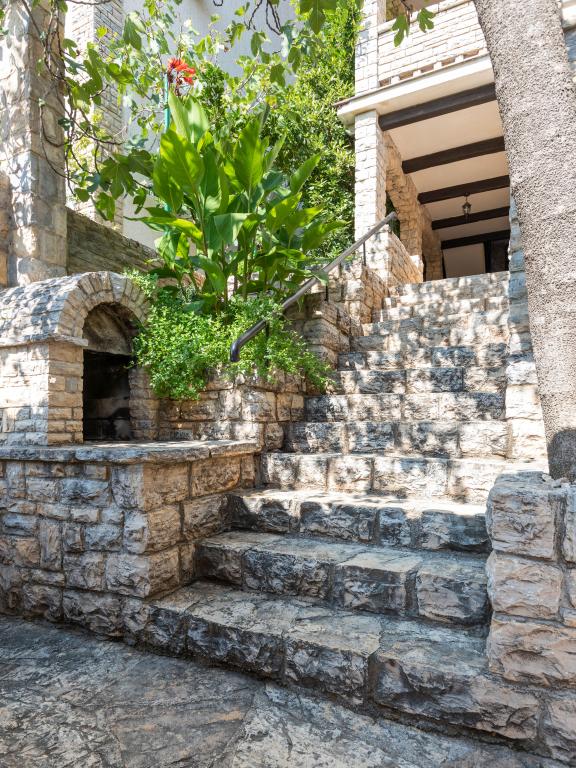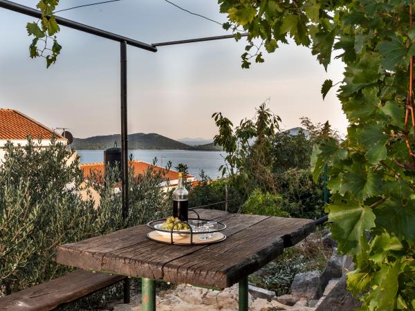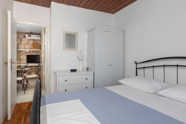 La maison elle-même est fantastique. Pierre entourée d'olives, de laurier, de figues et de fleurs. Il y a un coin avec barbecue, tandis que même les poules se cachent à l'arrière de la maison. L'appartement a une vue magnifique et tout ce dont vous avez besoin pour passer d'agréables vacances. Hôte sympathique. Le moyen le plus rapide pour se rendre à la plage est d'emprunter les escaliers. Deux ou trois minutes et vous êtes sur la plage. C'est un peu plus difficile. Il y a toujours un coin à l'ombre sur la plage. Il y a une boulangerie et un petit marché à proximité. Nous avons passé de très bons moments en vacances.