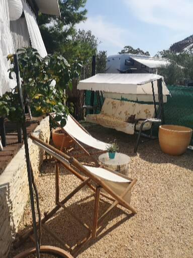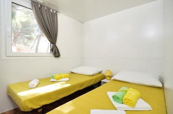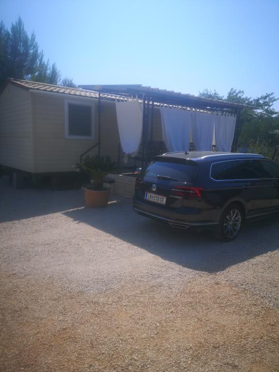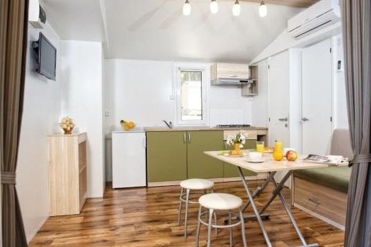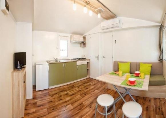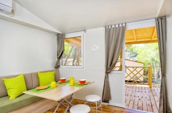 Mobil home climatisé à 30 m de la mer avec 2 chambres, cuisine, 2 salles de bain, séjour, terrasse, parking, douche extérieure, grill, transats et parking privé. Les animaux domestiques sont autorisés.