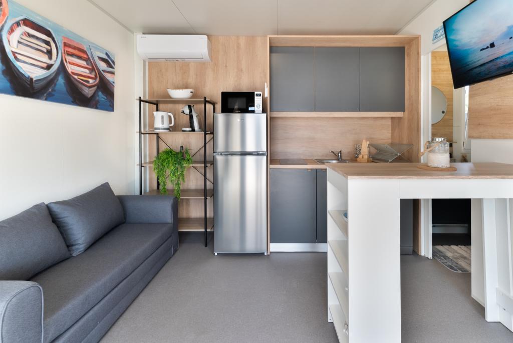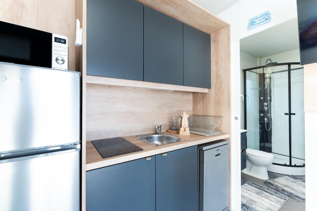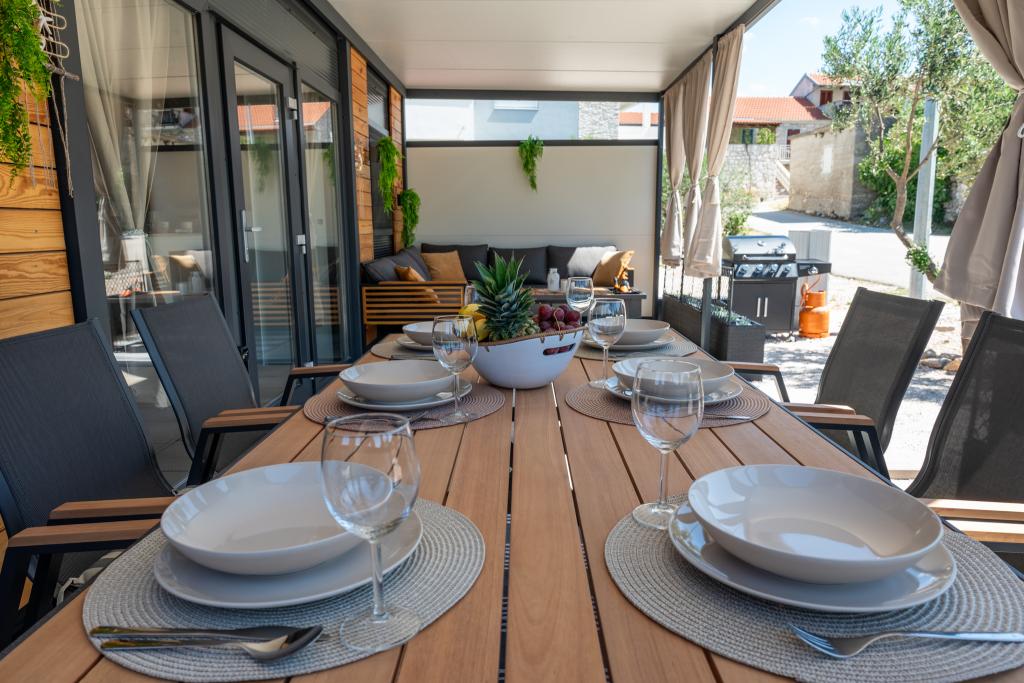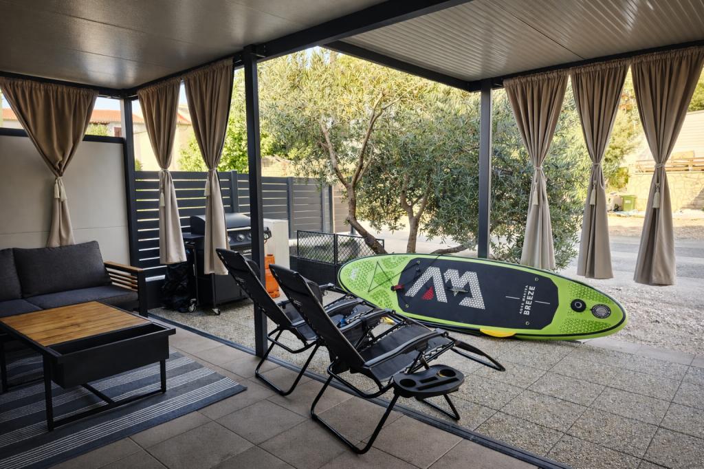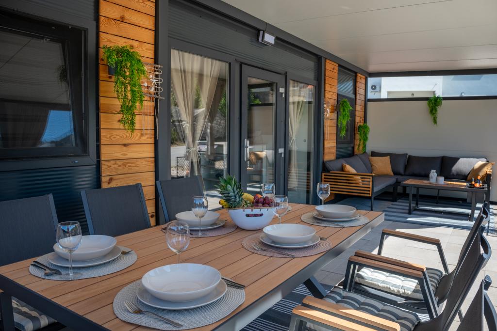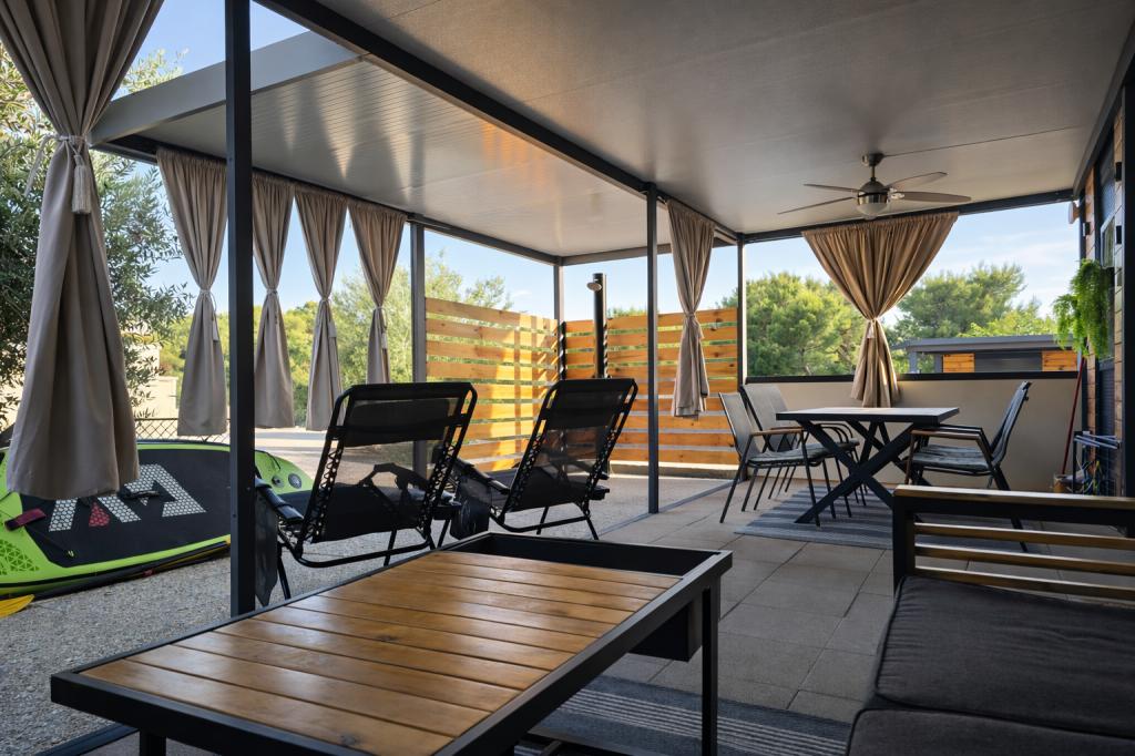 Découvrez des vacances balnéaires idéales dans nos charmants mobil-homes, situés à seulement 70 mètres de la plage de Porat, dans le paisible village de Drage ! Deux mobil-homes sont disponibles, pouvant accueillir chacun jusqu'à 4 adultes et 1 enfant. Ils disposent de deux chambres : l'une avec un lit double de 160 x 200 cm, l'autre avec un lit double de 140 x 200 cm. Un canapé-lit permet également d'accueillir un enfant jusqu'à 5 ans. Chaque chambre est équipée de lits et de linge de lit confortables pour vous garantir un repos bien mérité. Le salon, meublé avec goût et équipé d'une télévision, est parfait pour se détendre en soirée. La cuisine est entièrement équipée avec tous les appareils nécessaires : réfrigérateur, plaques de cuisson, cafetière, bouilloire et micro-ondes. Profitez de votre café du matin ou de votre verre du soir sur la spacieuse terrasse de 24 m² ! Pour toute demande d'information, veuillez utiliser le formulaire de contact.