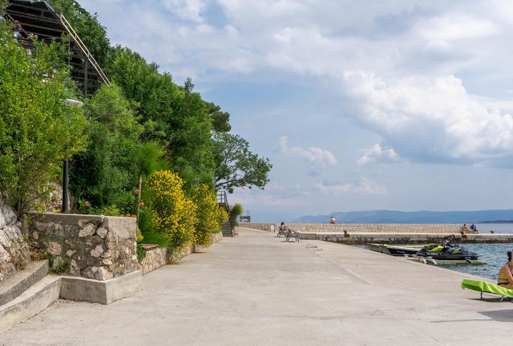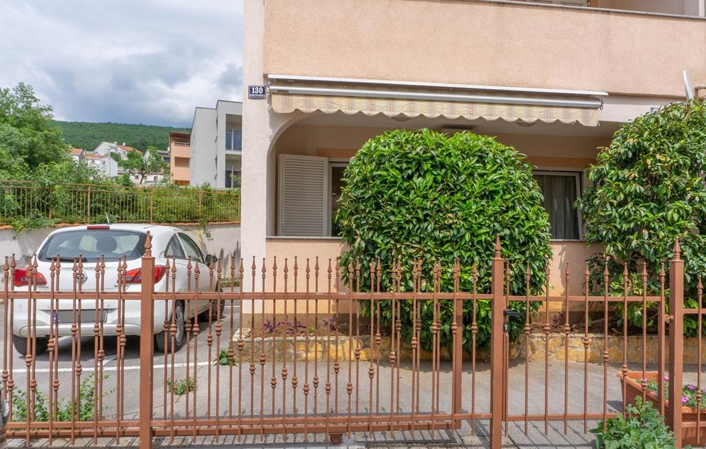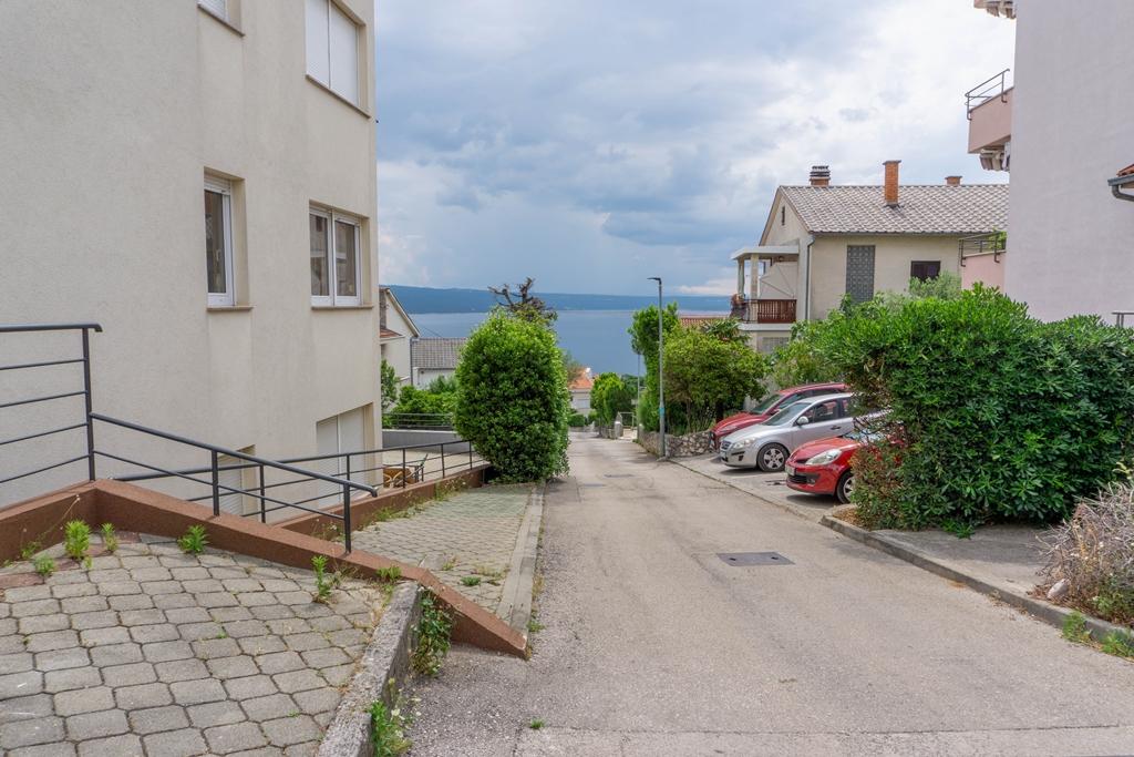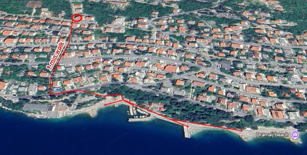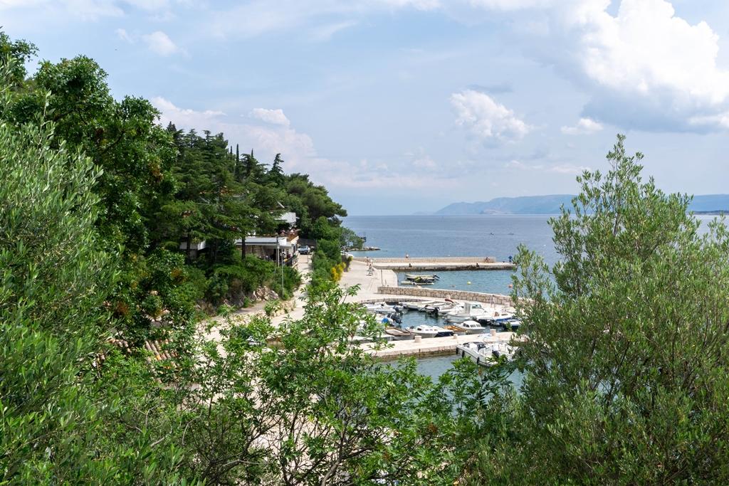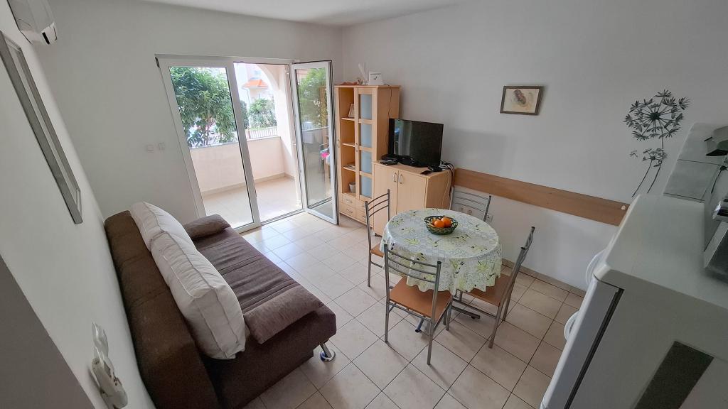 Appartement Lovor (31m²), RDC d'un immeuble résidentiel, calme à Dramalj. 450m de la mer, proche Thalassotherapia, parc Adrénaline et sentiers. Idéal pour 2-3 adultes ou famille. Comprend chambre (160x200), salle de bain, terrasse et cuisine équipée (frigo, cuisinière, micro-ondes, bouilloire, machine à café, grille-pain, vaisselle) avec séjour (TV, canapé-lit 75x200/150x200). Clim, Wi-Fi gratuit et parking privé.