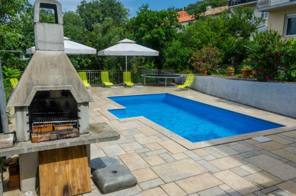 Appartements situés dans un quartier calme de Dramlje, avec une vue imprenable sur la mer et tout le Kvarner. Places de parking juste à côté de l'établissement. À côté de la piscine, une terrasse ensoleillée avec transats et parasols est à votre disposition. À proximité immédiate, vous trouverez un foyer pour les grillades et une terrasse couverte pour les repas.