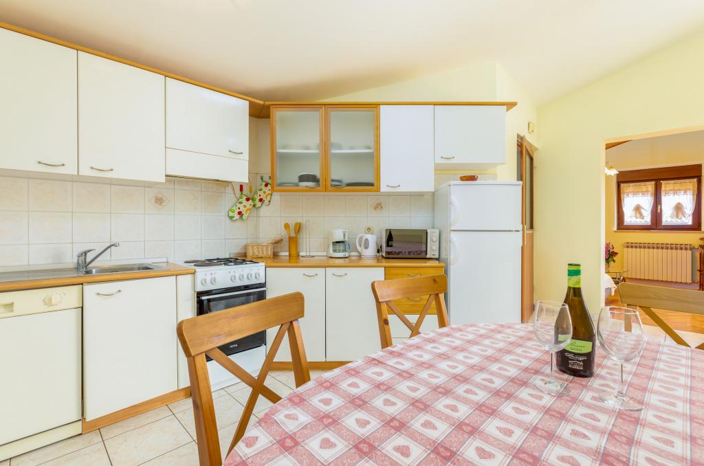 Appartement de vacances spacieux, entièrement équipé et moderne, situé dans un quartier calme de Valbandon. Il comprend une chambre avec un lit double, une chambre avec deux lits simples, une cuisine avec salle à manger, un salon, une salle de bain et une belle grande terrasse. Il est situé au premier étage de la maison familiale où nous vivons et dispose d'une entrée indépendante.