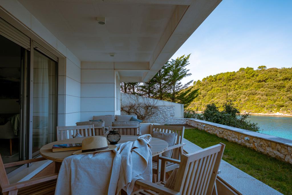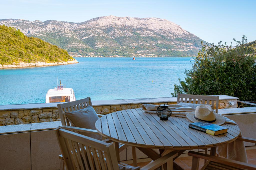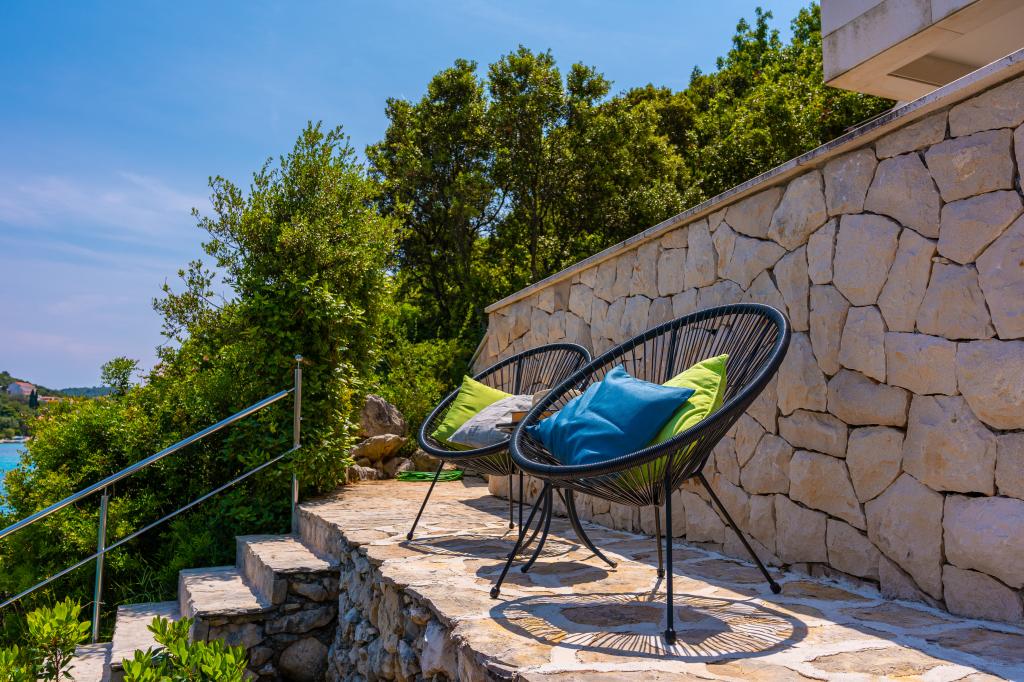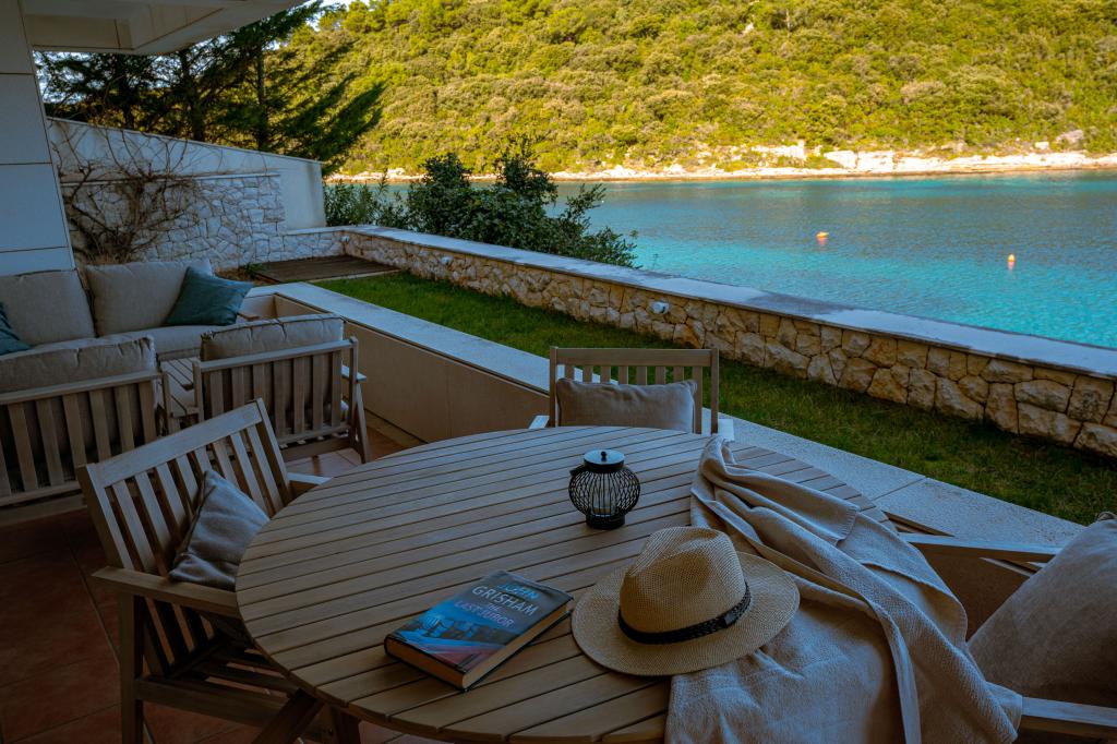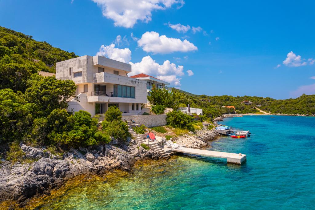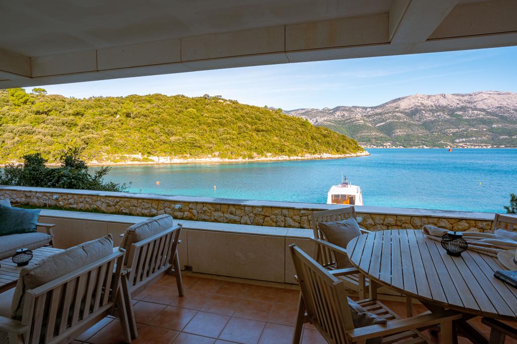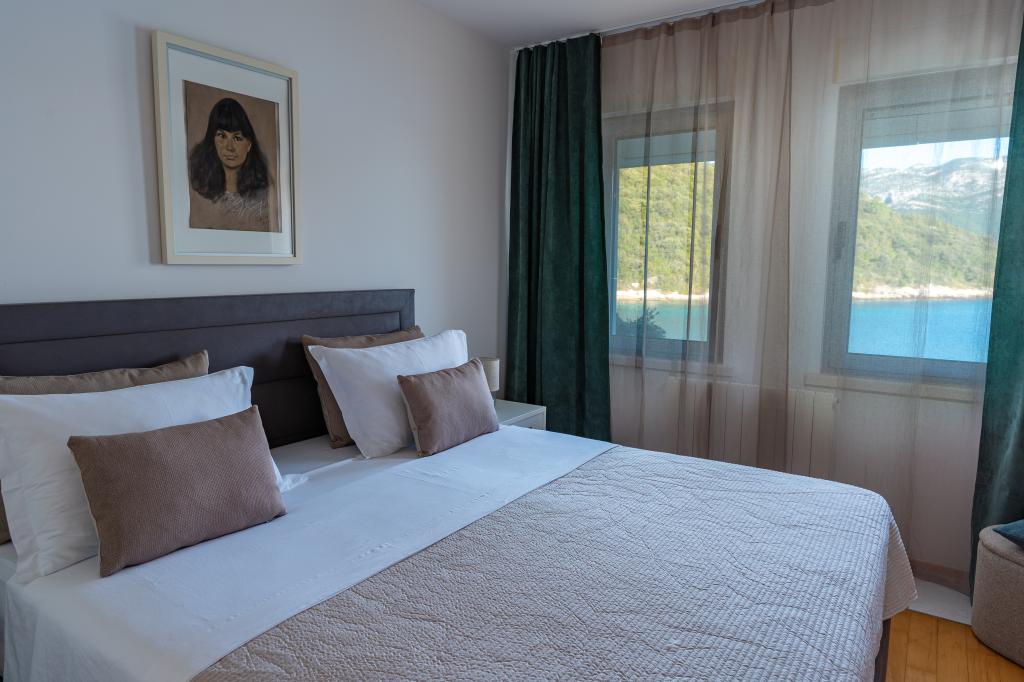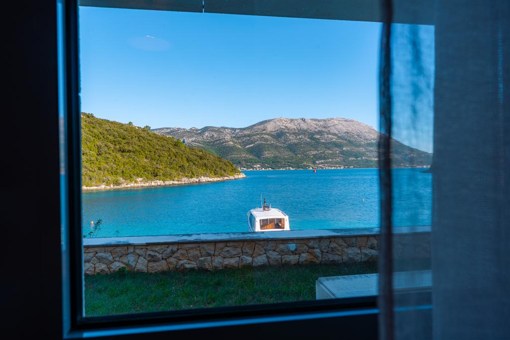 Villa Avantgarde - appartement directement en bord de mer pour 4 personnes - baie très calme - île de Korčula - Croatie C'est l'œuvre d'un célèbre architecte croate et de renommée mondiale. Il est situé dans une baie tranquille, à env. A 4 km du centre ville. Dans la villa, vous avez à votre disposition un appartement confortable d'env. 100 m2, qui se compose de 2 chambres, une salle de bain et un salon avec une cuisine bien équipée, une salle à manger et un salon, d'où on accède à une grande terrasse avec accès direct à la plage privée. La plage est à 9 m de l'appartement. Il n'y a qu'un seul appartement à louer dans la Villa. Il est entouré de pelouses bien entretenues, de verdure, du chant des oiseaux et de la mer. Un parking privé fermé est à la disposition des clients. La chambre, le salon, la salle à manger et la terrasse font face directement à la mer. Il peut être utilisé toute l'année car il est équipé du chauffage central.