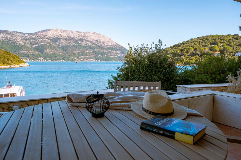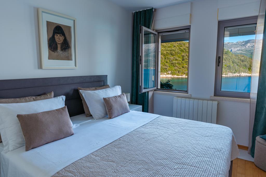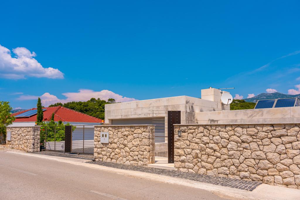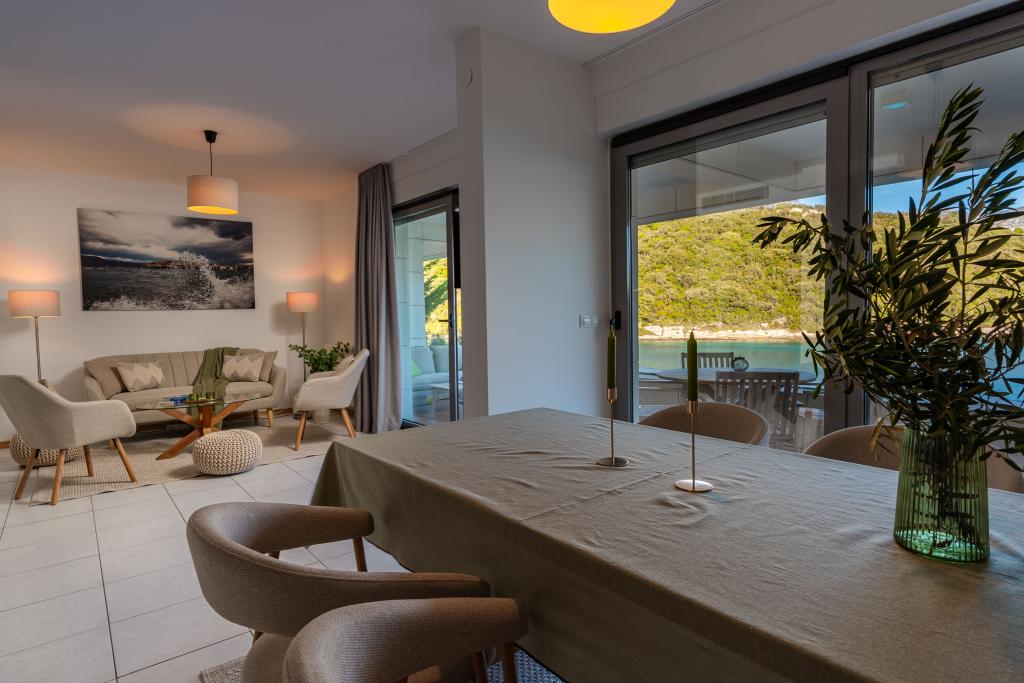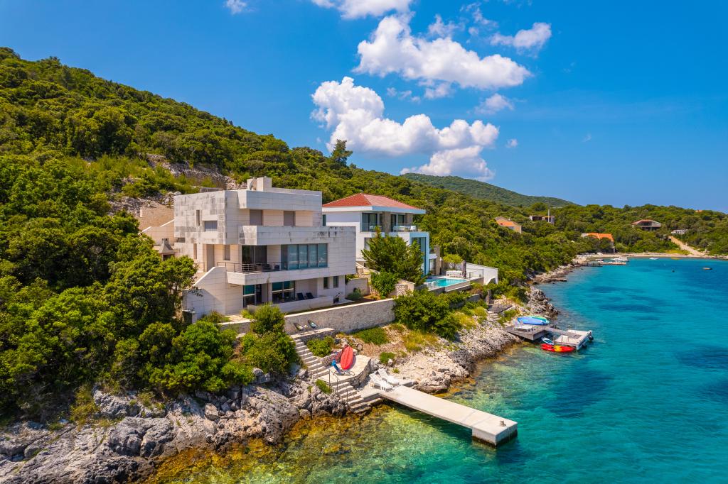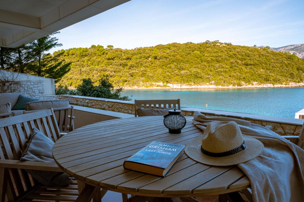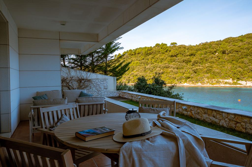 Villa Avantgarde - appartement directement en bord de mer pour 4 personnes - baie très calme - île de Korčula - Croatie C'est l'œuvre d'un célèbre architecte croate et de renommée mondiale. Il est situé dans une baie tranquille, à env. A 4 km du centre ville. Dans la villa, vous avez à votre disposition un appartement confortable d'env. 100 m2, qui se compose de 2 chambres, une salle de bain et un salon avec une cuisine bien équipée, une salle à manger et un salon, d'où on accède à une grande terrasse avec accès direct à la plage privée. La plage est à 9 m de l'appartement. Il n'y a qu'un seul appartement à louer dans la Villa. Il est entouré de pelouses bien entretenues, de verdure, du chant des oiseaux et de la mer. Un parking privé fermé est à la disposition des clients. La chambre, le salon, la salle à manger et la terrasse font face directement à la mer. Il peut être utilisé toute l'année car il est équipé du chauffage central.