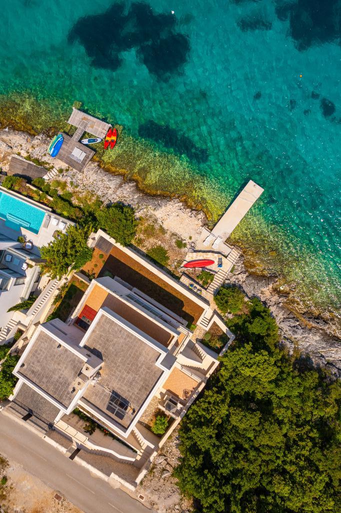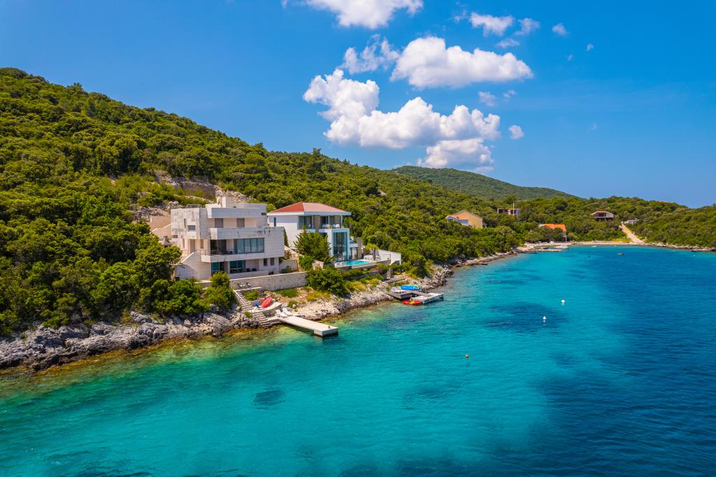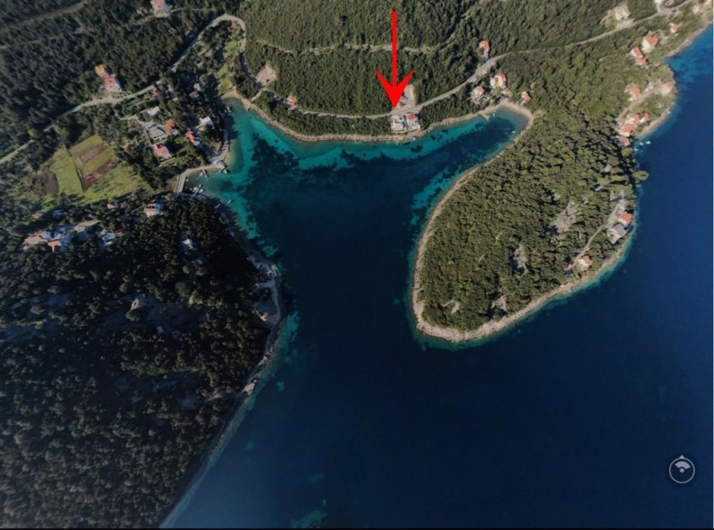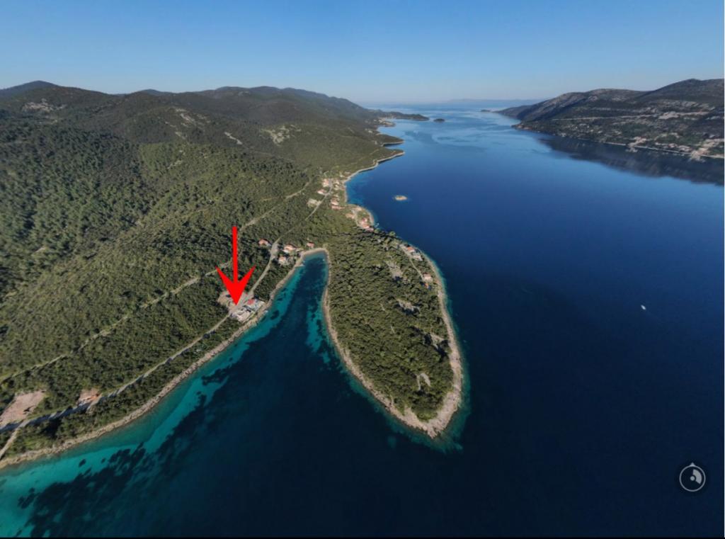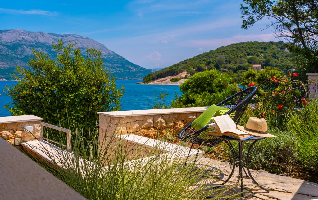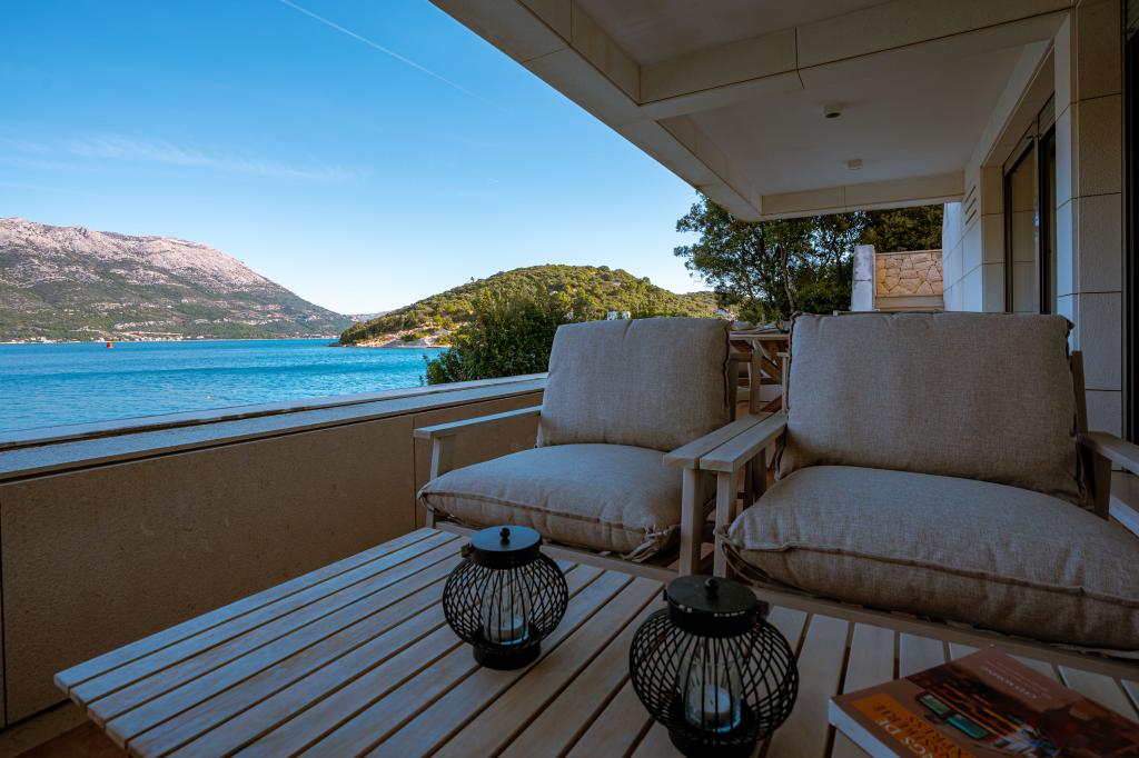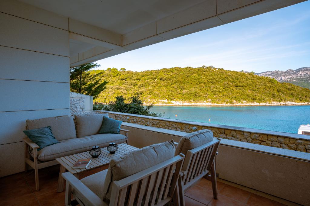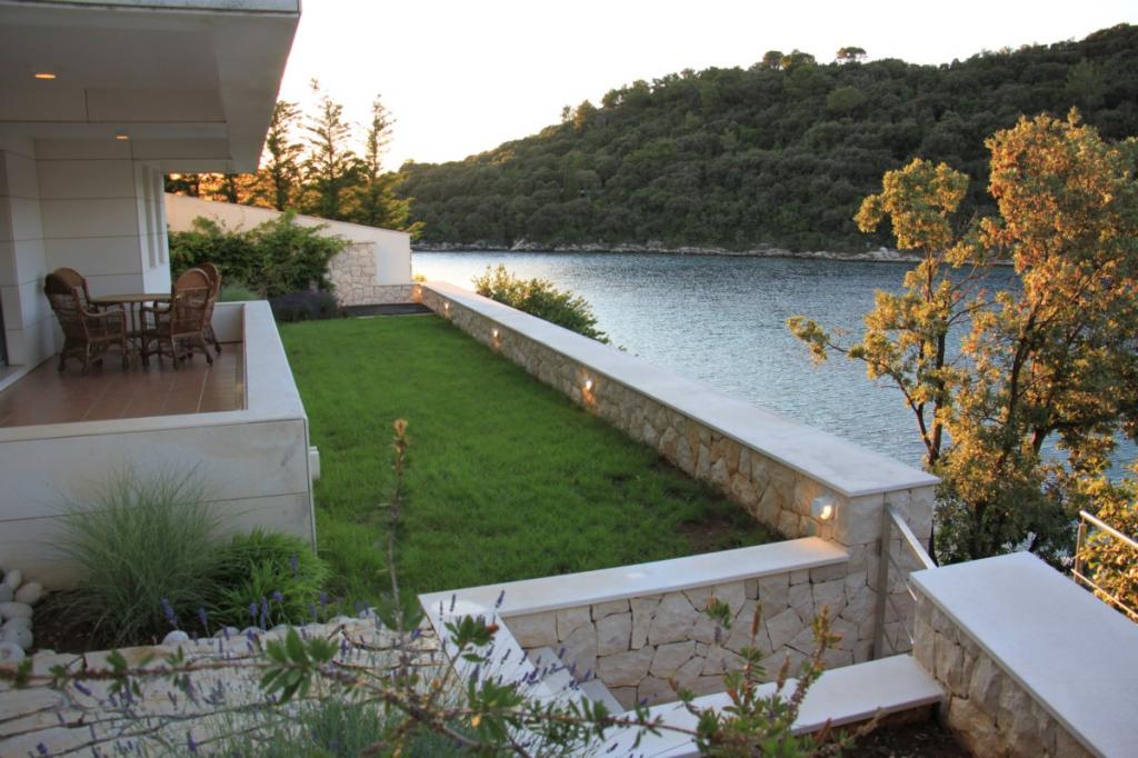 Villa Avantgarde - appartement directement en bord de mer pour 4 personnes - baie très calme - île de Korčula - Croatie C'est l'œuvre d'un célèbre architecte croate et de renommée mondiale. Il est situé dans une baie tranquille, à env. A 4 km du centre ville. Dans la villa, vous avez à votre disposition un appartement confortable d'env. 100 m2, qui se compose de 2 chambres, une salle de bain et un salon avec une cuisine bien équipée, une salle à manger et un salon, d'où on accède à une grande terrasse avec accès direct à la plage privée. La plage est à 9 m de l'appartement. Il n'y a qu'un seul appartement à louer dans la Villa. Il est entouré de pelouses bien entretenues, de verdure, du chant des oiseaux et de la mer. Un parking privé fermé est à la disposition des clients. La chambre, le salon, la salle à manger et la terrasse font face directement à la mer. Il peut être utilisé toute l'année car il est équipé du chauffage central.