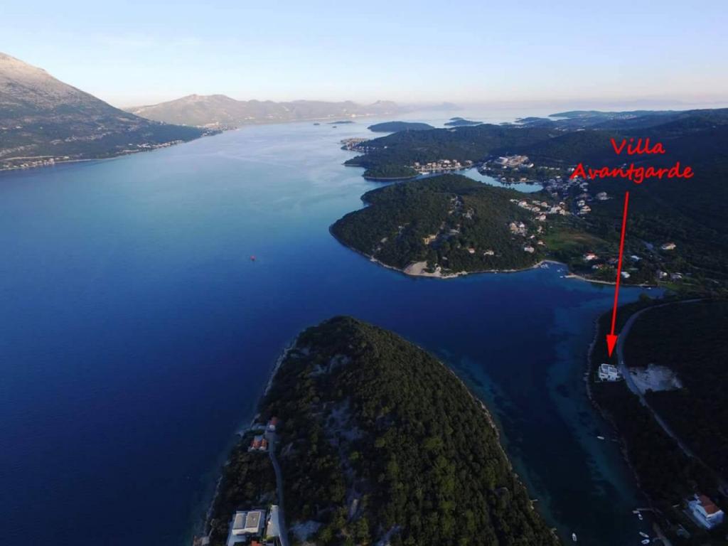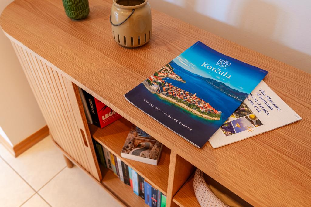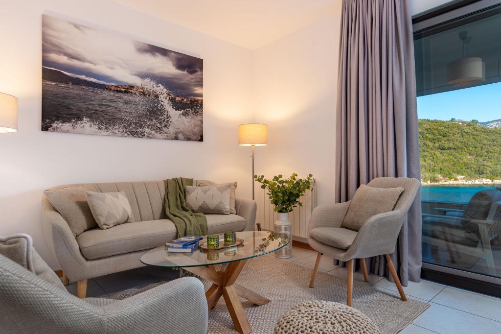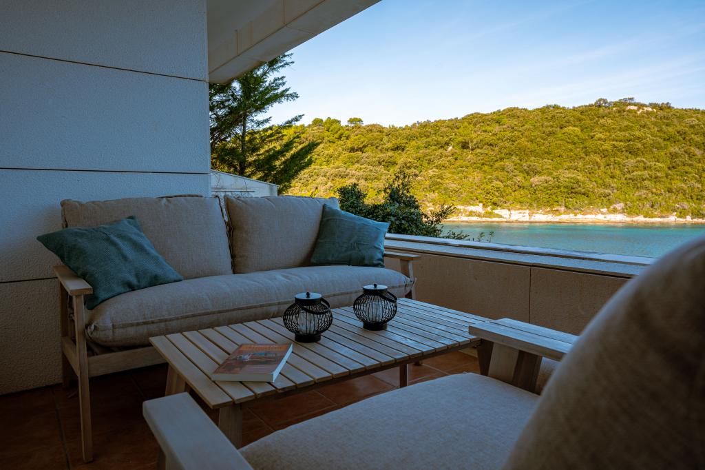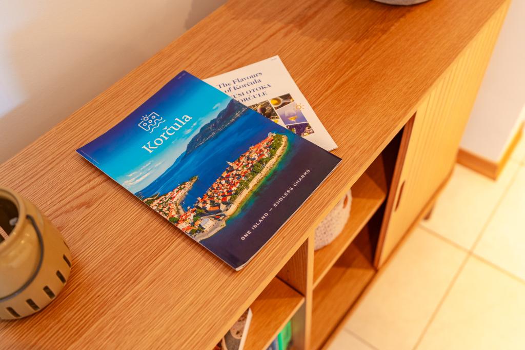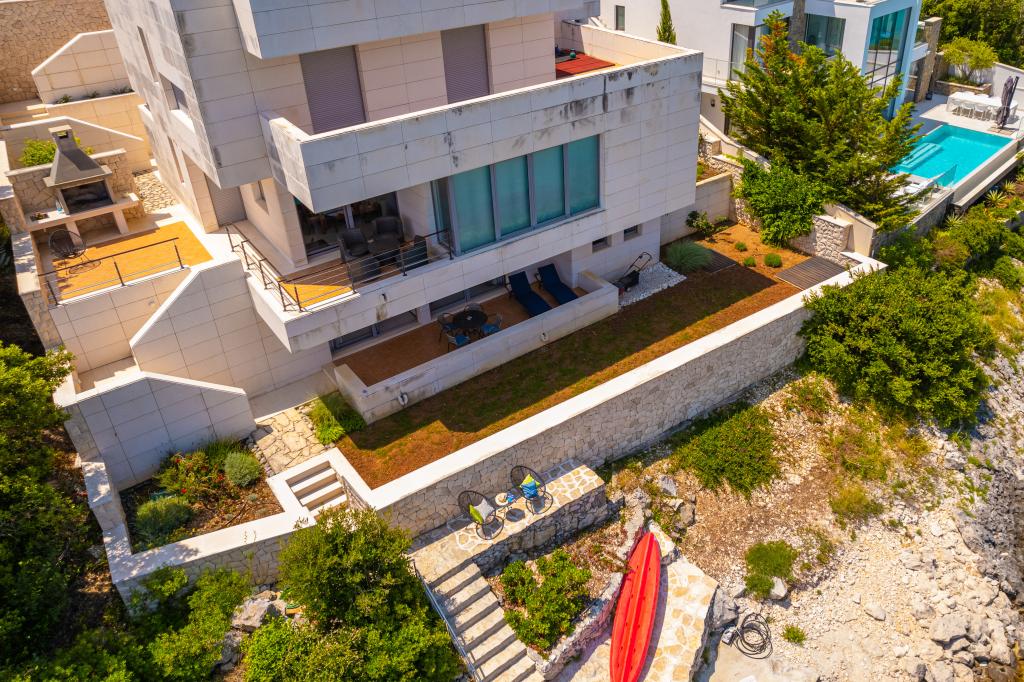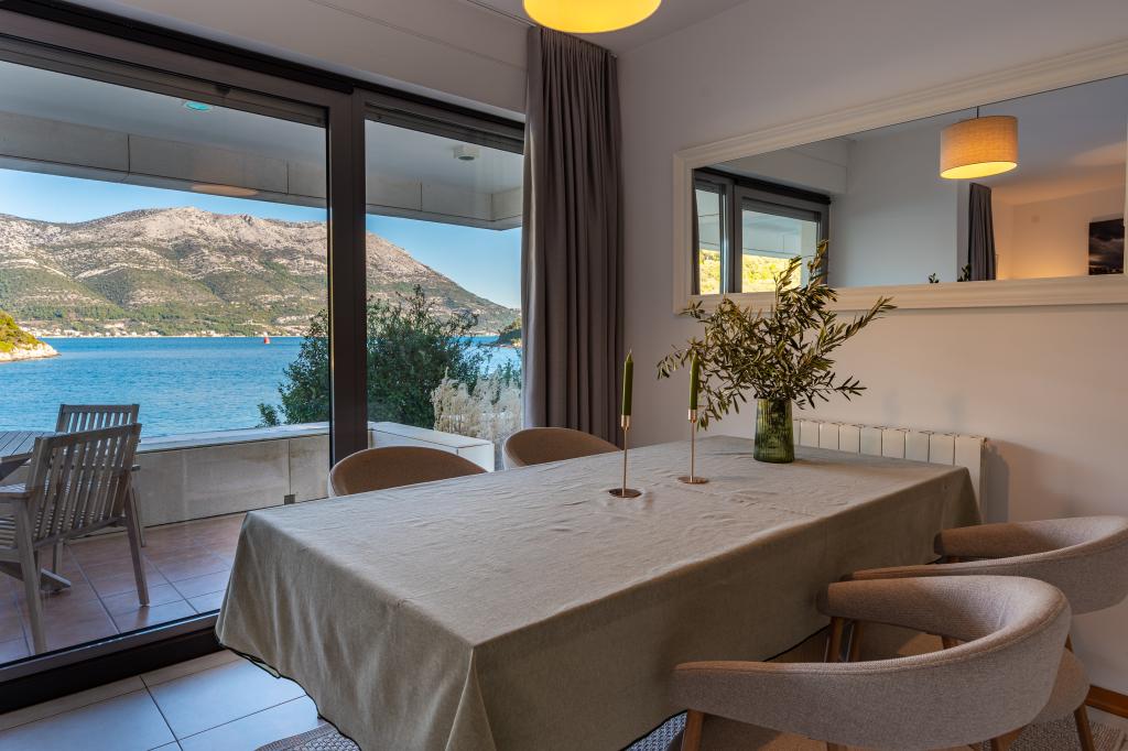 Villa Avantgarde - appartement directement en bord de mer pour 4 personnes - baie très calme - île de Korčula - Croatie C'est l'œuvre d'un célèbre architecte croate et de renommée mondiale. Il est situé dans une baie tranquille, à env. A 4 km du centre ville. Dans la villa, vous avez à votre disposition un appartement confortable d'env. 100 m2, qui se compose de 2 chambres, une salle de bain et un salon avec une cuisine bien équipée, une salle à manger et un salon, d'où on accède à une grande terrasse avec accès direct à la plage privée. La plage est à 9 m de l'appartement. Il n'y a qu'un seul appartement à louer dans la Villa. Il est entouré de pelouses bien entretenues, de verdure, du chant des oiseaux et de la mer. Un parking privé fermé est à la disposition des clients. La chambre, le salon, la salle à manger et la terrasse font face directement à la mer. Il peut être utilisé toute l'année car il est équipé du chauffage central.