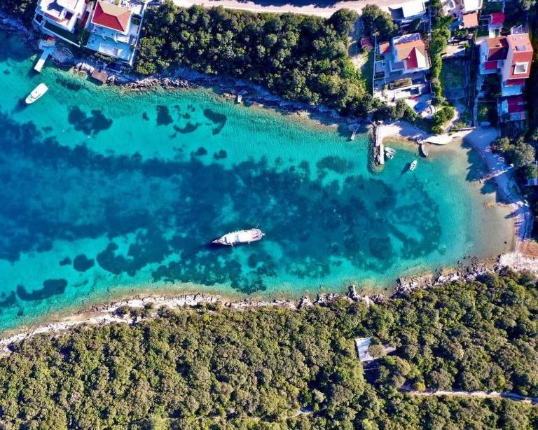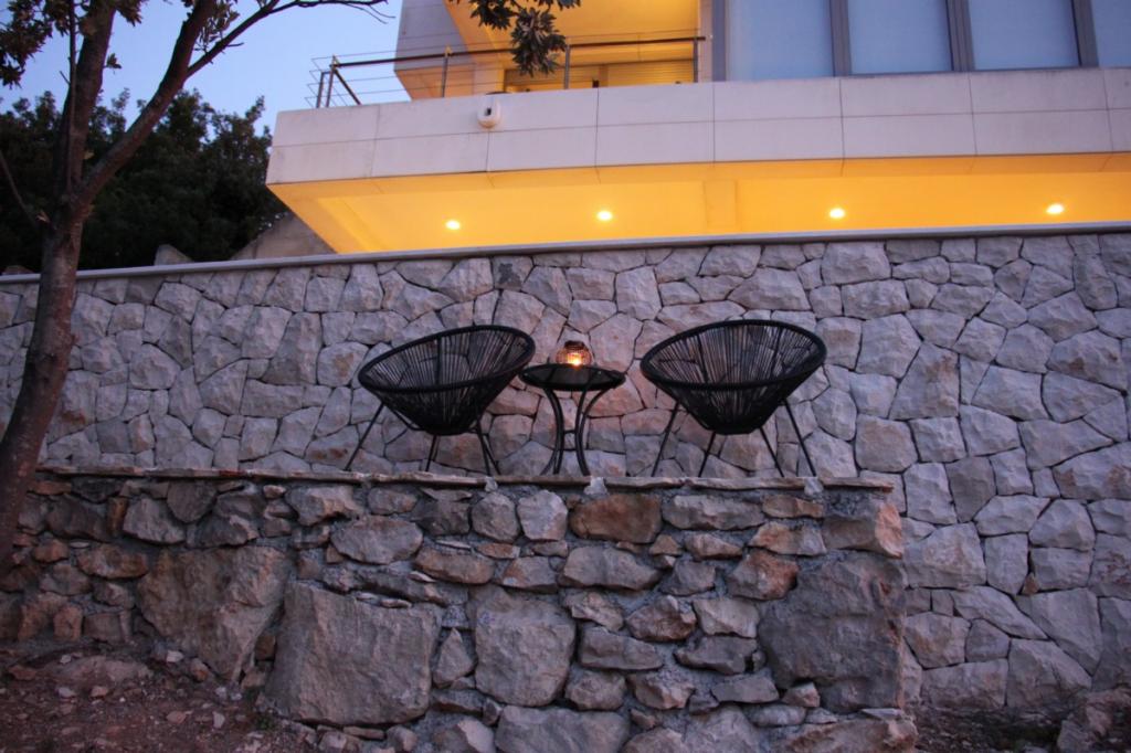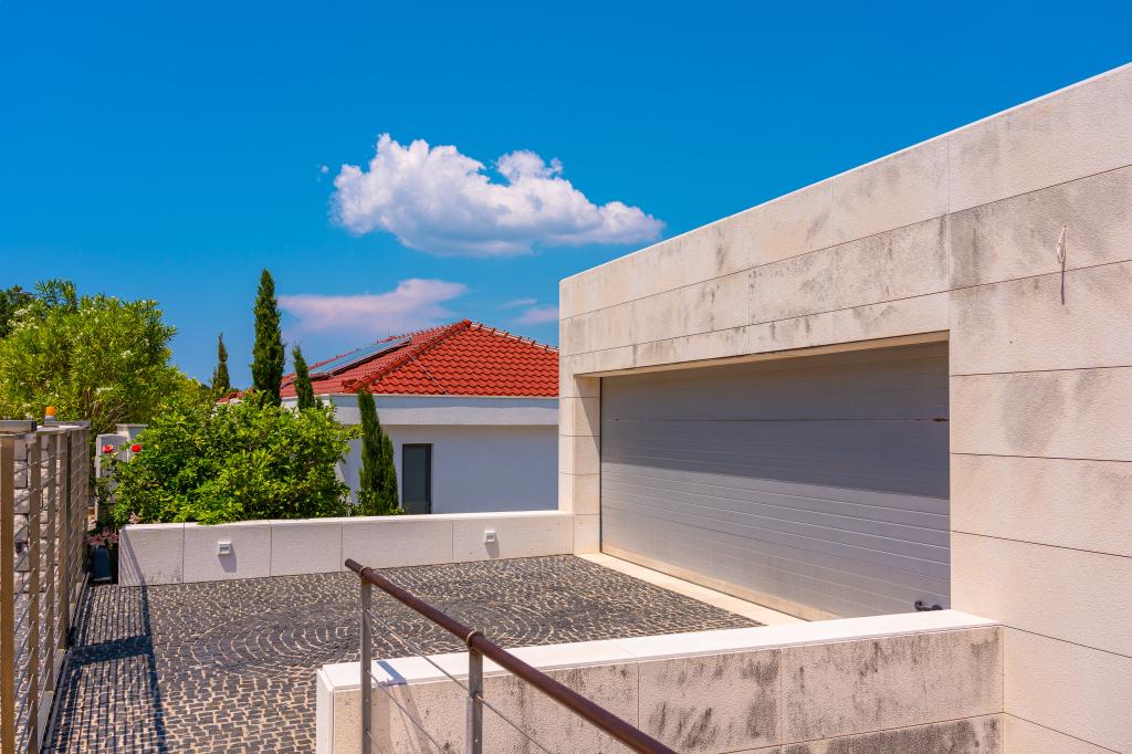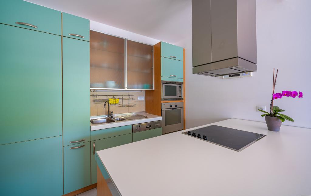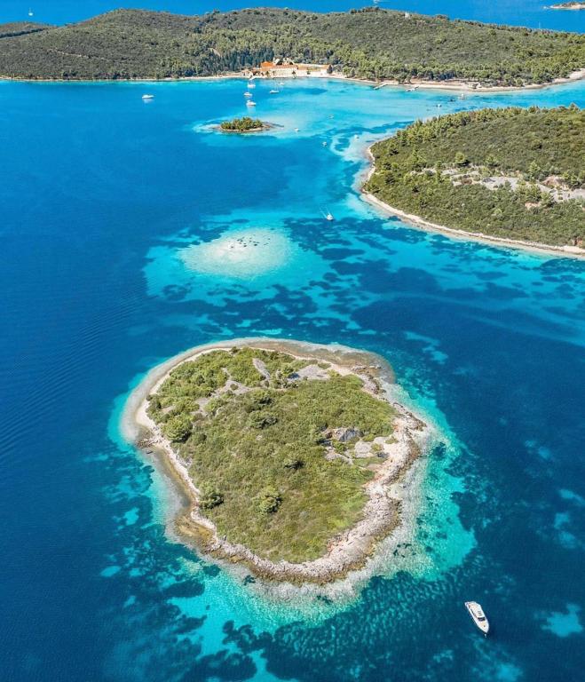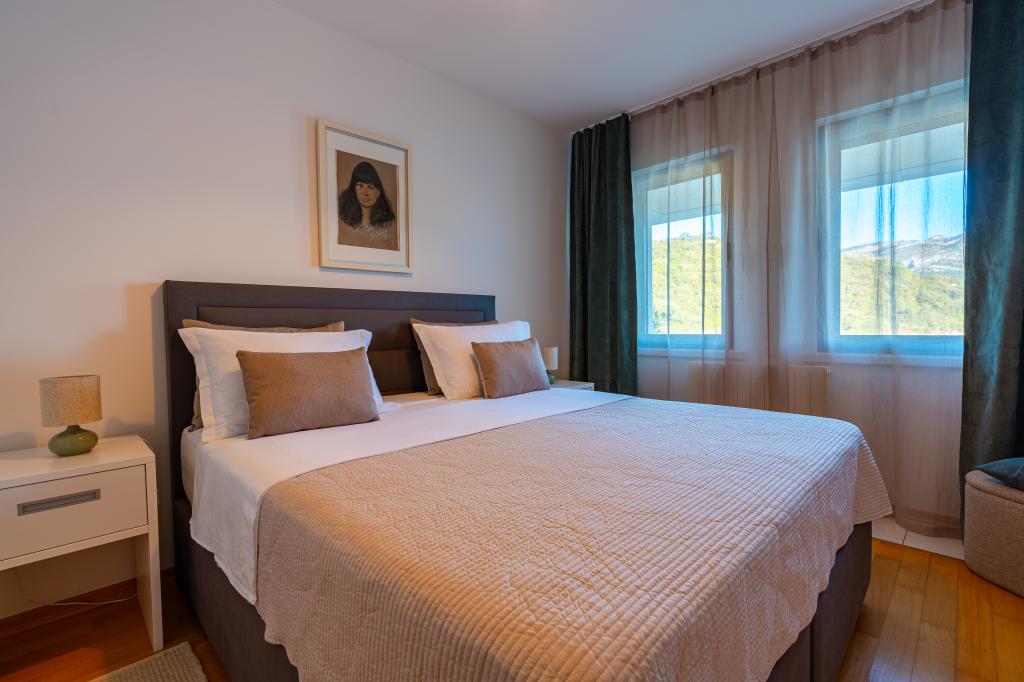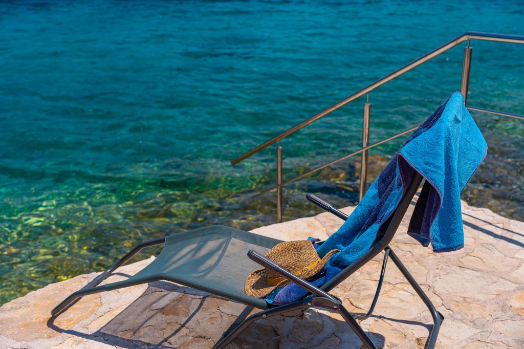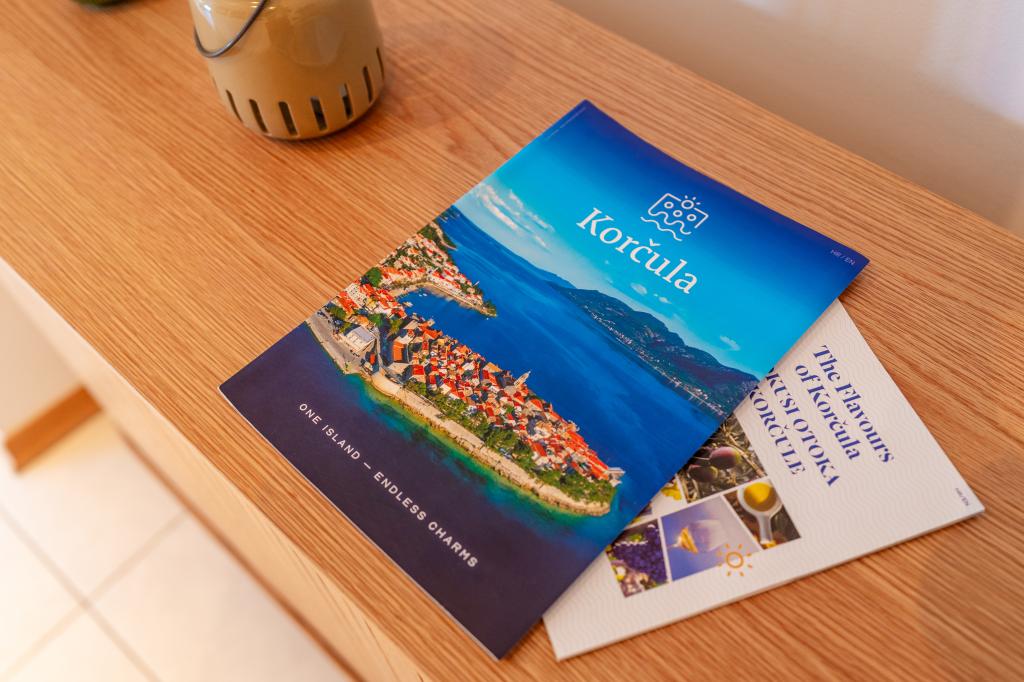 Villa Avantgarde - appartement directement en bord de mer pour 4 personnes - baie très calme - île de Korčula - Croatie C'est l'œuvre d'un célèbre architecte croate et de renommée mondiale. Il est situé dans une baie tranquille, à env. A 4 km du centre ville. Dans la villa, vous avez à votre disposition un appartement confortable d'env. 100 m2, qui se compose de 2 chambres, une salle de bain et un salon avec une cuisine bien équipée, une salle à manger et un salon, d'où on accède à une grande terrasse avec accès direct à la plage privée. La plage est à 9 m de l'appartement. Il n'y a qu'un seul appartement à louer dans la Villa. Il est entouré de pelouses bien entretenues, de verdure, du chant des oiseaux et de la mer. Un parking privé fermé est à la disposition des clients. La chambre, le salon, la salle à manger et la terrasse font face directement à la mer. Il peut être utilisé toute l'année car il est équipé du chauffage central.
