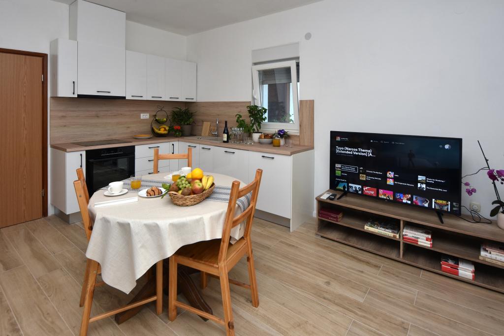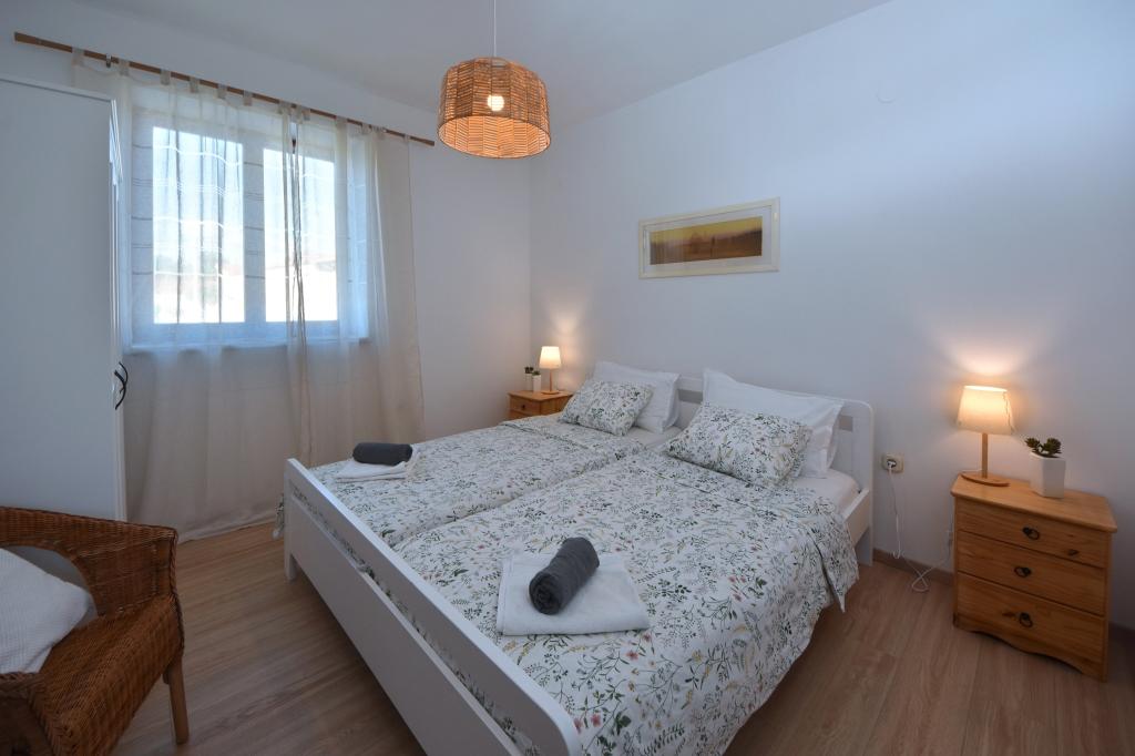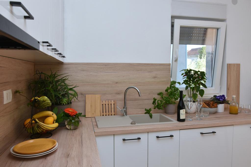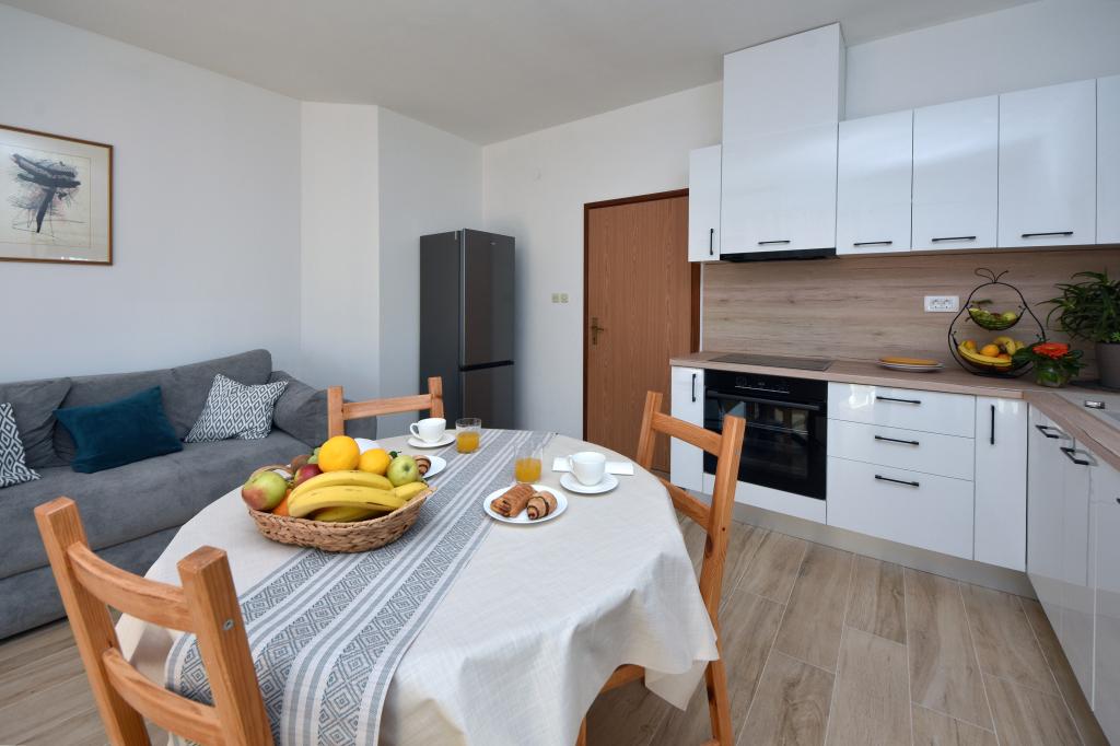 L'appartement est situé dans la maison familiale, entourée d'oliviers, de fleurs et d'oiseaux gazouillants. Le client bénéficie d'une intimité totale car il n'y a pas de bâtiments devant ou à côté de la maison. Si vous souhaitez un coin tranquille, c'est l'endroit idéal pour vous reposer. A proximité de la maison il y a une gare routière, des restaurants, une pharmacie, une aire de jeux et la plage est à 700 mètres. Il faut 2-3 minutes pour rejoindre la plage en voiture et environ 10 minutes à pied.