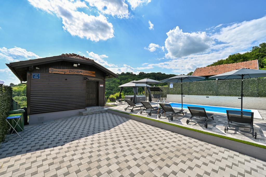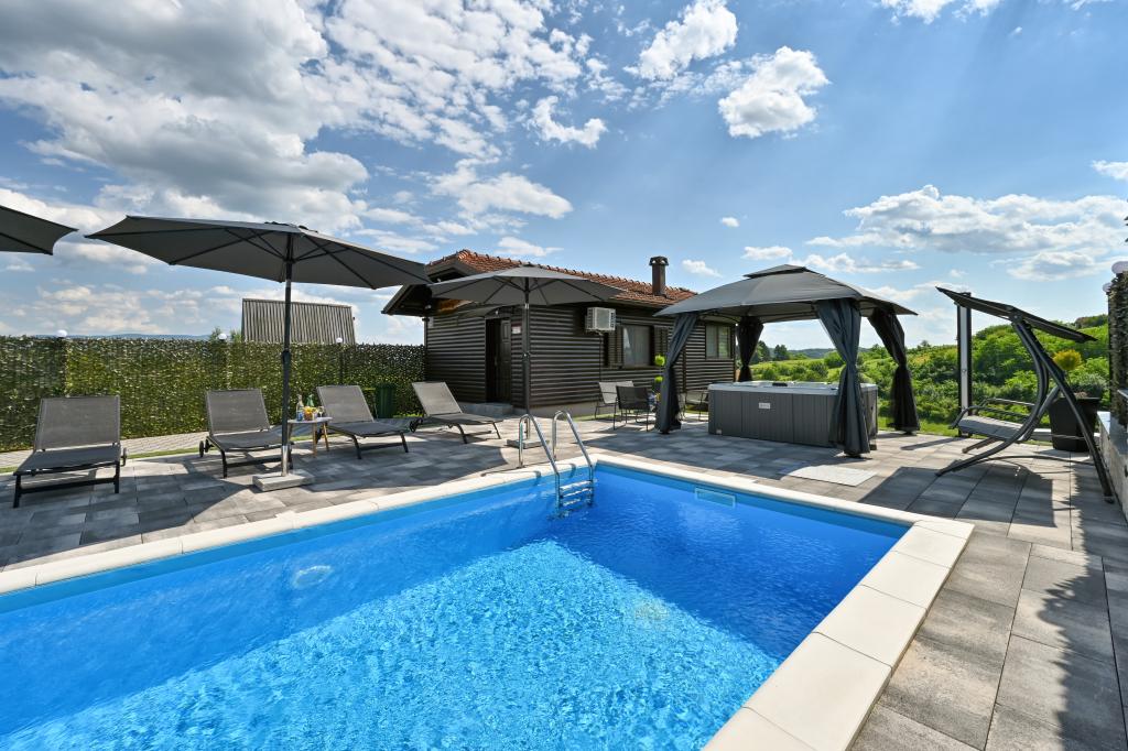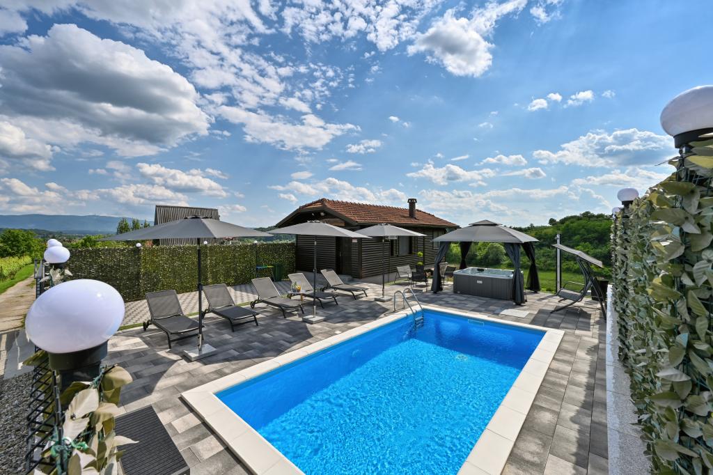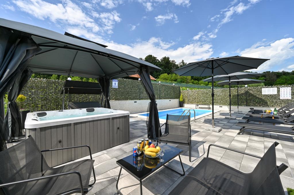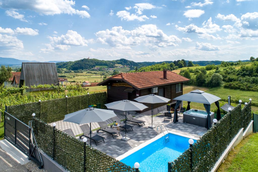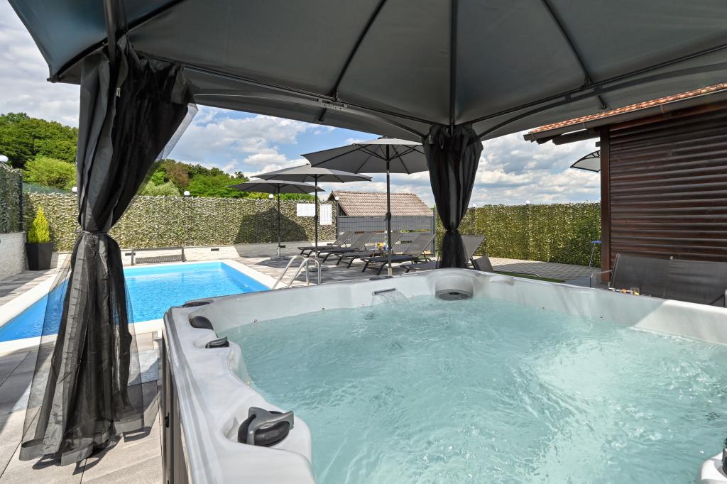 - Maison de vacances trois étoiles dans un quartier calme de Zagorje croate. - Parking privé - Grande terrasse : piscine désormais avec dosage automatique du pH et du chlore pour une eau impeccablement propre et saine, spa/jacuzzi pour 5 personnes - Terrasse équipée de 5 transats, salon de jardin, banquette, douche solaire extérieure, parasols, balançoire de jardin pour 3 personnes - Partie haute de la maison : salle à manger, cuisine, bar, TV, canapé lit, frigo, lave-linge, chambre lit double avec TV, placards, salle de bain/wc, avec une belle vue - Partie basse : terrasse avec un belle vue, table et chaises pour 8 personnes, grill, chambre lit, armoires, chambre lit double avec TV, - La maison est située à 7 minutes de l'autoroute A2 Zagreb-Macelj