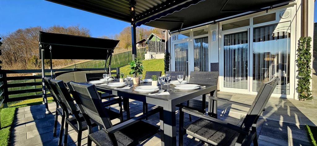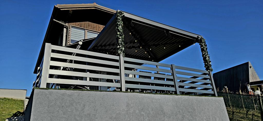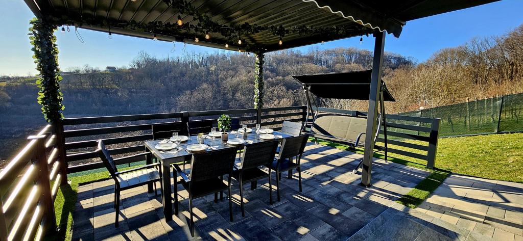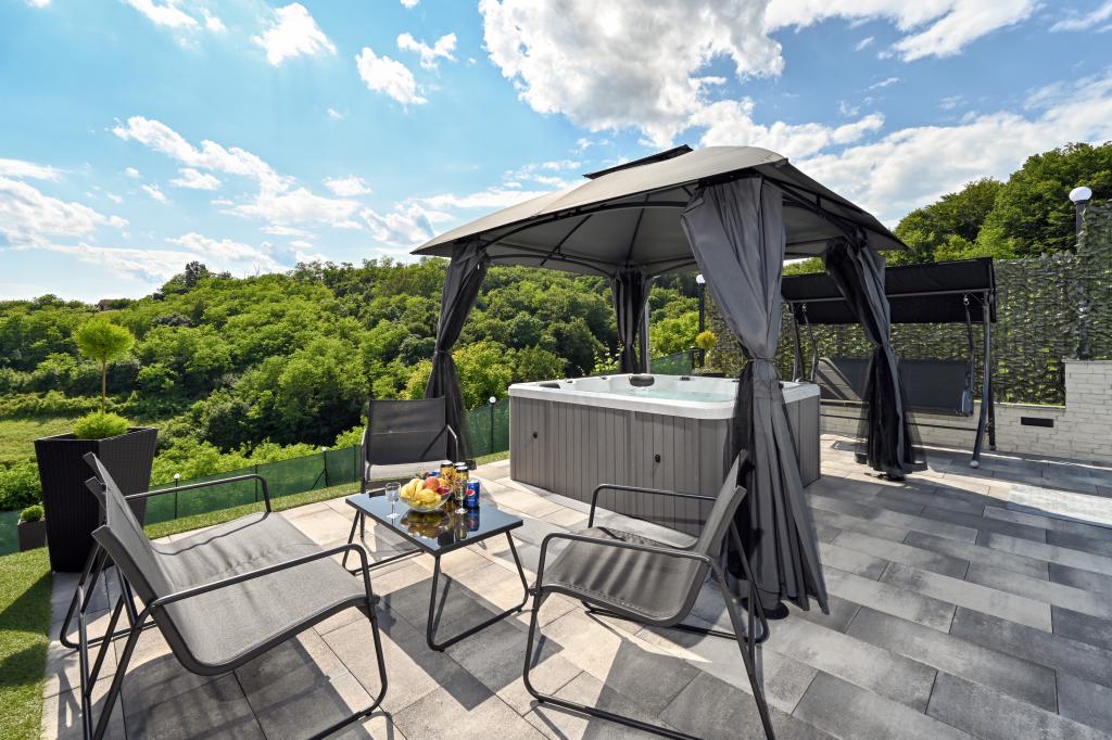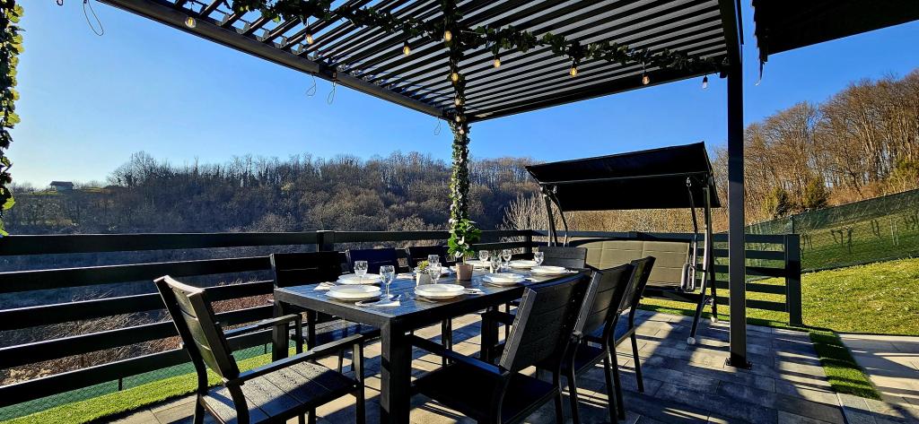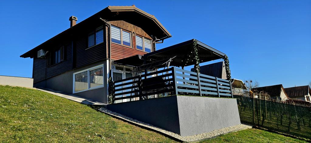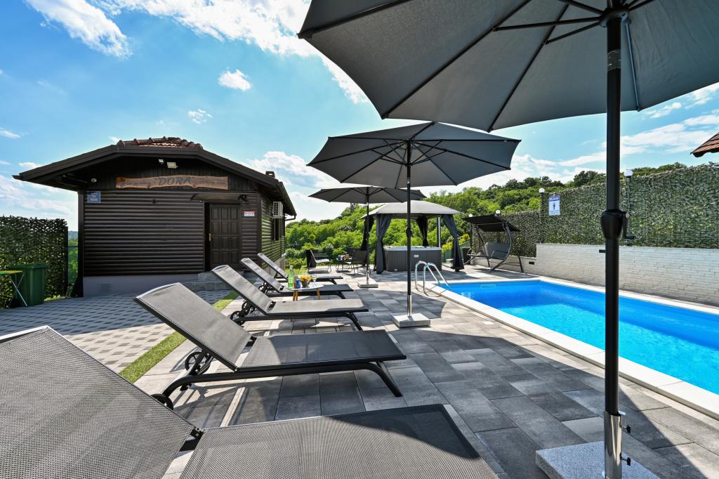 - Maison de vacances trois étoiles dans un quartier calme de Zagorje croate. - Parking privé - Grande terrasse : piscine désormais avec dosage automatique du pH et du chlore pour une eau impeccablement propre et saine, spa/jacuzzi pour 5 personnes - Terrasse équipée de 5 transats, salon de jardin, banquette, douche solaire extérieure, parasols, balançoire de jardin pour 3 personnes - Partie haute de la maison : salle à manger, cuisine, bar, TV, canapé lit, frigo, lave-linge, chambre lit double avec TV, placards, salle de bain/wc, avec une belle vue - Partie basse : terrasse avec un belle vue, table et chaises pour 8 personnes, grill, chambre lit, armoires, chambre lit double avec TV, - La maison est située à 7 minutes de l'autoroute A2 Zagreb-Macelj