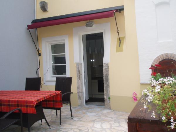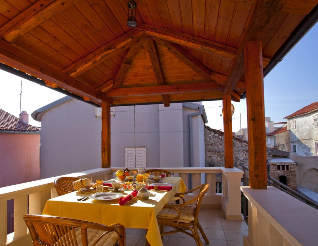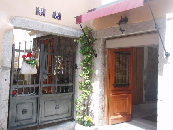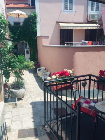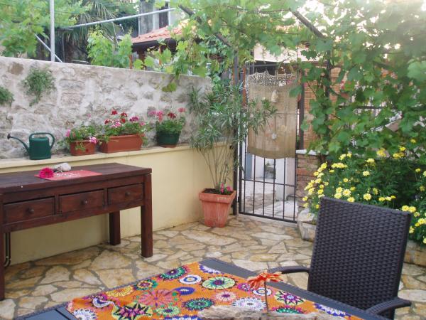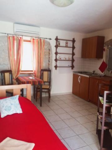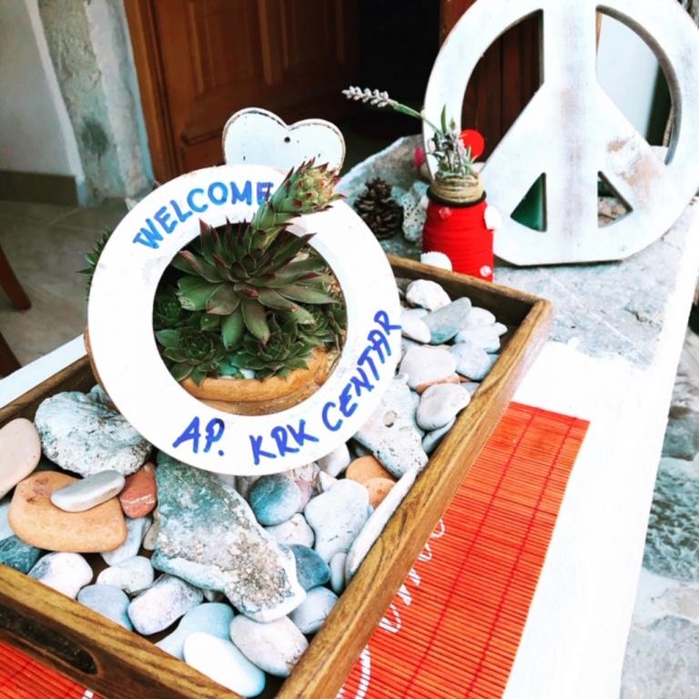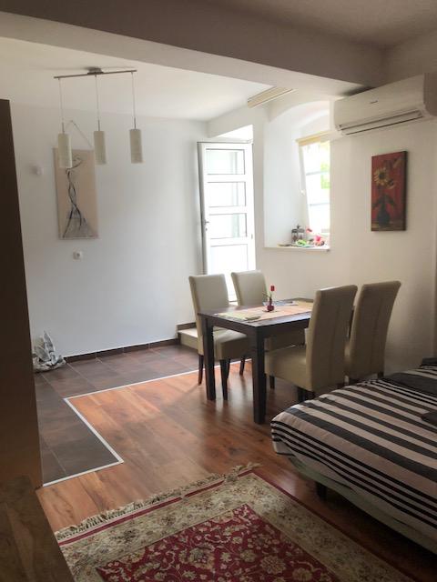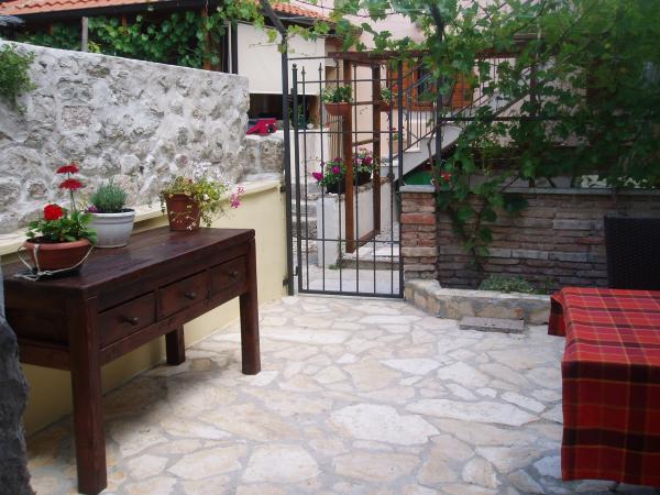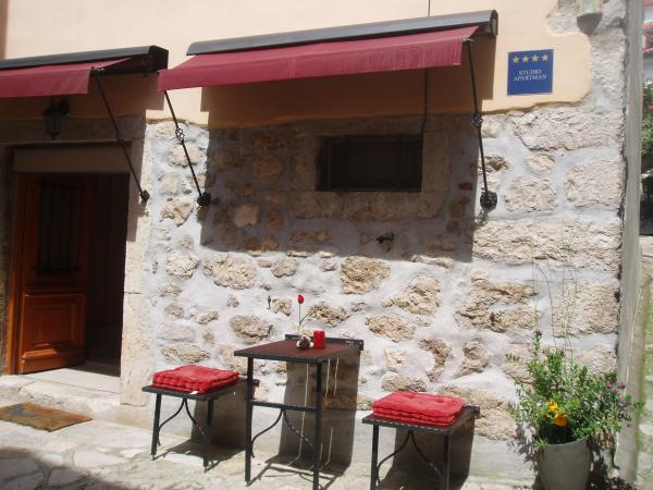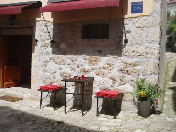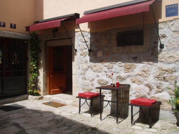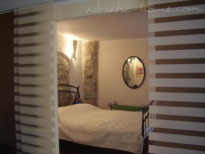 Centre de Krk, villa urbaine. Appartements 4 étoiles, meublés dans un style rustique, avec des équipements modernes, cuisine, climatisation, téléviseur. La villa est située au coeur de la vieille ville et dans une partie calme de la rue, à seulement 70 mètres de la plage. Stationnement à proximité dans un parking privé.