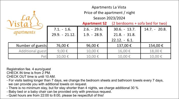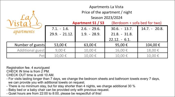 En savoir plus Unités d'hébergementPour toutes demandes de renseignements et réservations, contactez-nous par e-mail. Inscription des invités - 4,00 EUR / par personne. Taxe environnementale - 0,15 EUR personne/jour, les enfants jusqu'à 12 ans ne paient pas de taxe environnementale. Pour les clients séjournant moins de 4 nuits, le prix de l'hébergement est majoré de 30 %. Le nettoyage final de l'appartement et la taxe de séjour sont inclus dans le prix de l'hébergement.