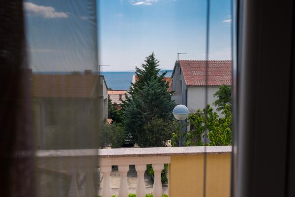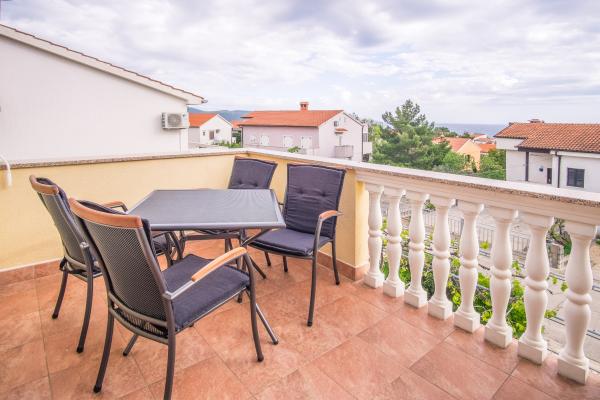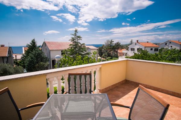 Grand appartement joliment meublé dans un quartier calme de Krk. Grand lit, terrasse avec vue mer, grande TV, adapté aux animaux...