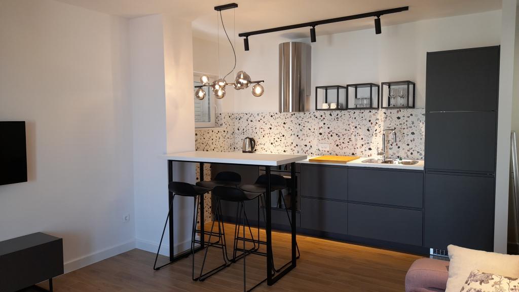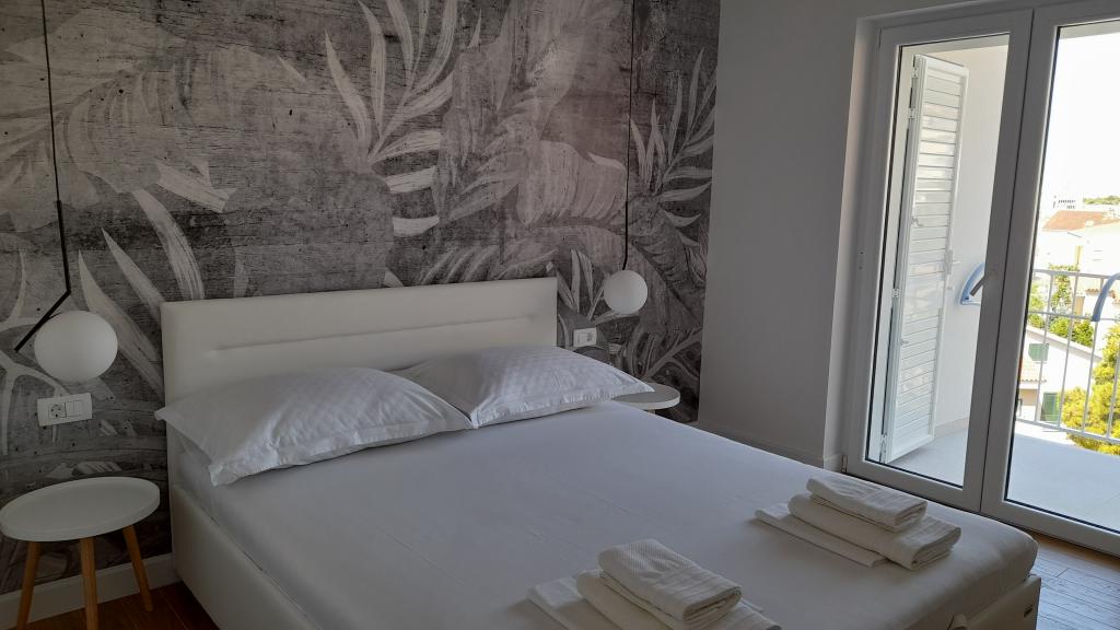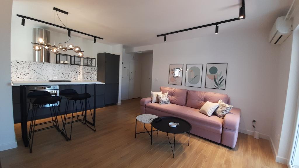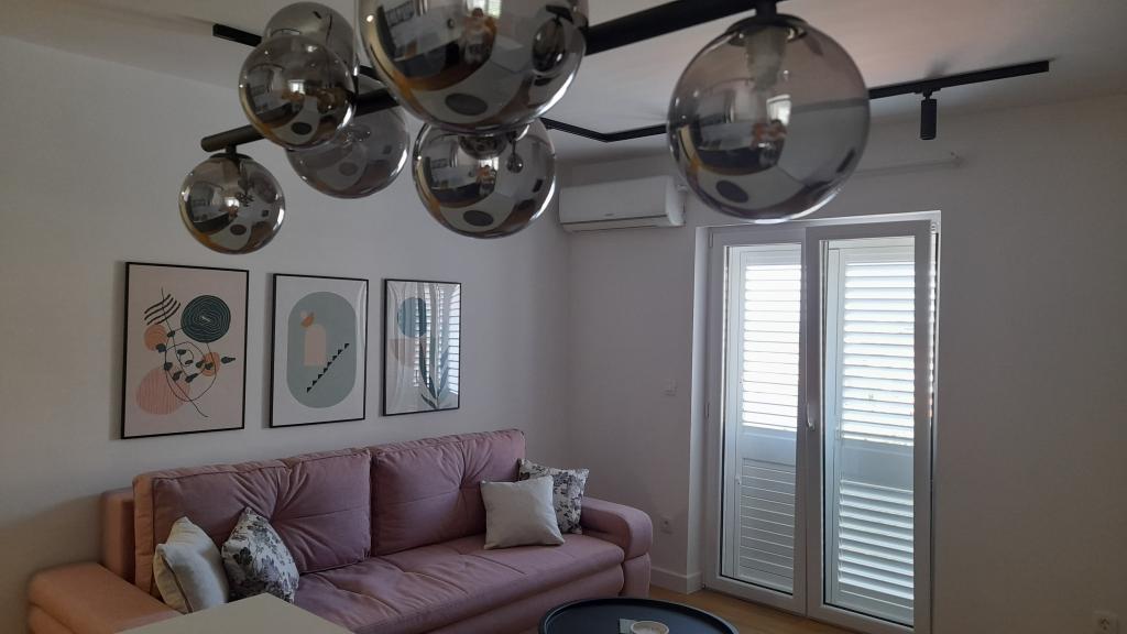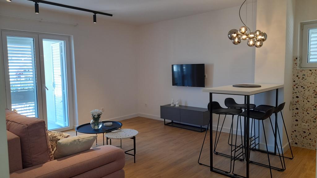 Appartement moderne au troisième étage d'un immeuble avec une terrasse donnant sur la mer et la montagne Biokovo. L'appartement se compose d'une cuisine, d'un séjour avec coin repas, d'une chambre et d'une salle de bain.
