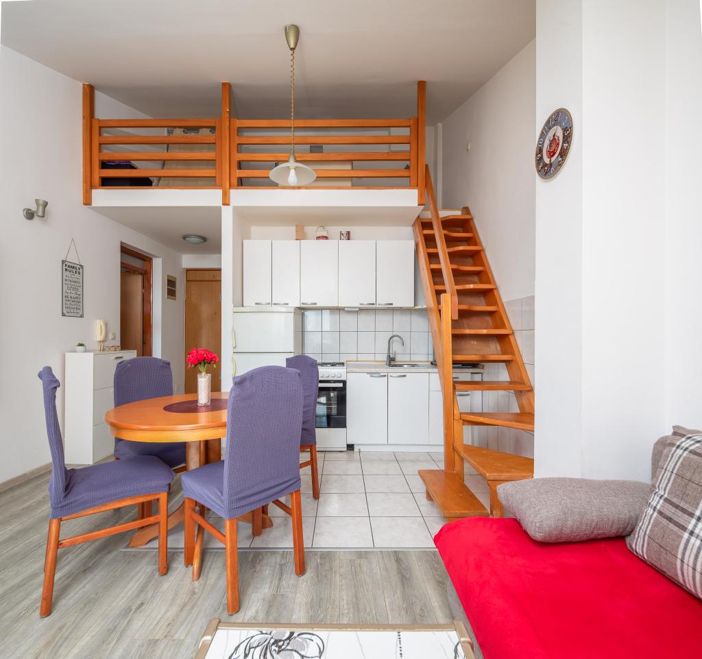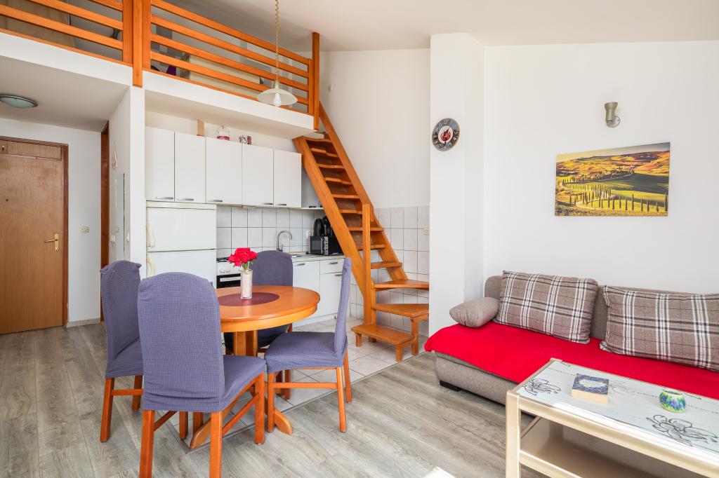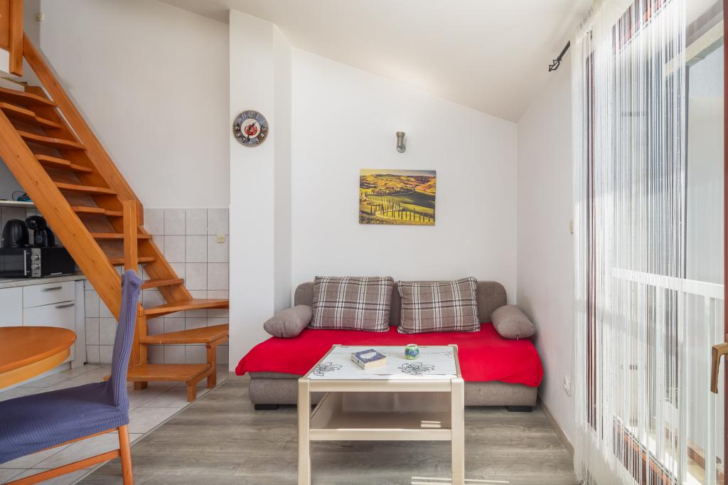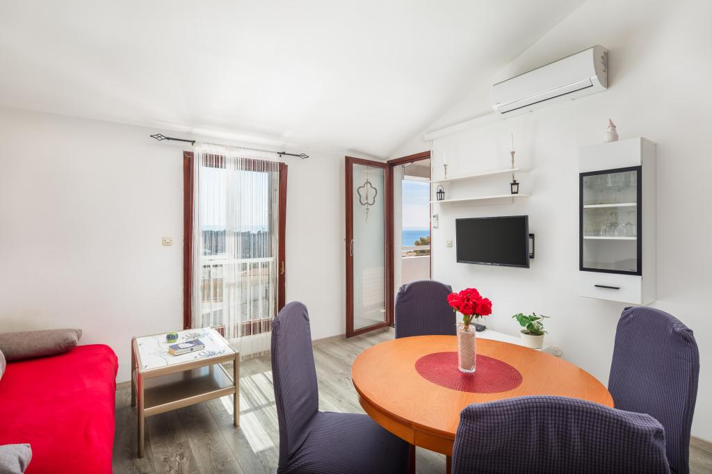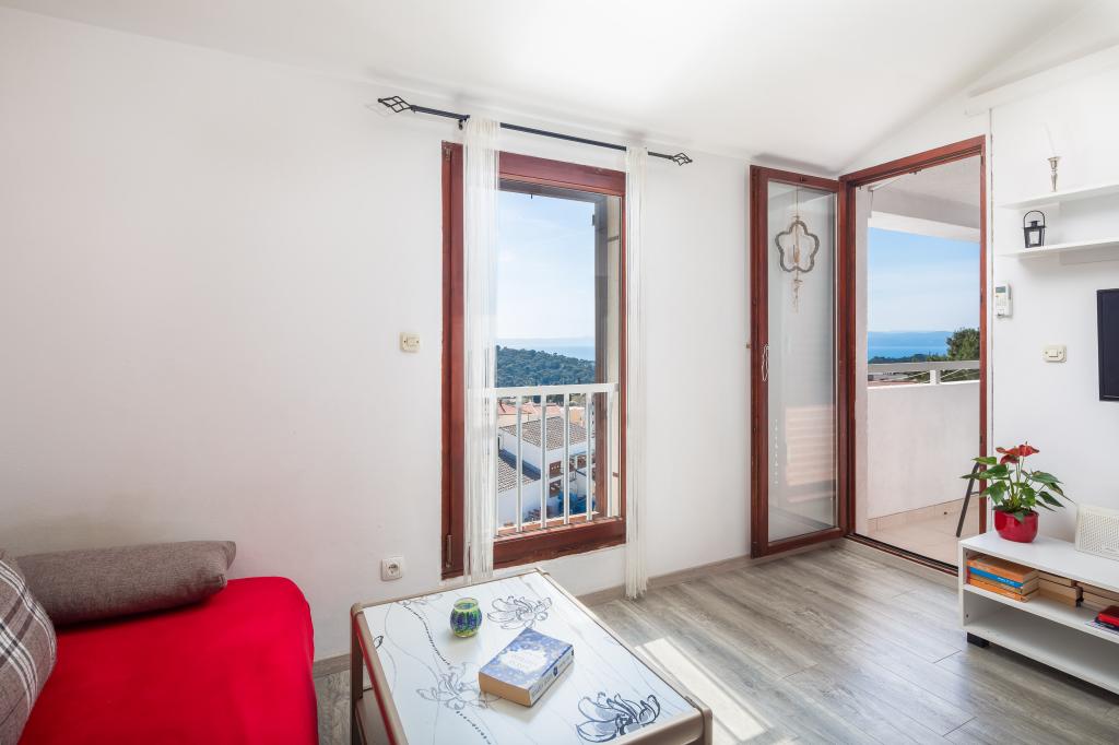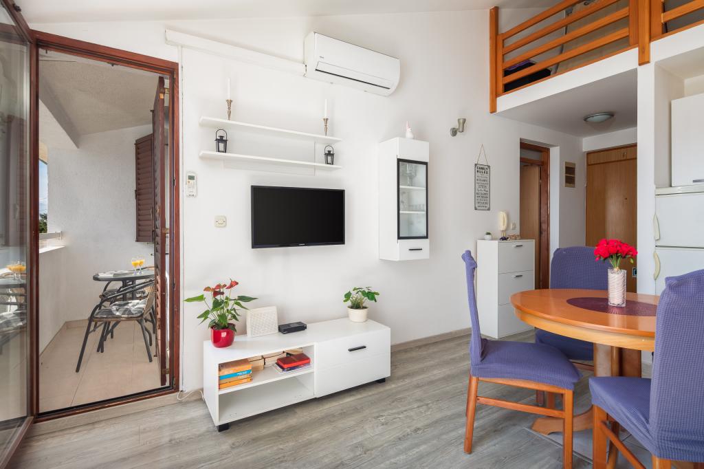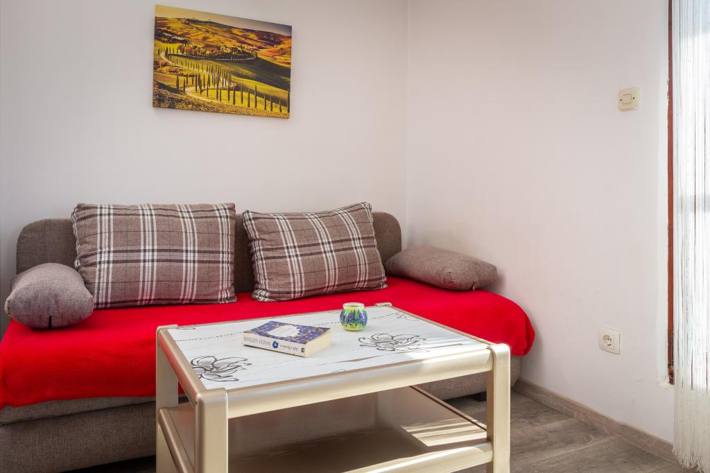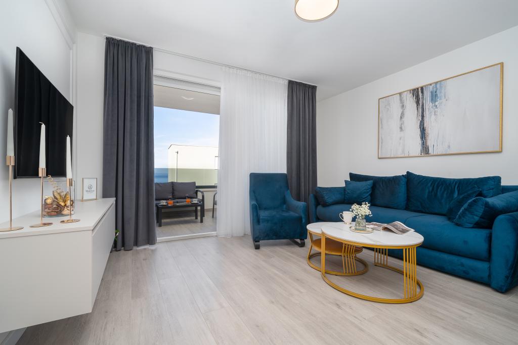Cet appartement comprend une chambre, un salon avec un canapé-lit, une cuisine et un balcon avec vue sur la mer. Il y a un parking gratuit devant le bâtiment.