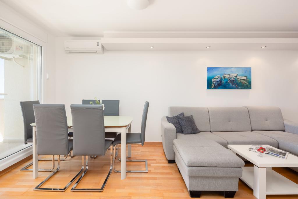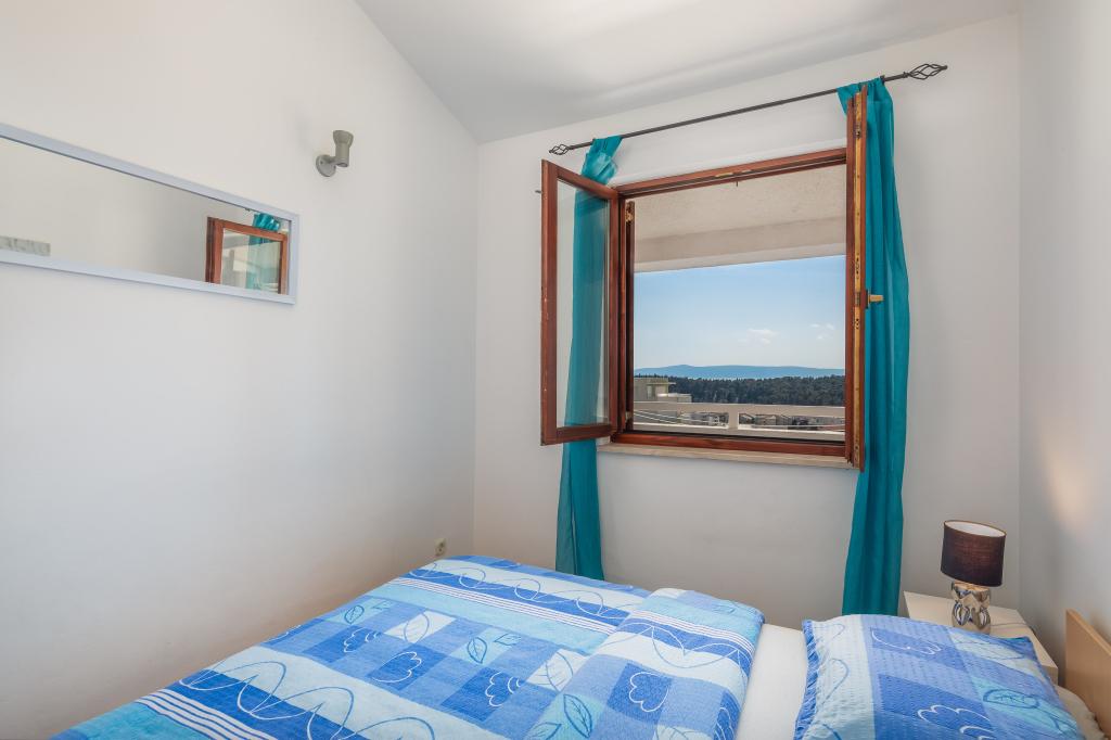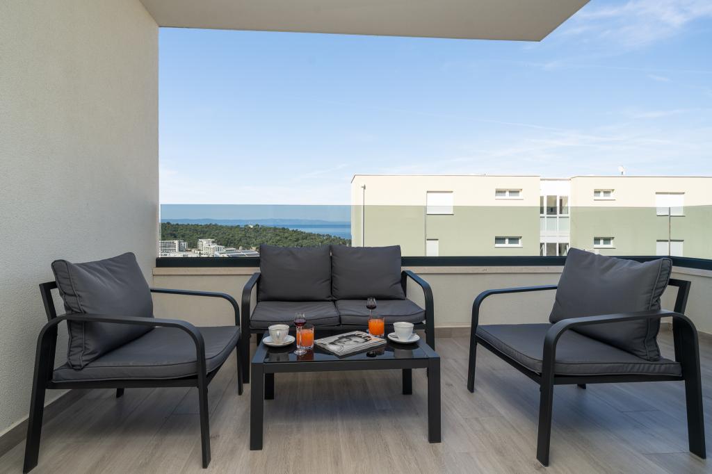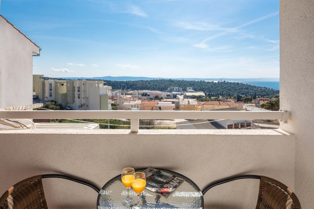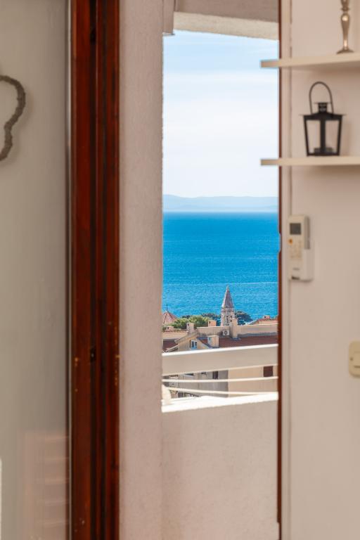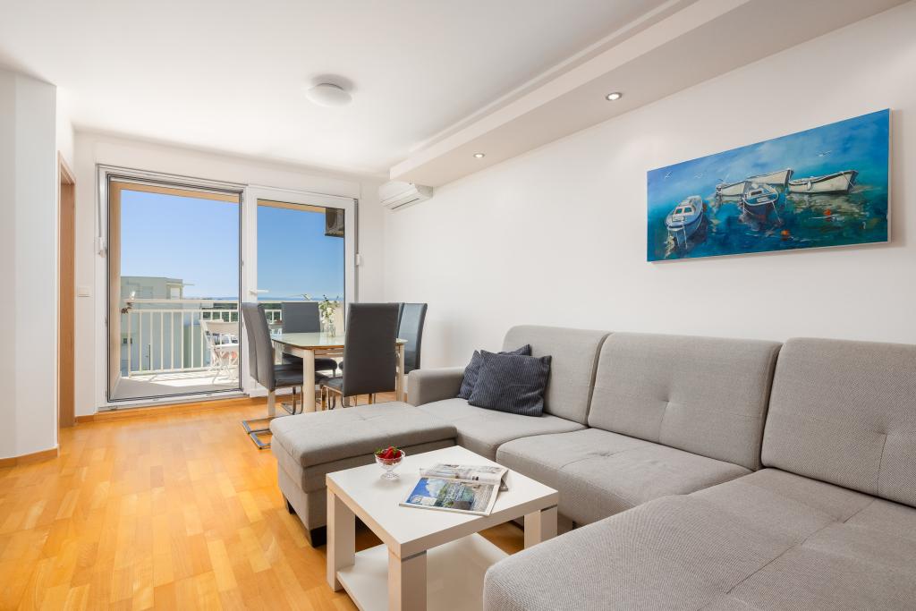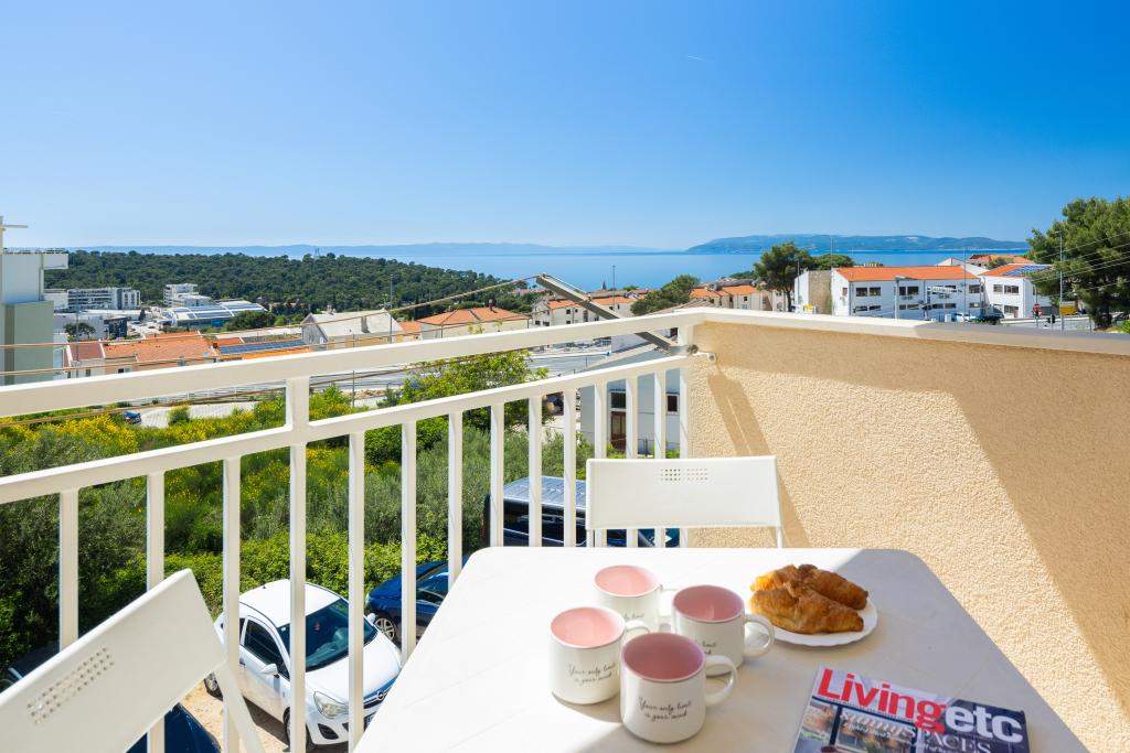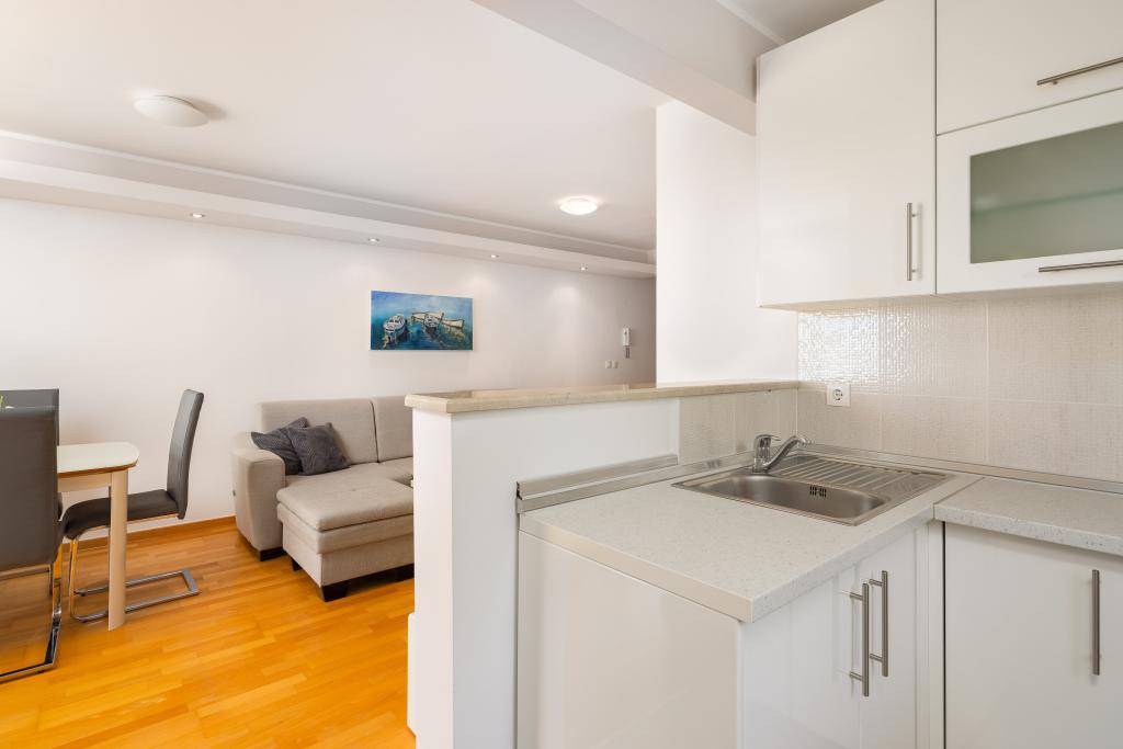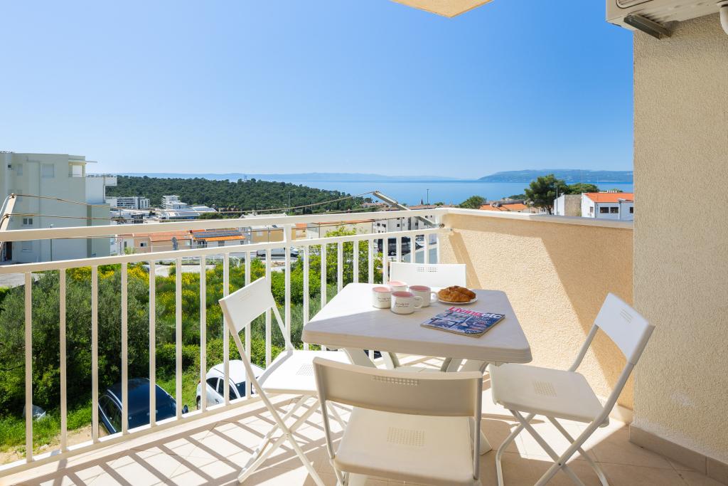 Cet appartement comprend une chambre, un salon avec un canapé-lit, une cuisine et un balcon avec vue sur la mer. Il y a un parking gratuit devant le bâtiment.