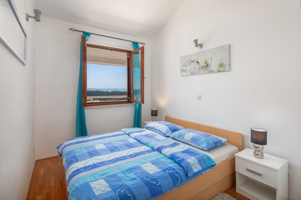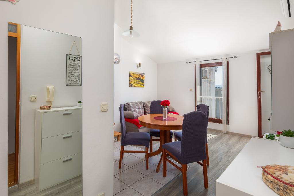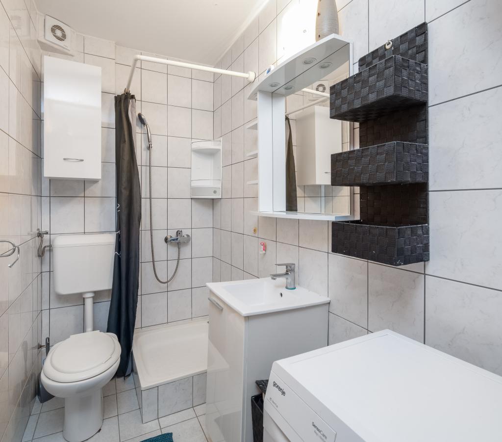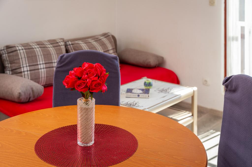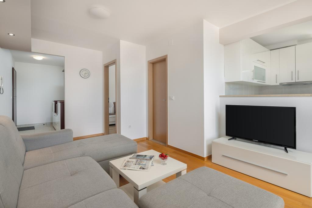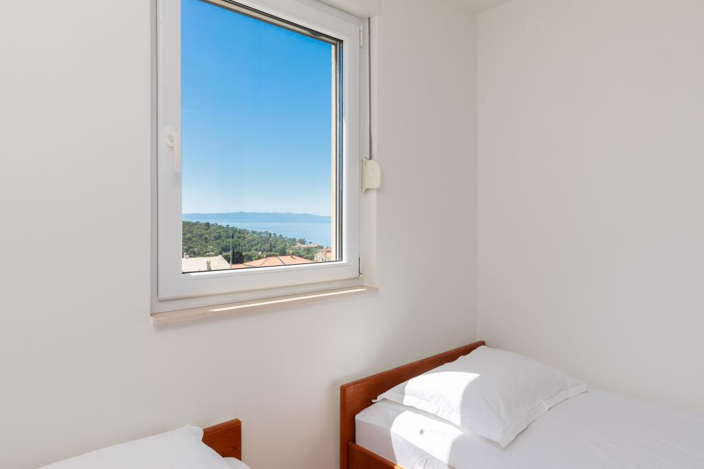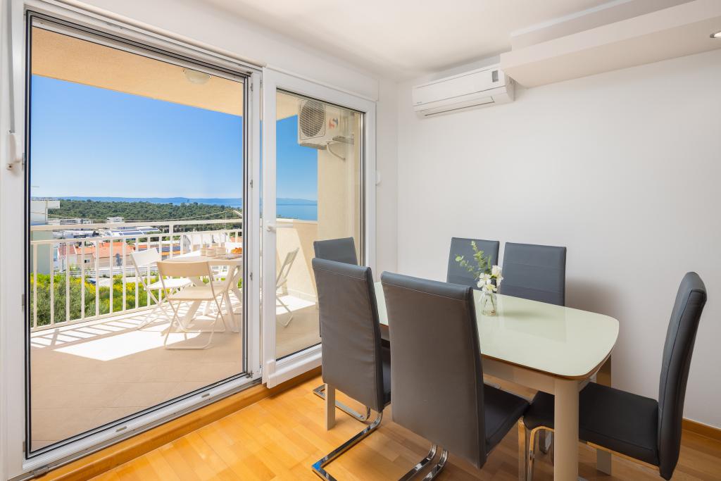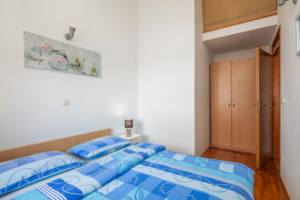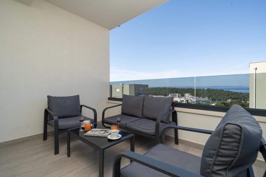Cet appartement comprend une chambre, un salon avec un canapé-lit, une cuisine et un balcon avec vue sur la mer. Il y a un parking gratuit devant le bâtiment.