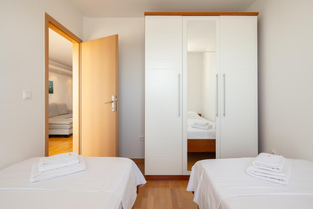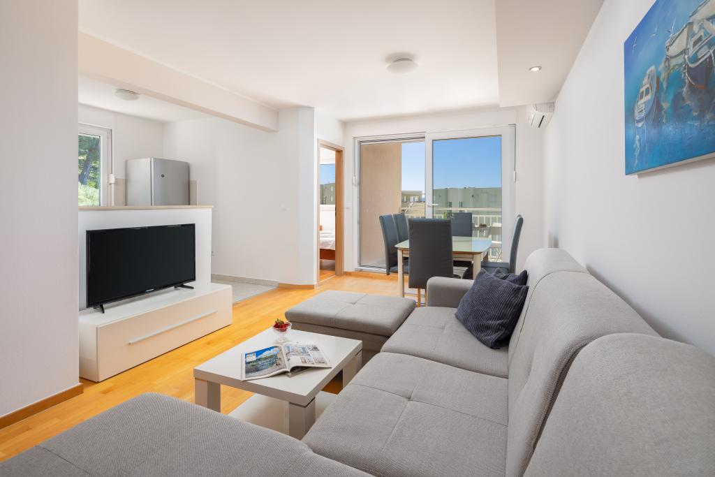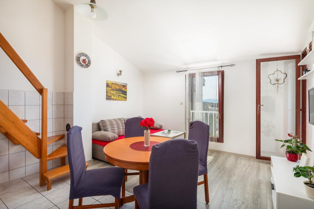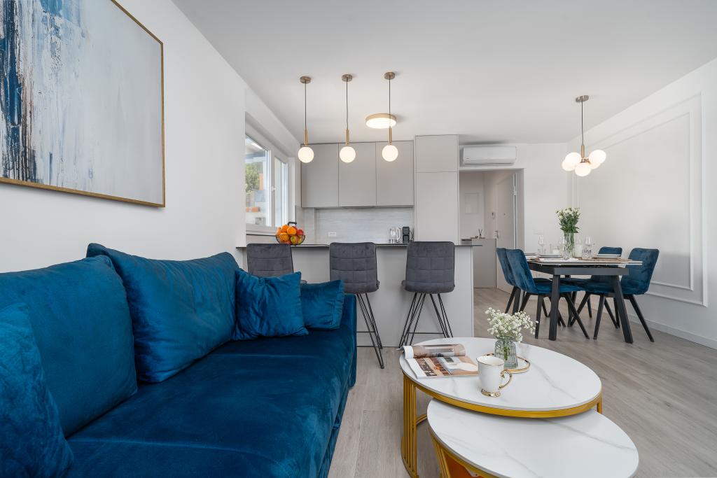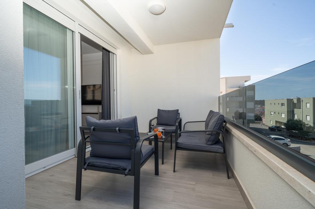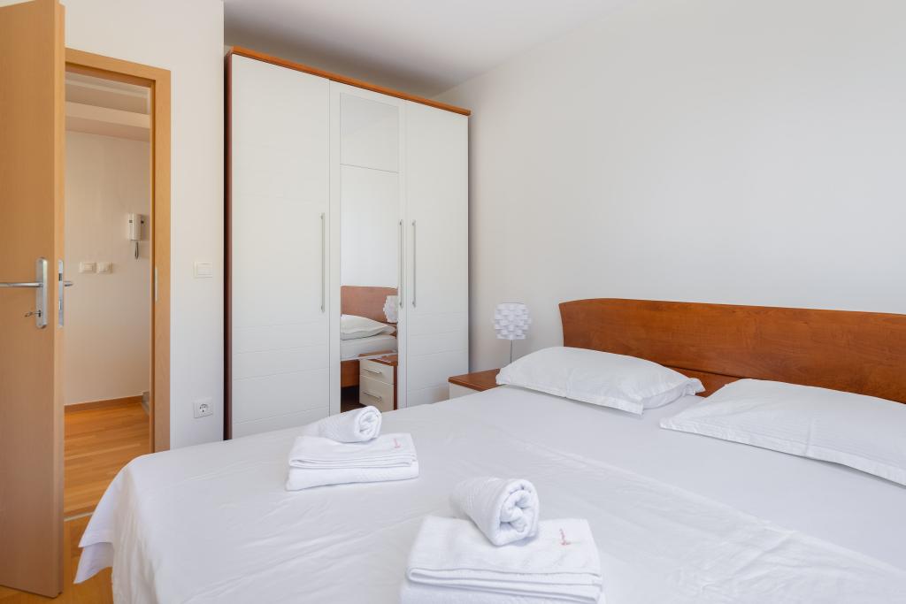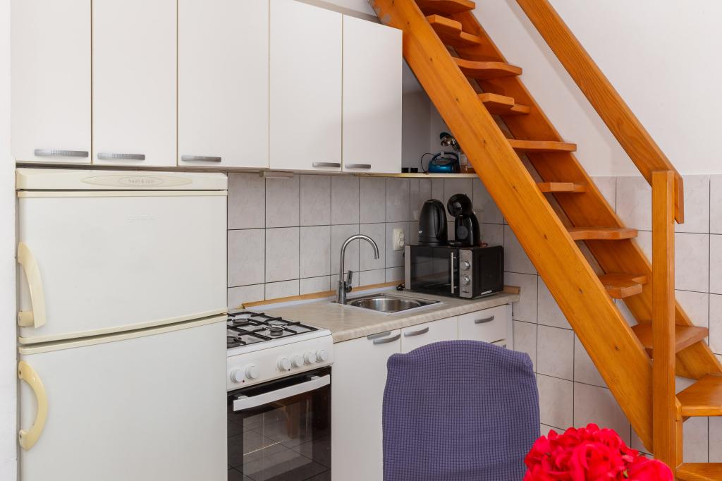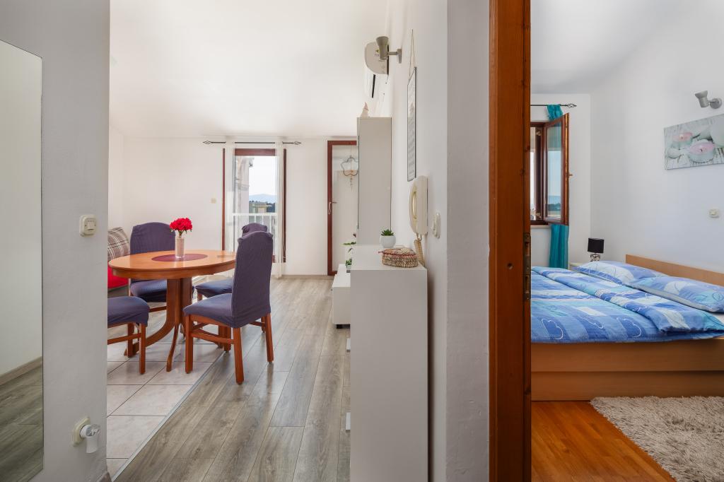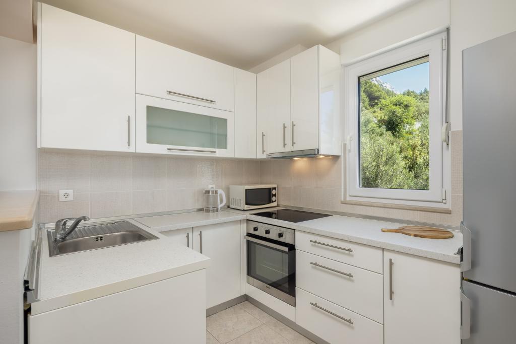 Cet appartement comprend une chambre, un salon avec un canapé-lit, une cuisine et un balcon avec vue sur la mer. Il y a un parking gratuit devant le bâtiment.